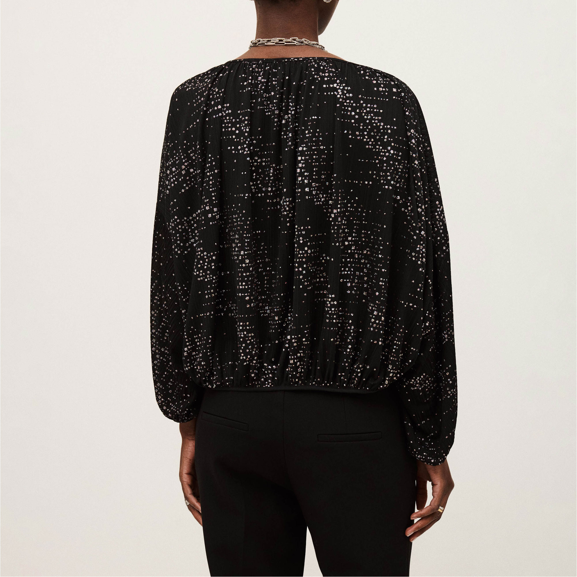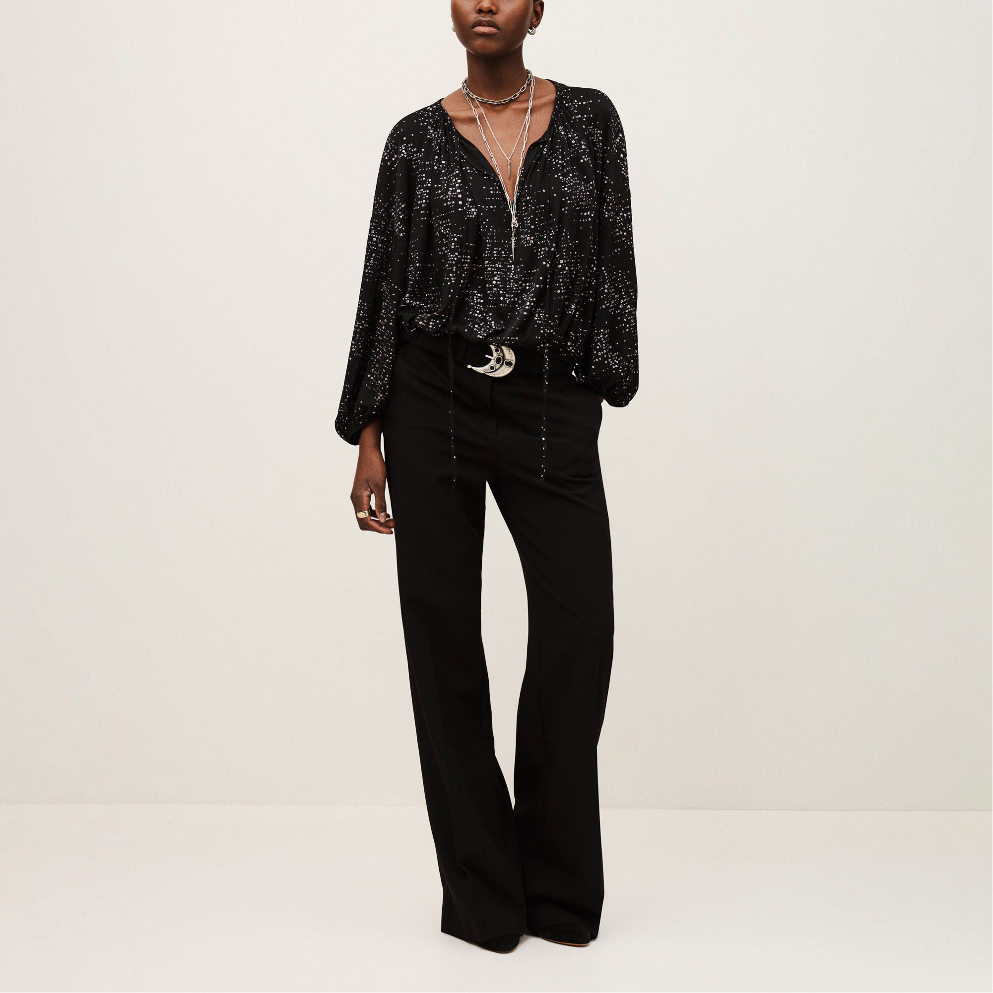 - Sequinned detail, lightly striped jersey, gathered waist, slightly tightened at the bottom, batwing style sleeves, henley neck with tie