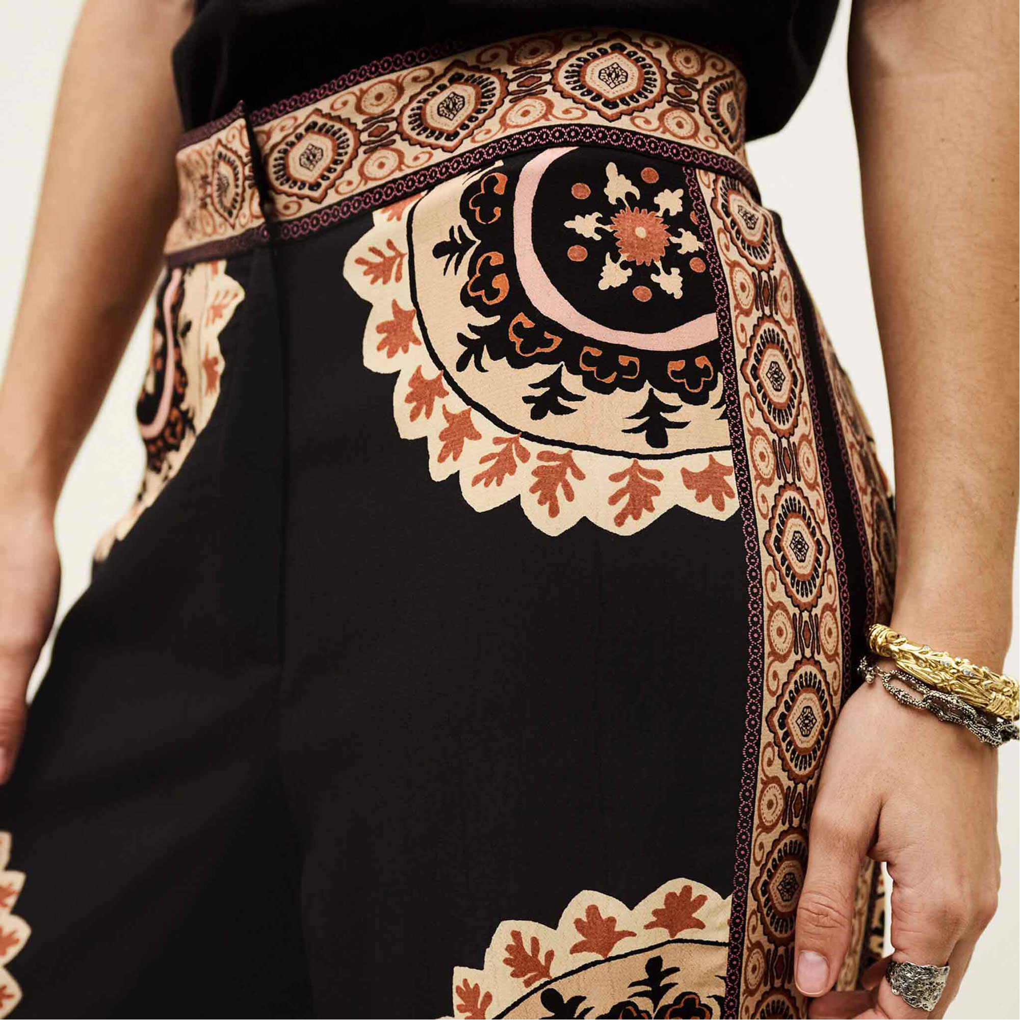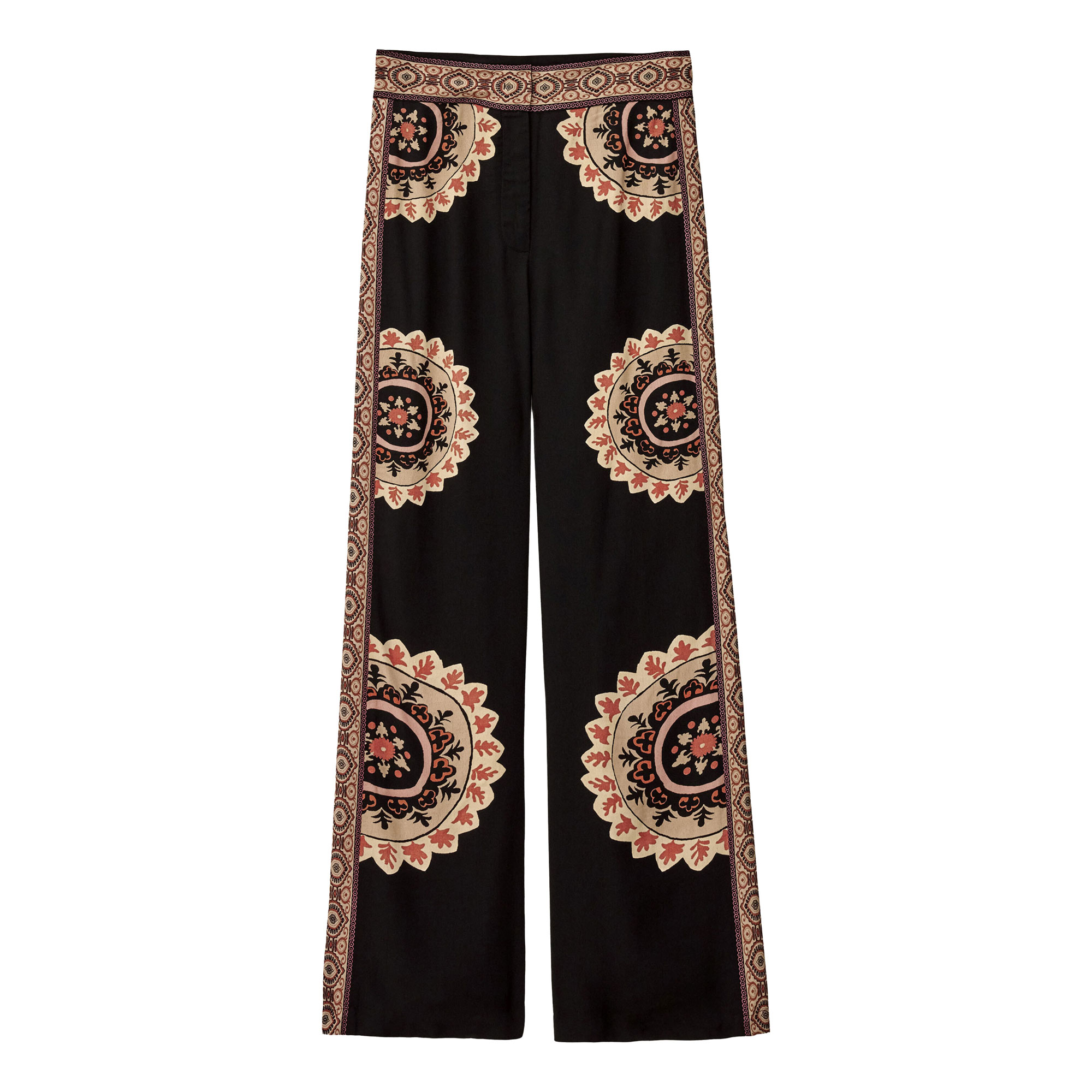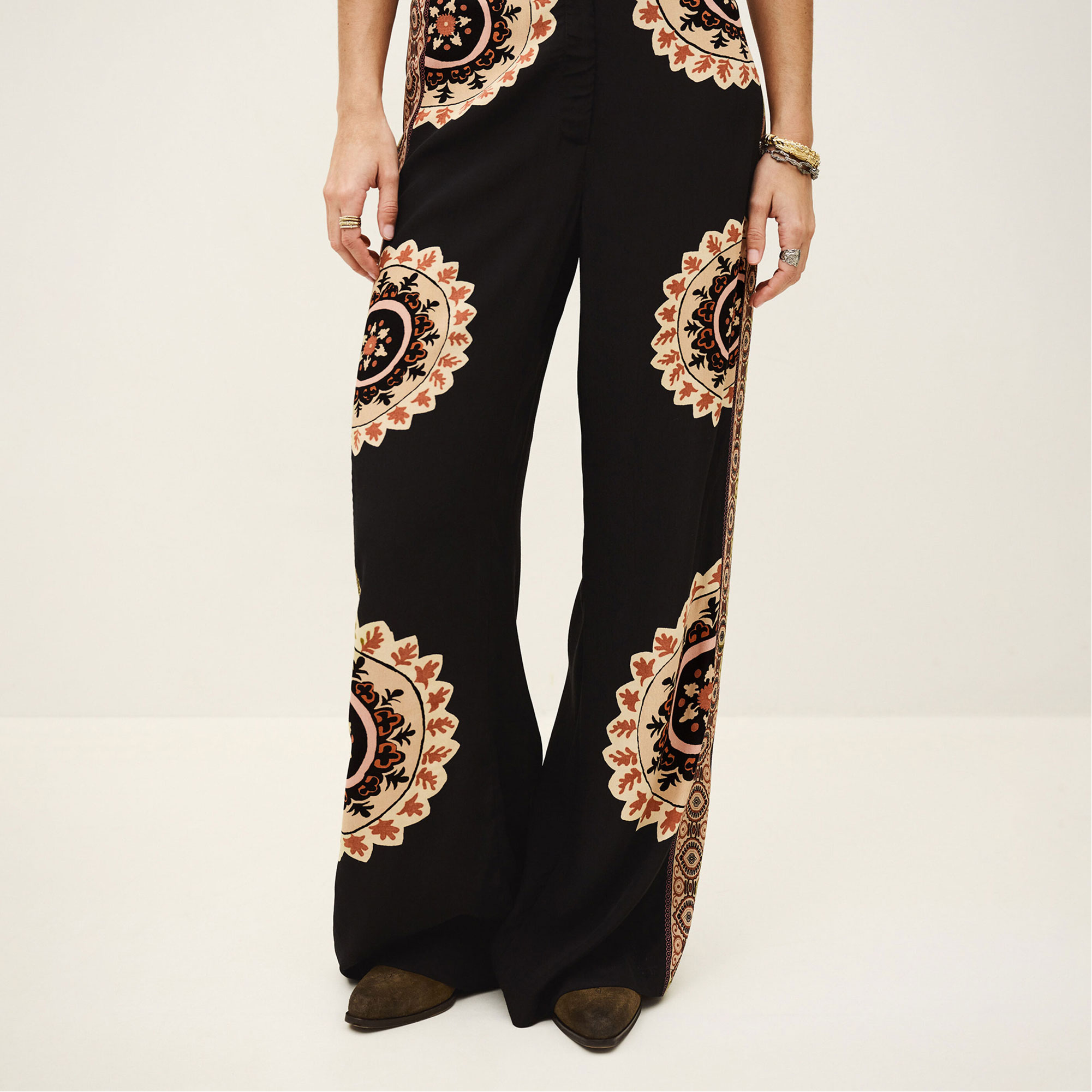 • Fitted waist, flared leg silhouette, rosette patch detailing, patterned strip accents, bohemian style