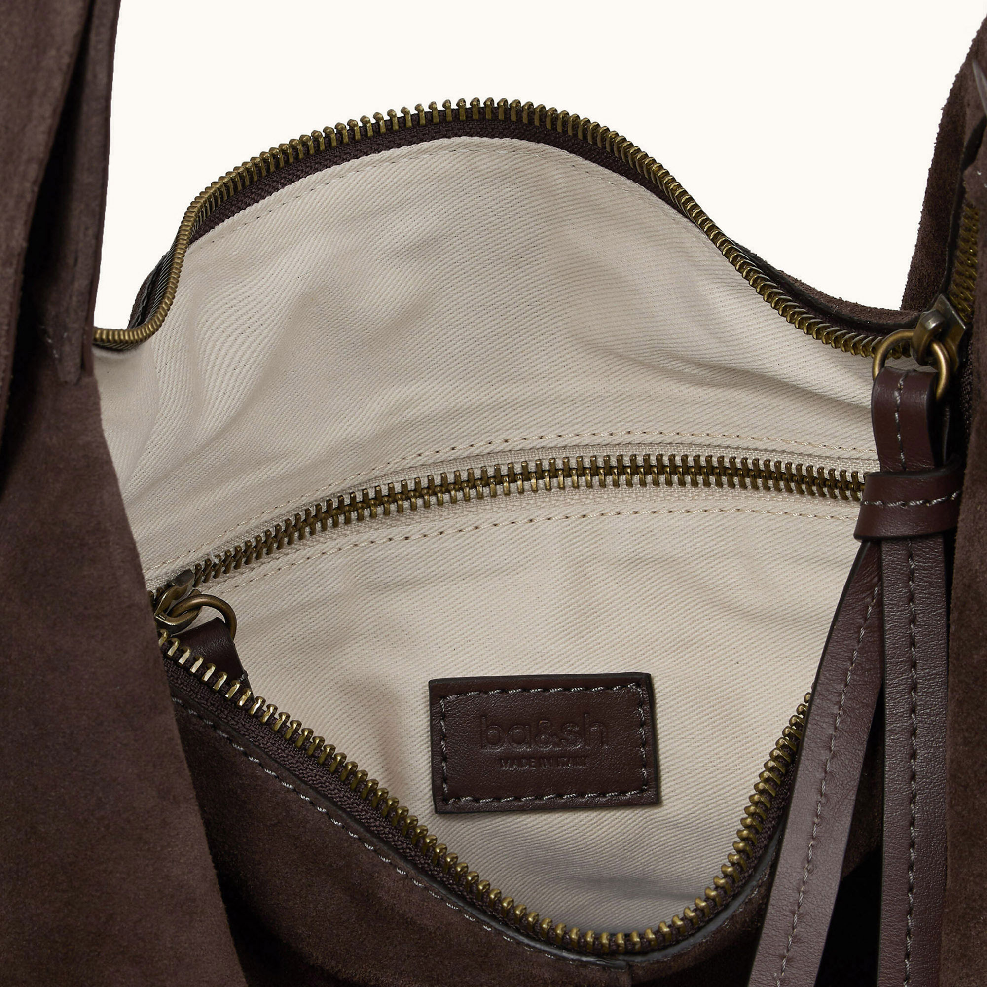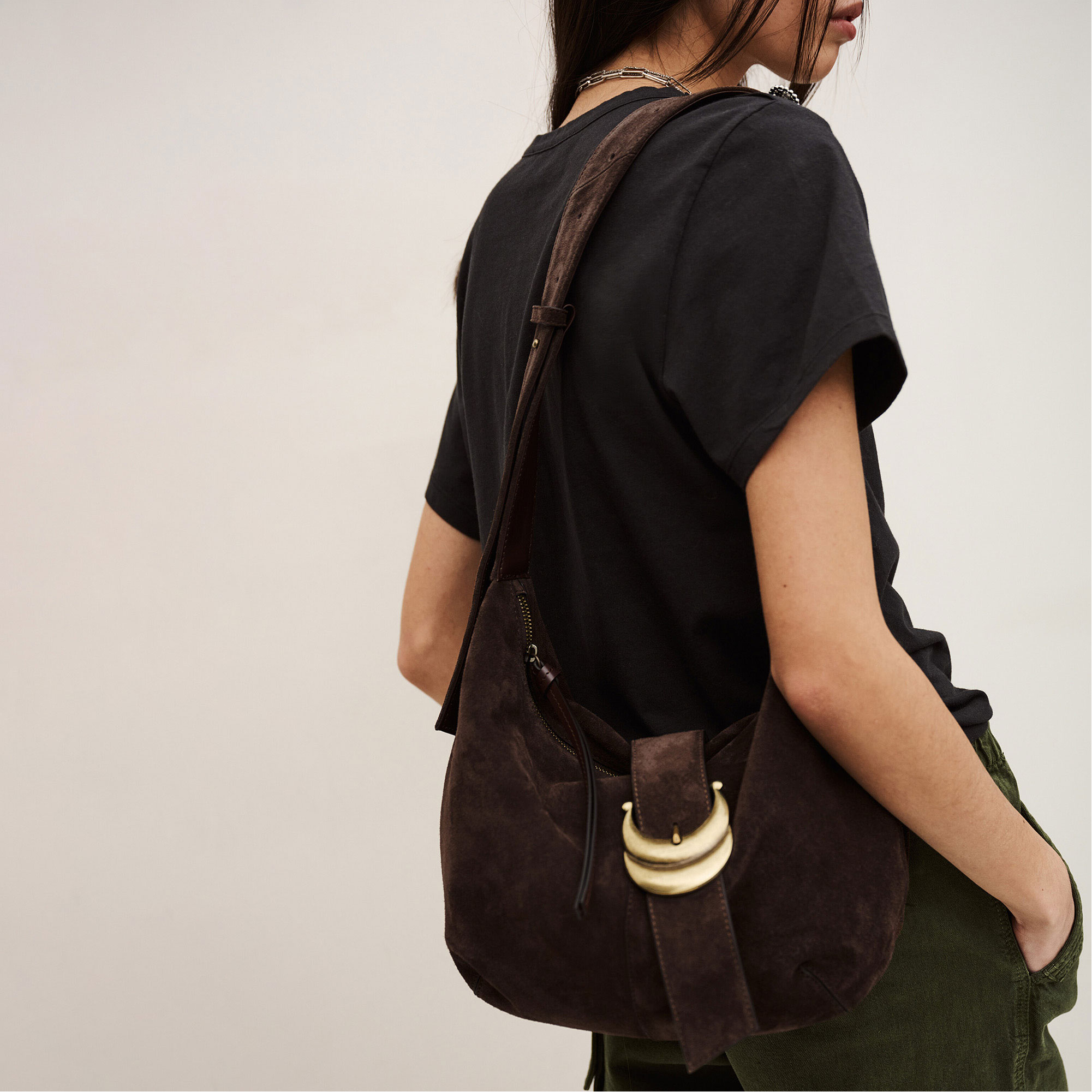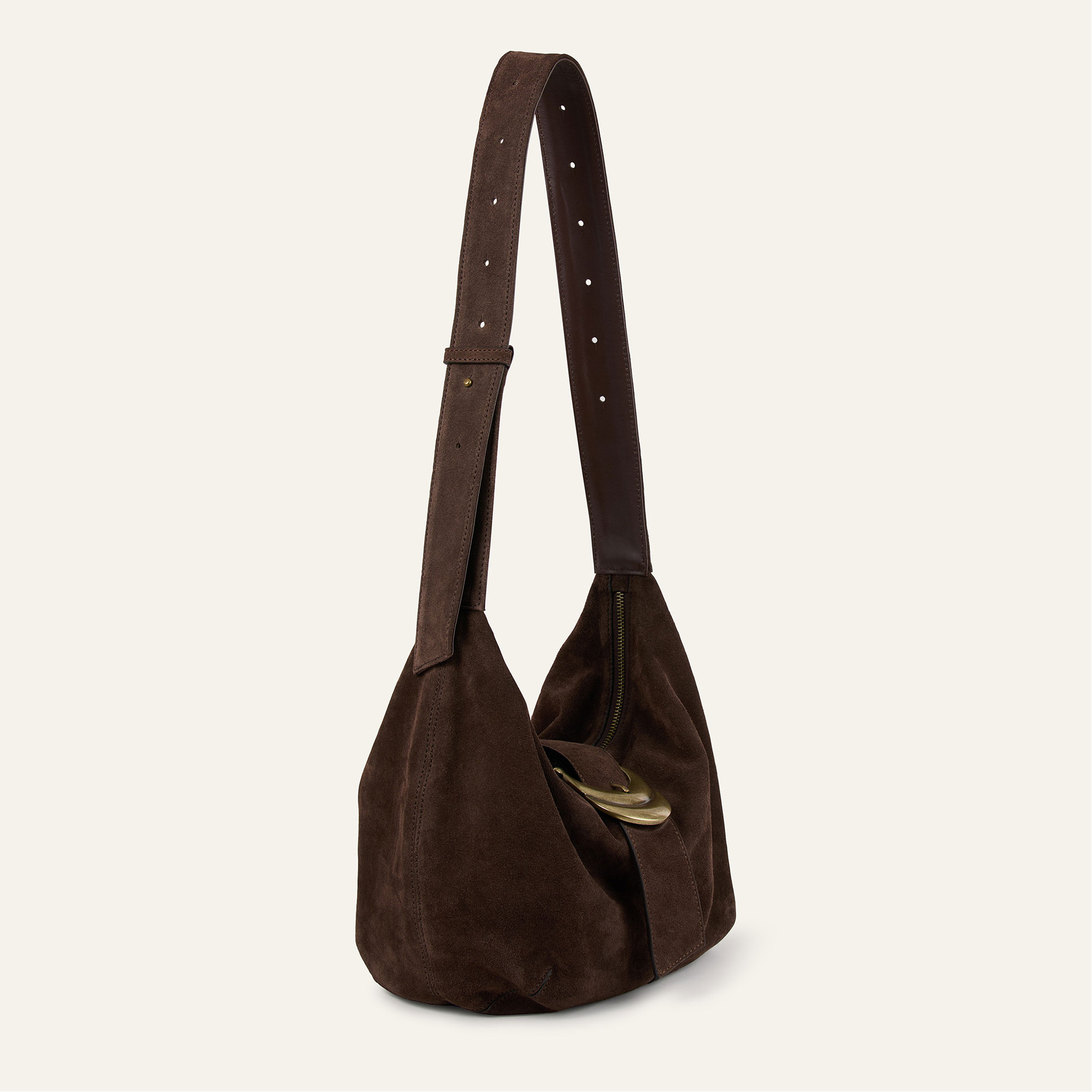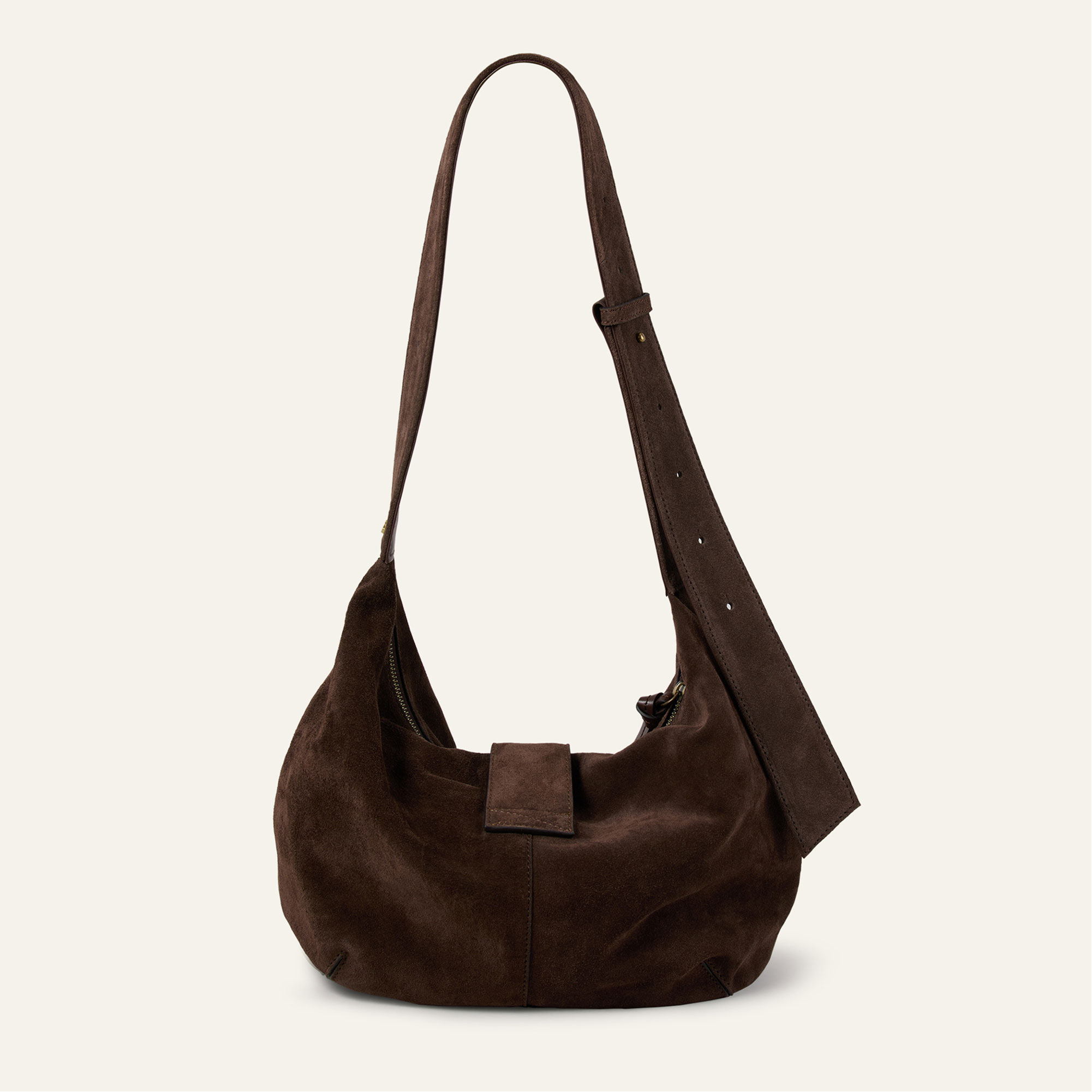 - Hobo style, half-moon silhouette, adjustable handle with metal rivets, signature double buckles, suede finish, soft design, leather flap, top zip fastening, leather pull tabs