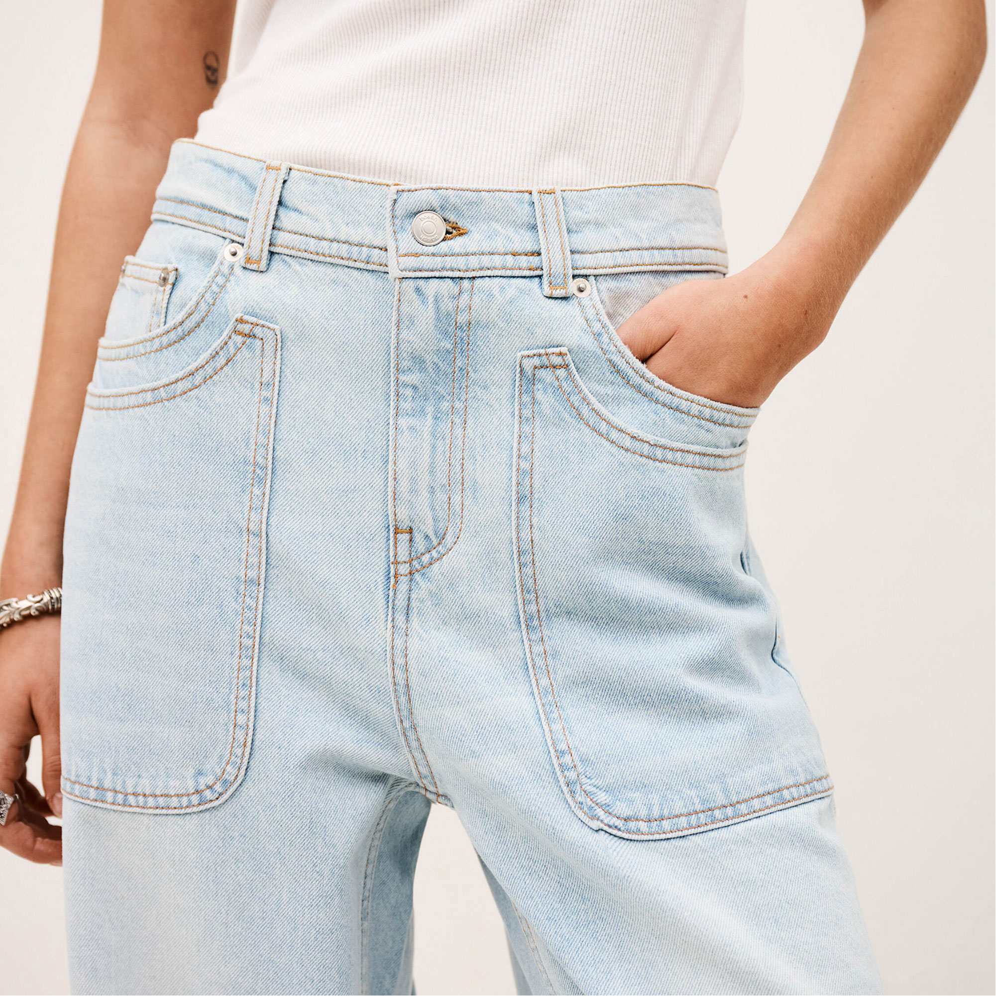 - Cargo-style, double front pockets, large patch pockets, rear patch pockets, zip fly fastening, belt loops