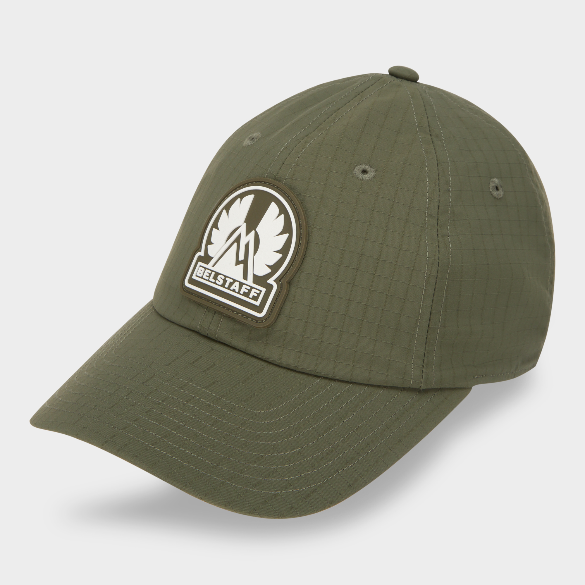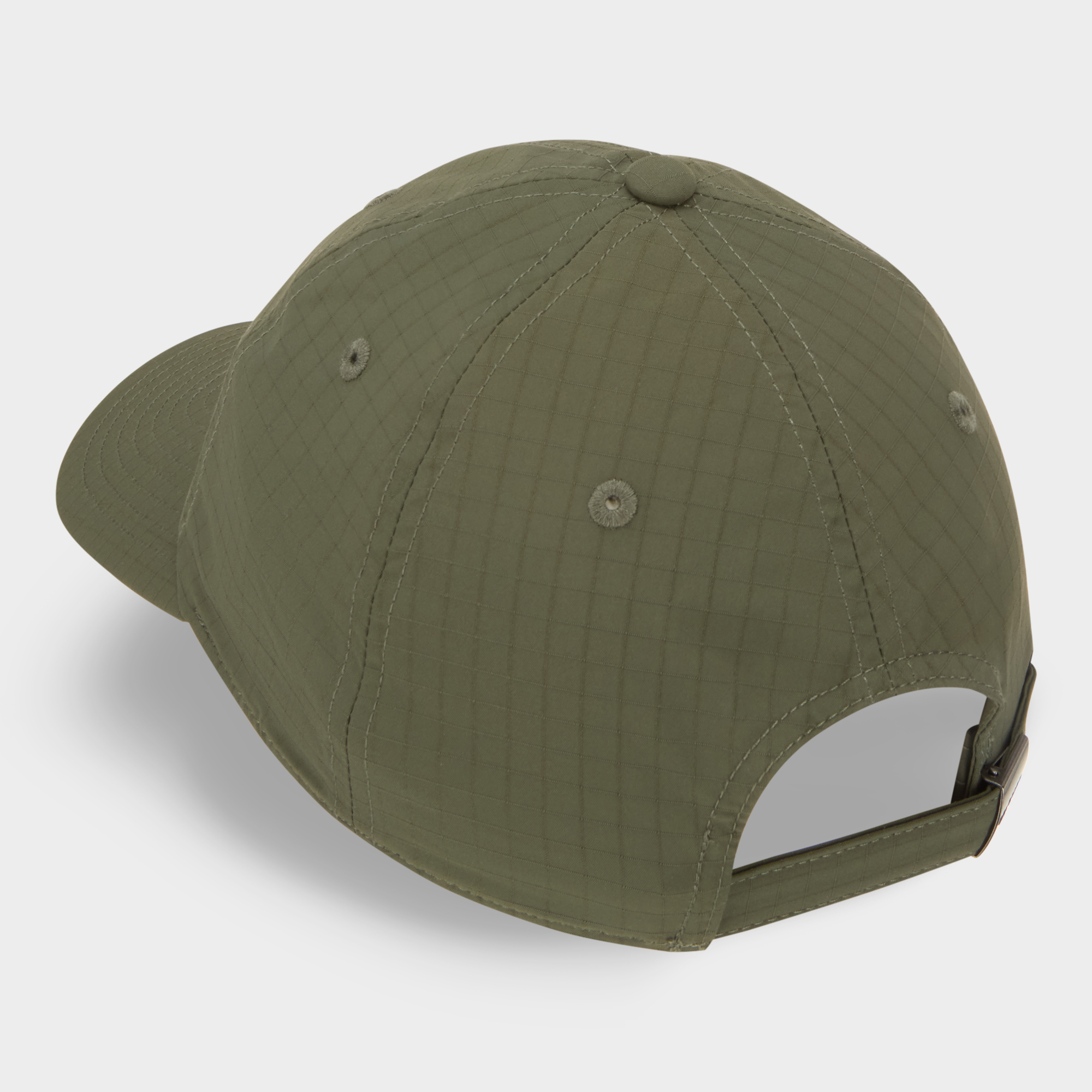 - Curved visor, six-panel construction, embroidered eyelets, tonal stitching, silicone logo badge, adjustable fastening, compact ripstop fabric, tightly woven finish, lightweight