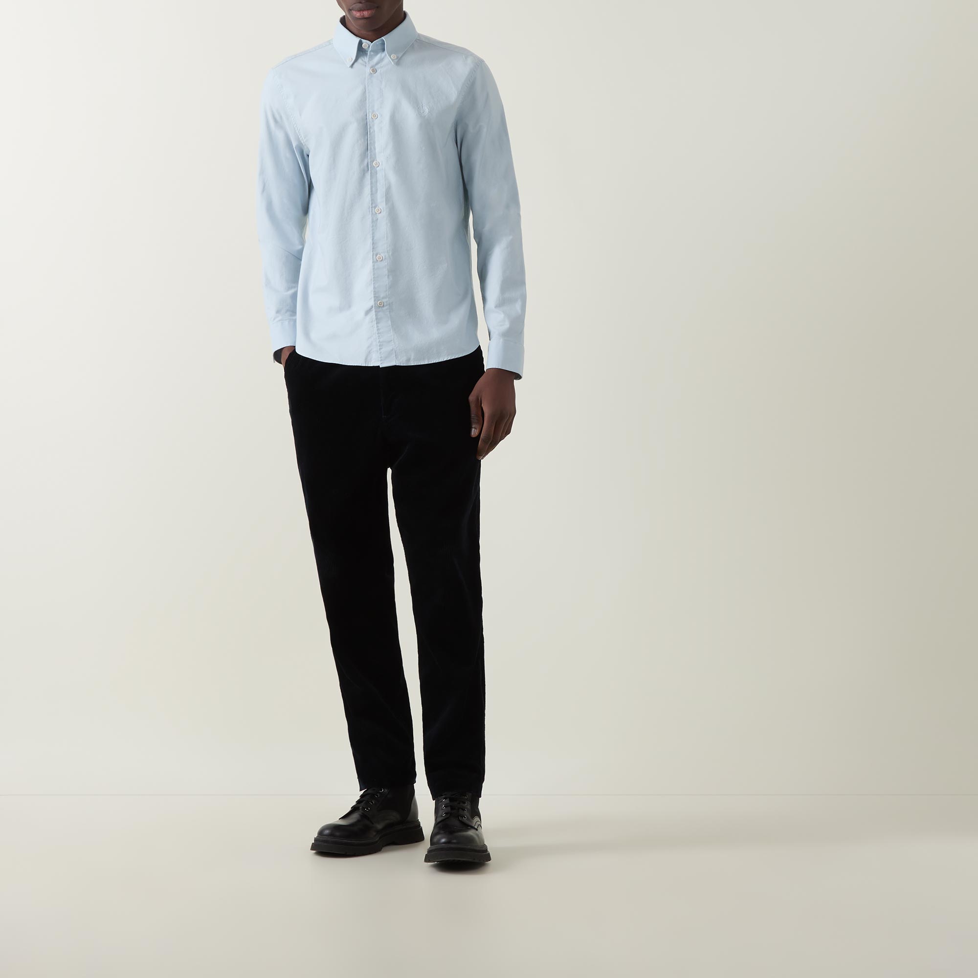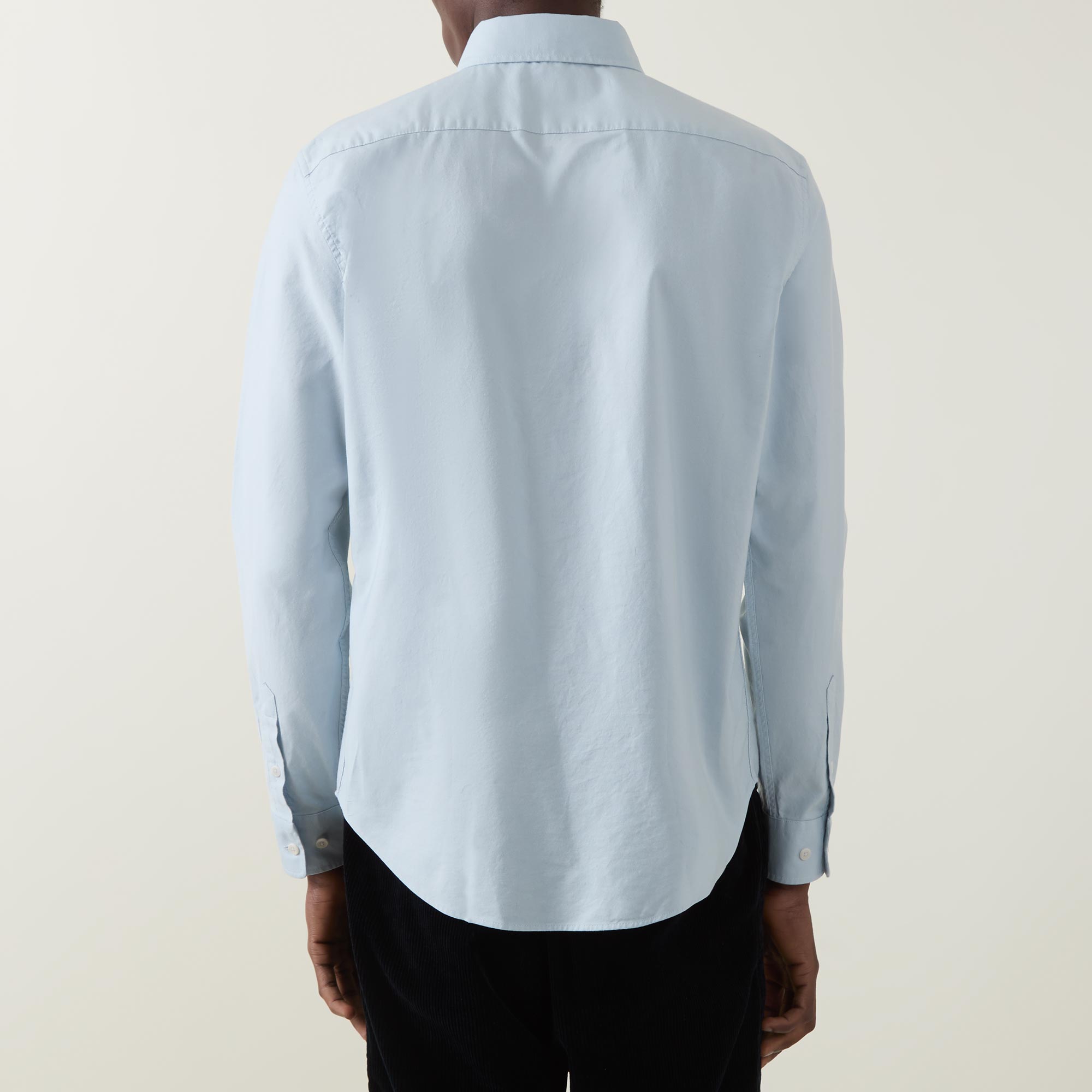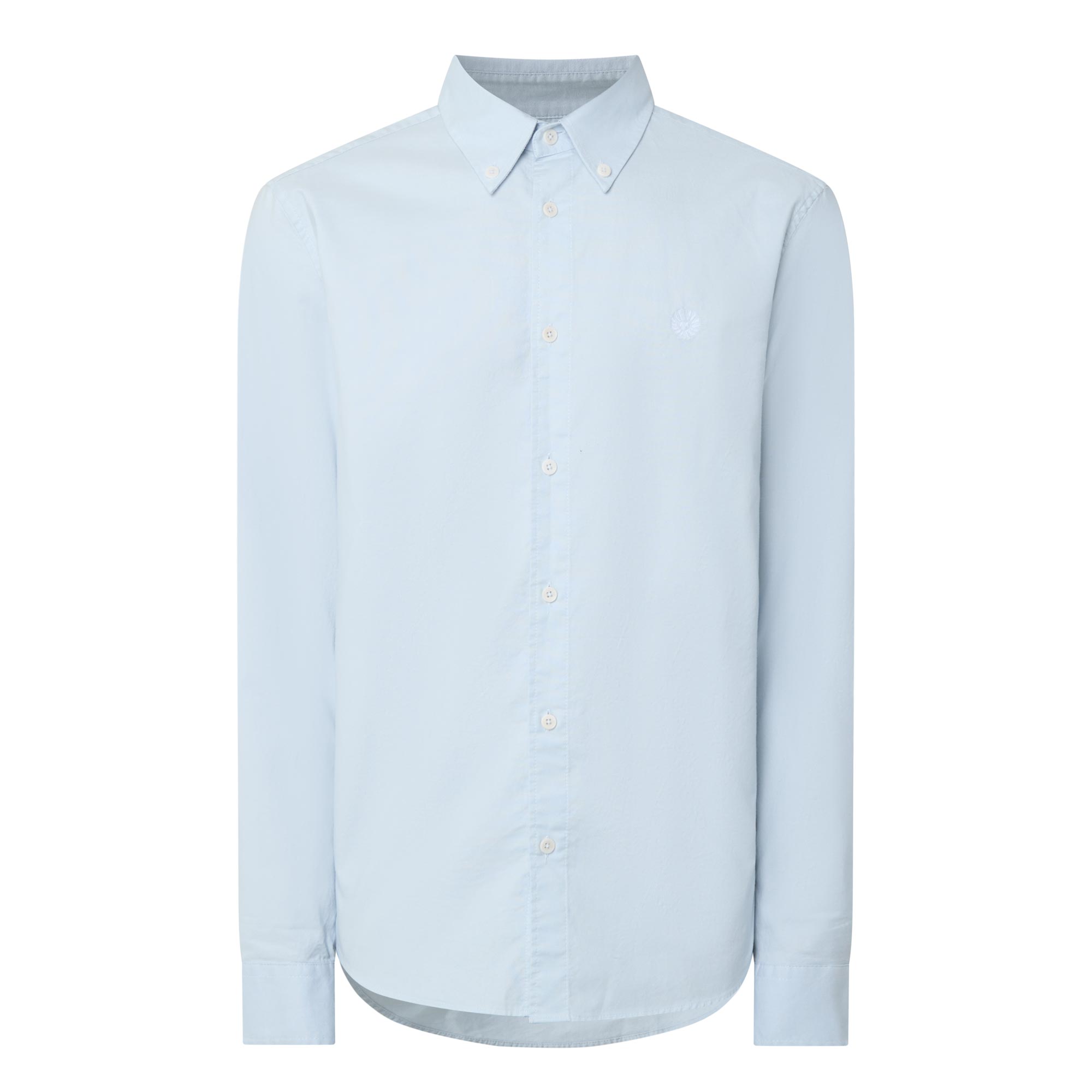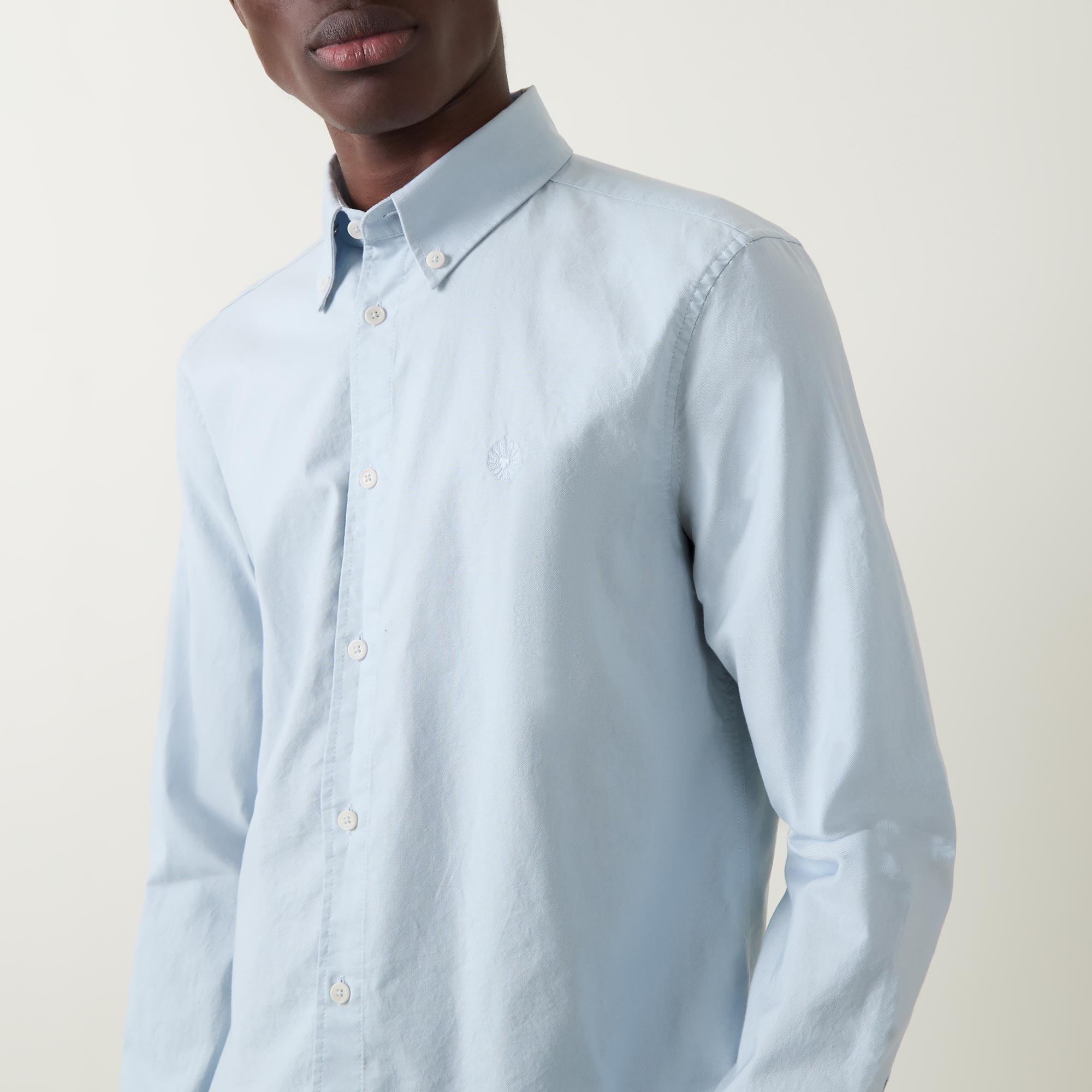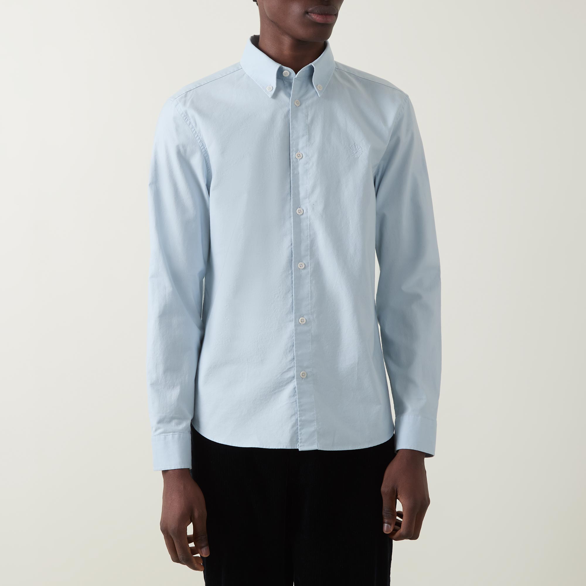 - Button-down collar, long sleeves, curved hemline, button fastenings, tonal logo detail
