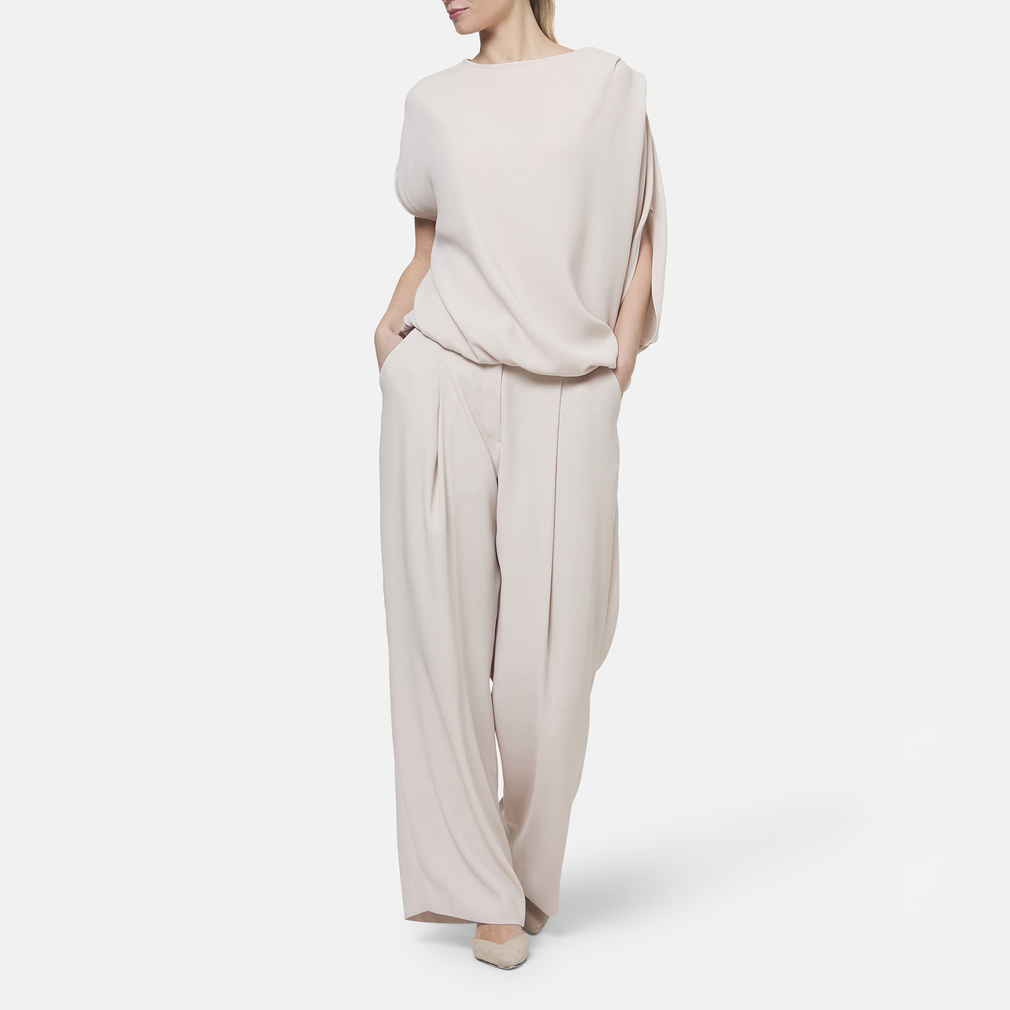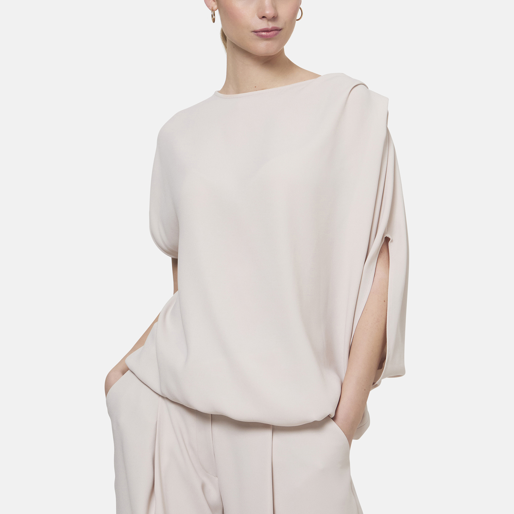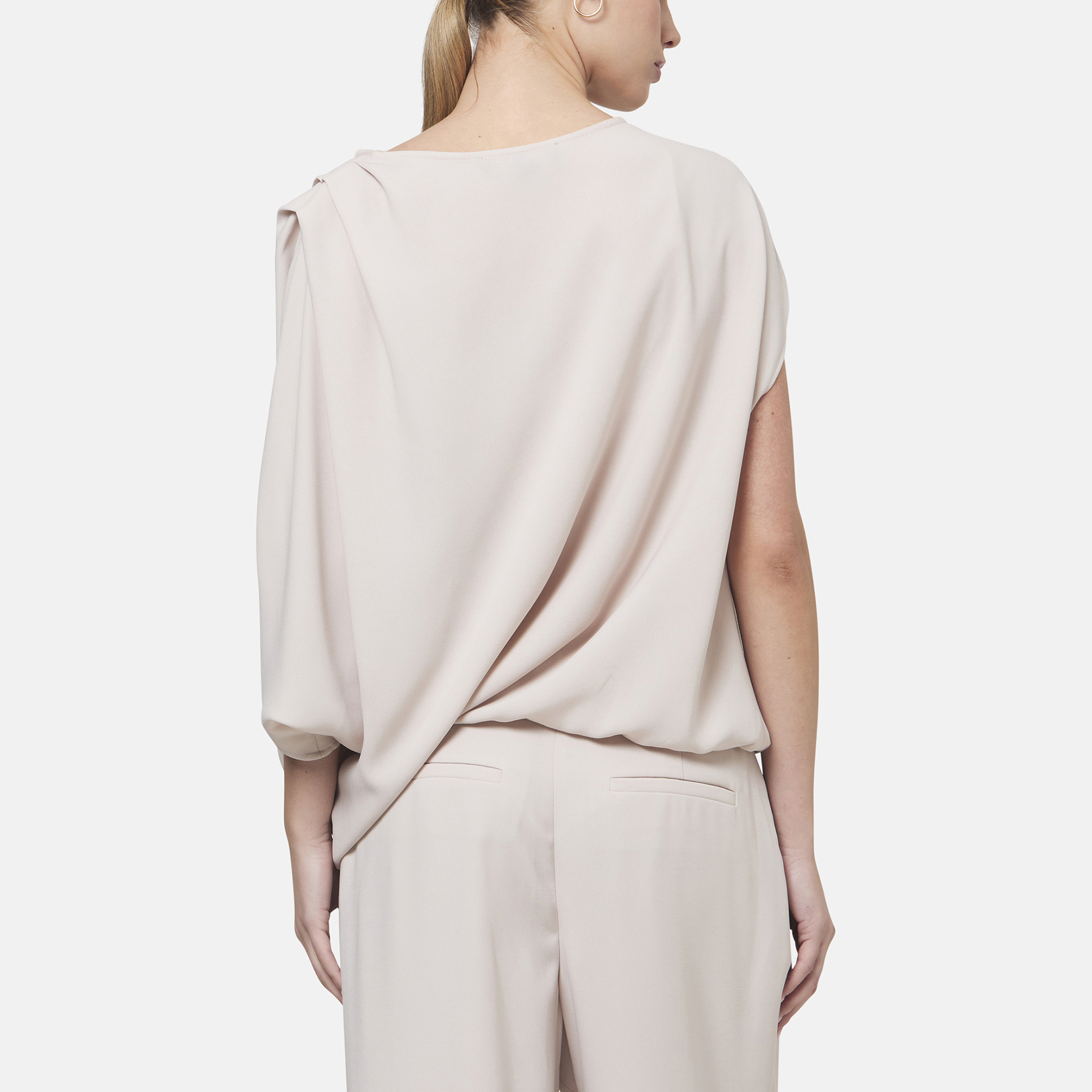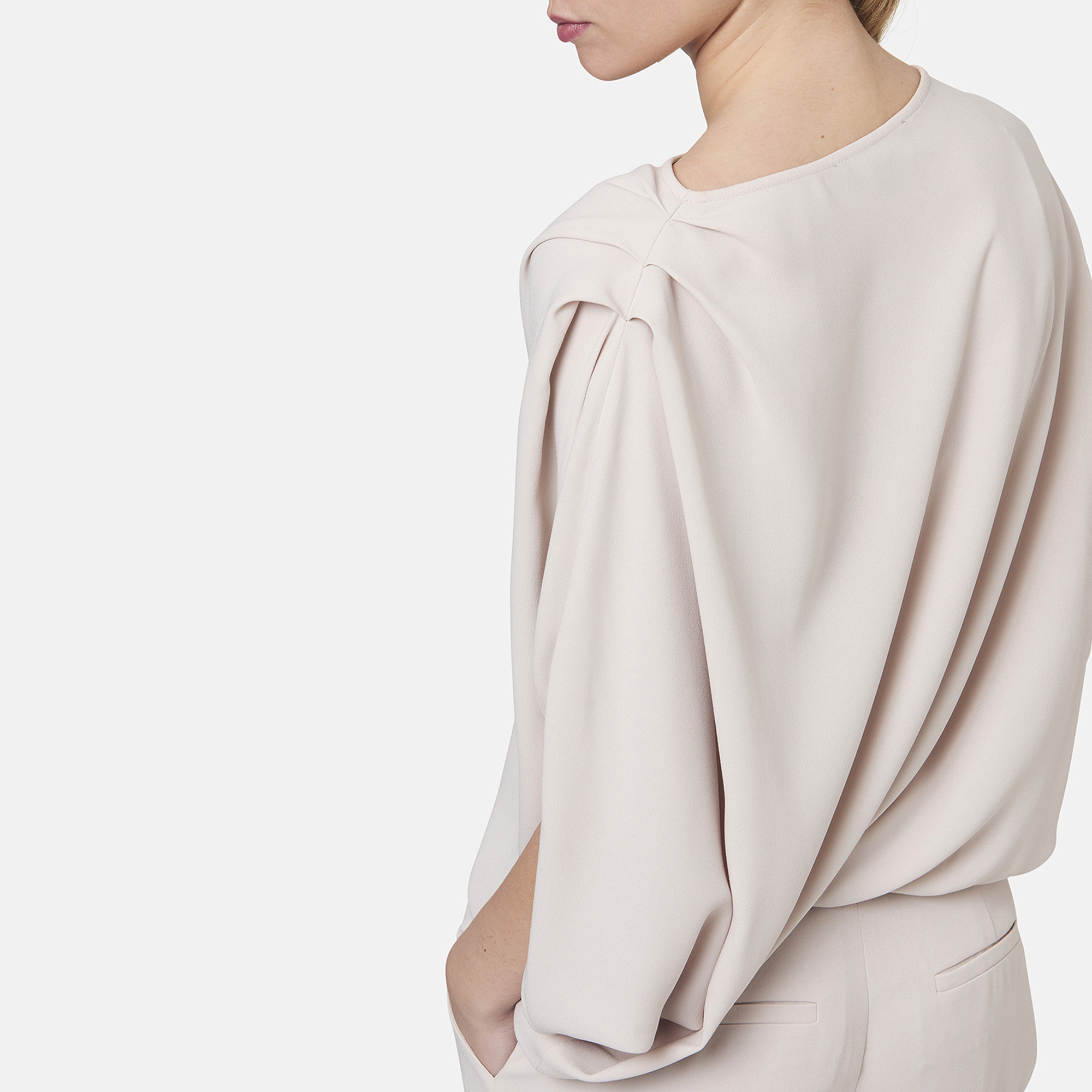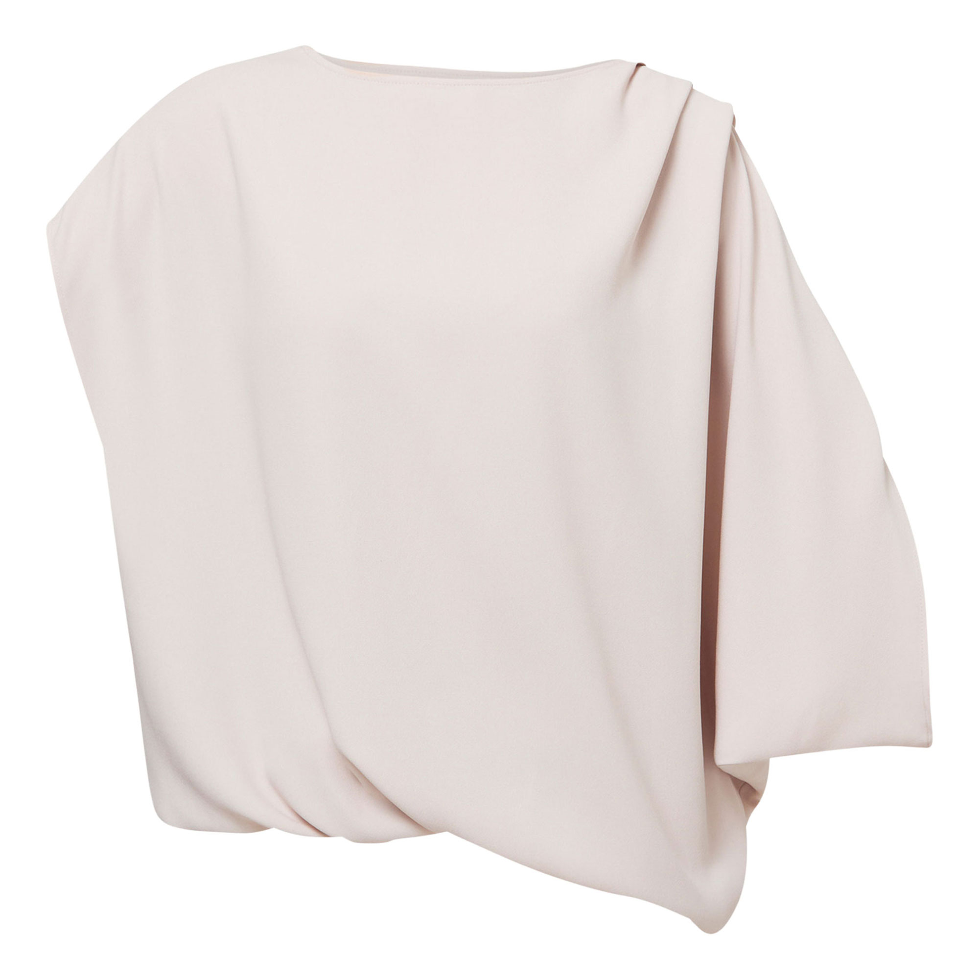 • Asymmetric draped silhouette, crepe fabric, sculptural batwing sleeves, soft bateau neckline, pleated shoulder detail, elasticated hem for a neat blouse shape