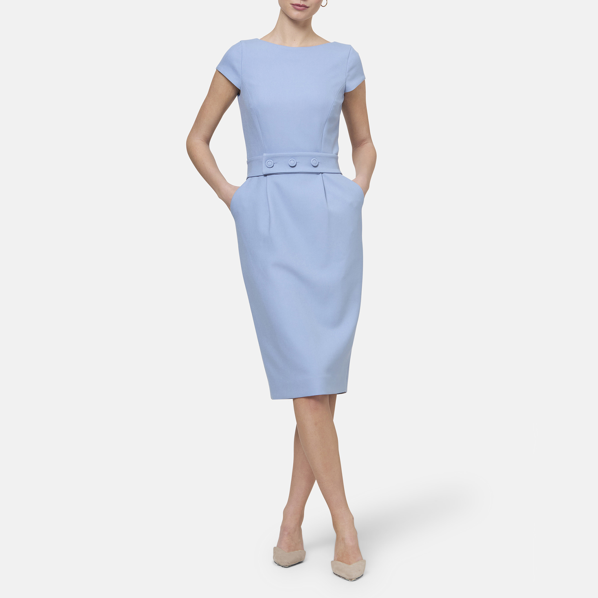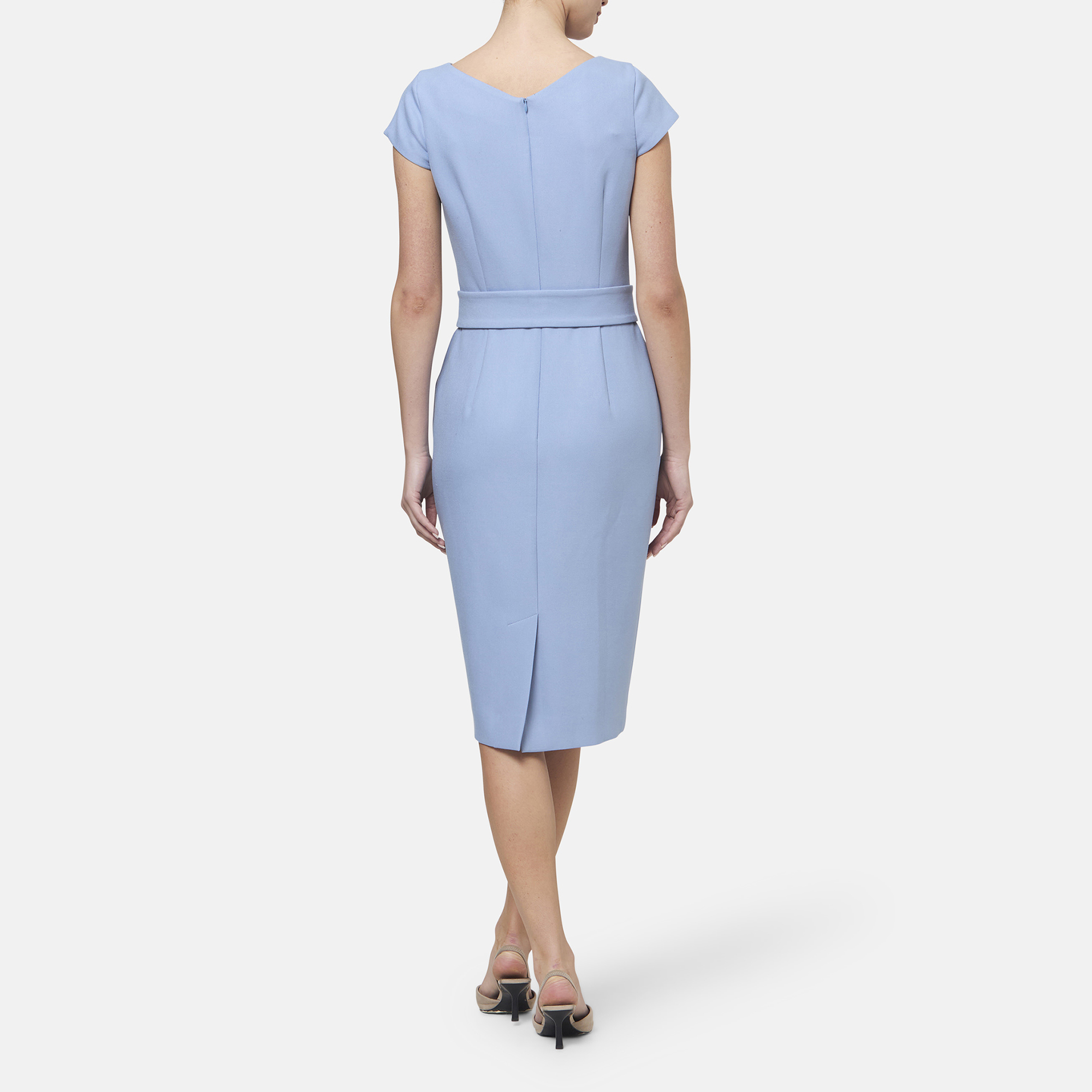 • Cap sleeves, slash neckline, pencil skirt silhouette, detachable belt with covered buttons, signature stretch-fused tricotine fabric