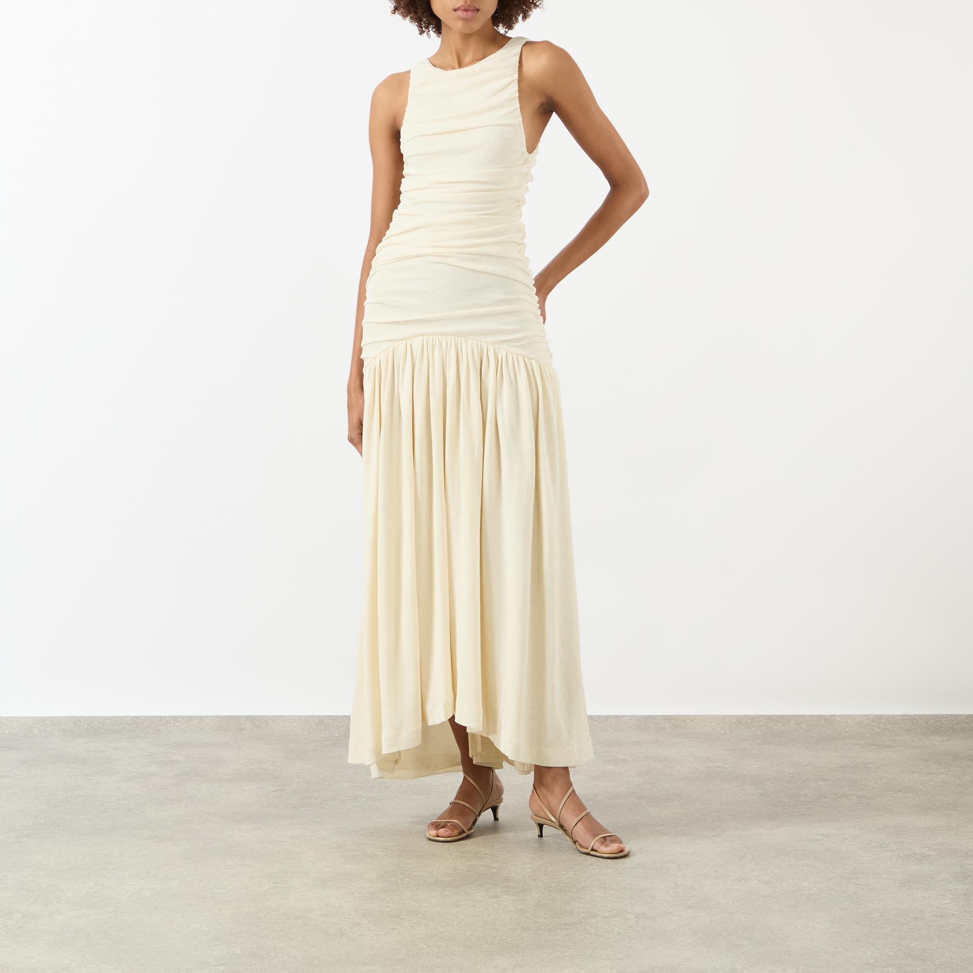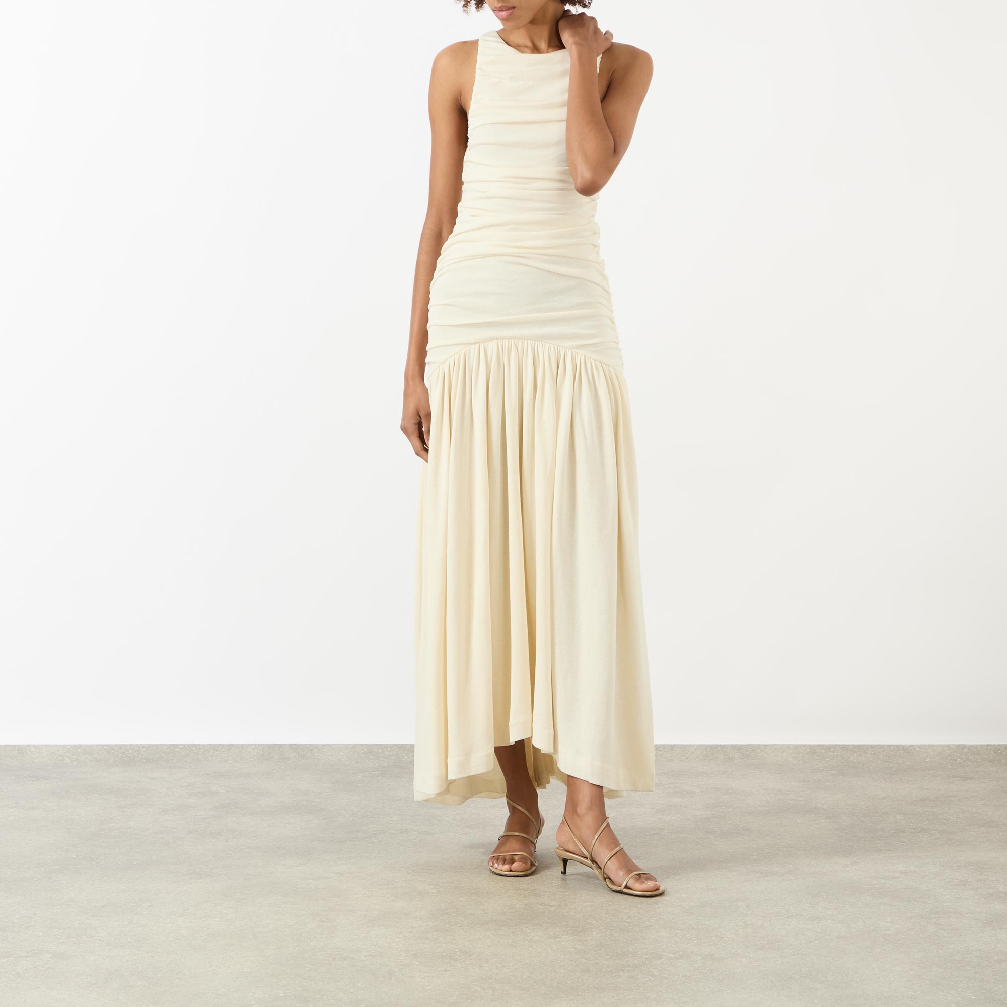 - Round neck, sleeveless design, rear zip fastening, ruched bodice, dropped waistline, flared skirt, asymmetric hem, midi length