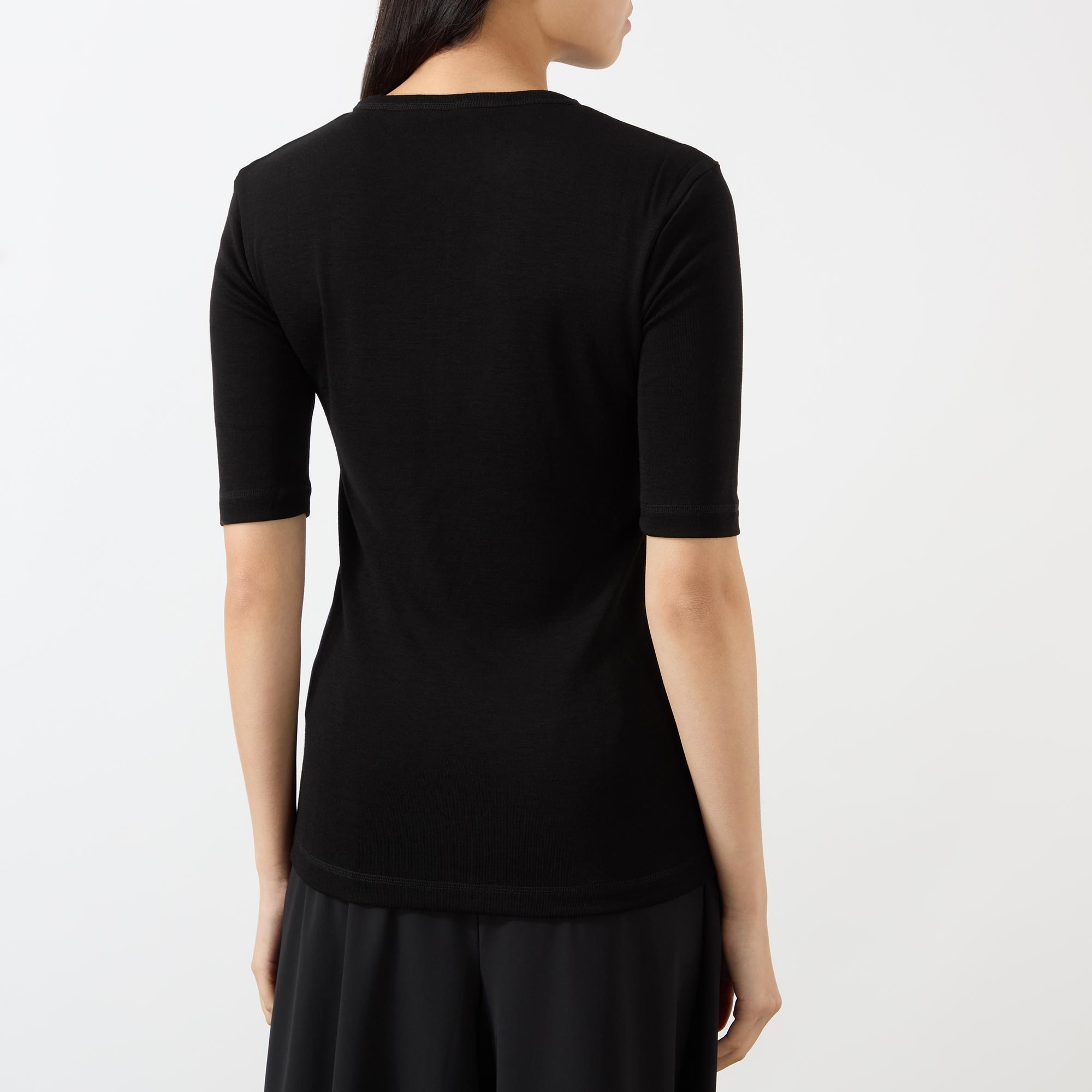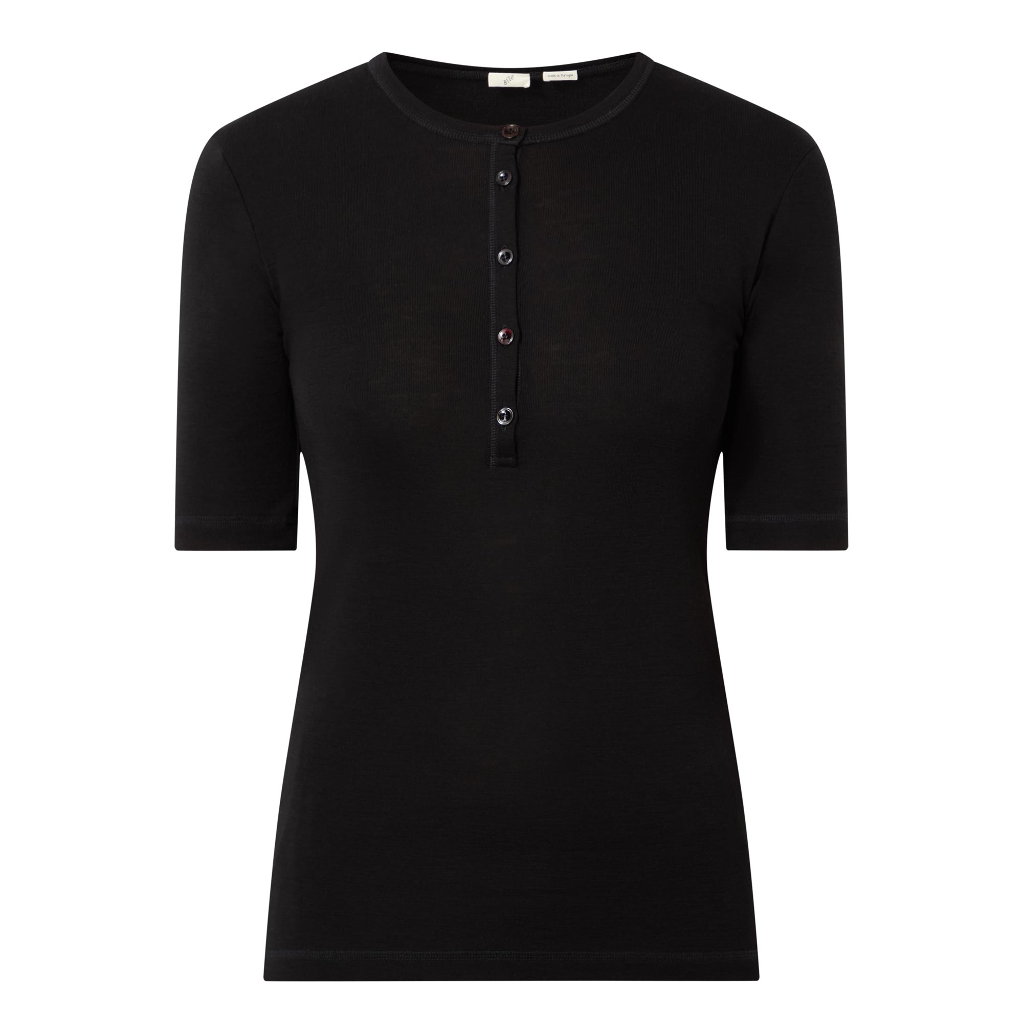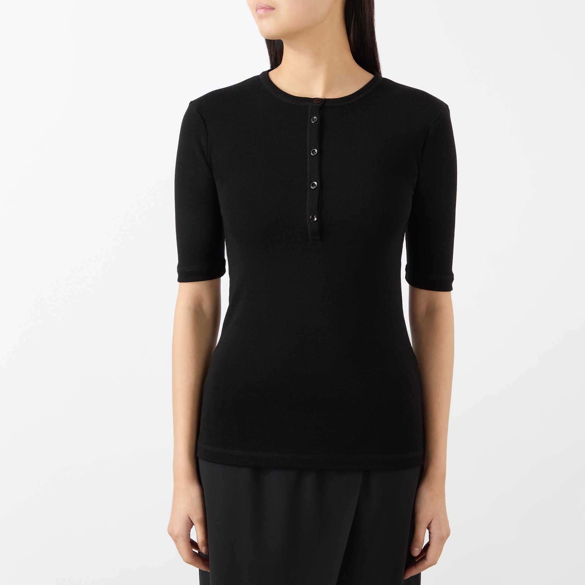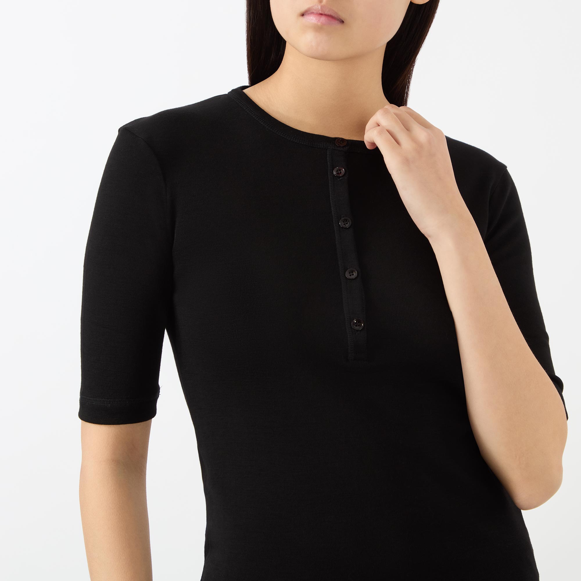 - Crew neck, half button placket, short sleeves, straight hem, tonal stitching, soft rib knit construction