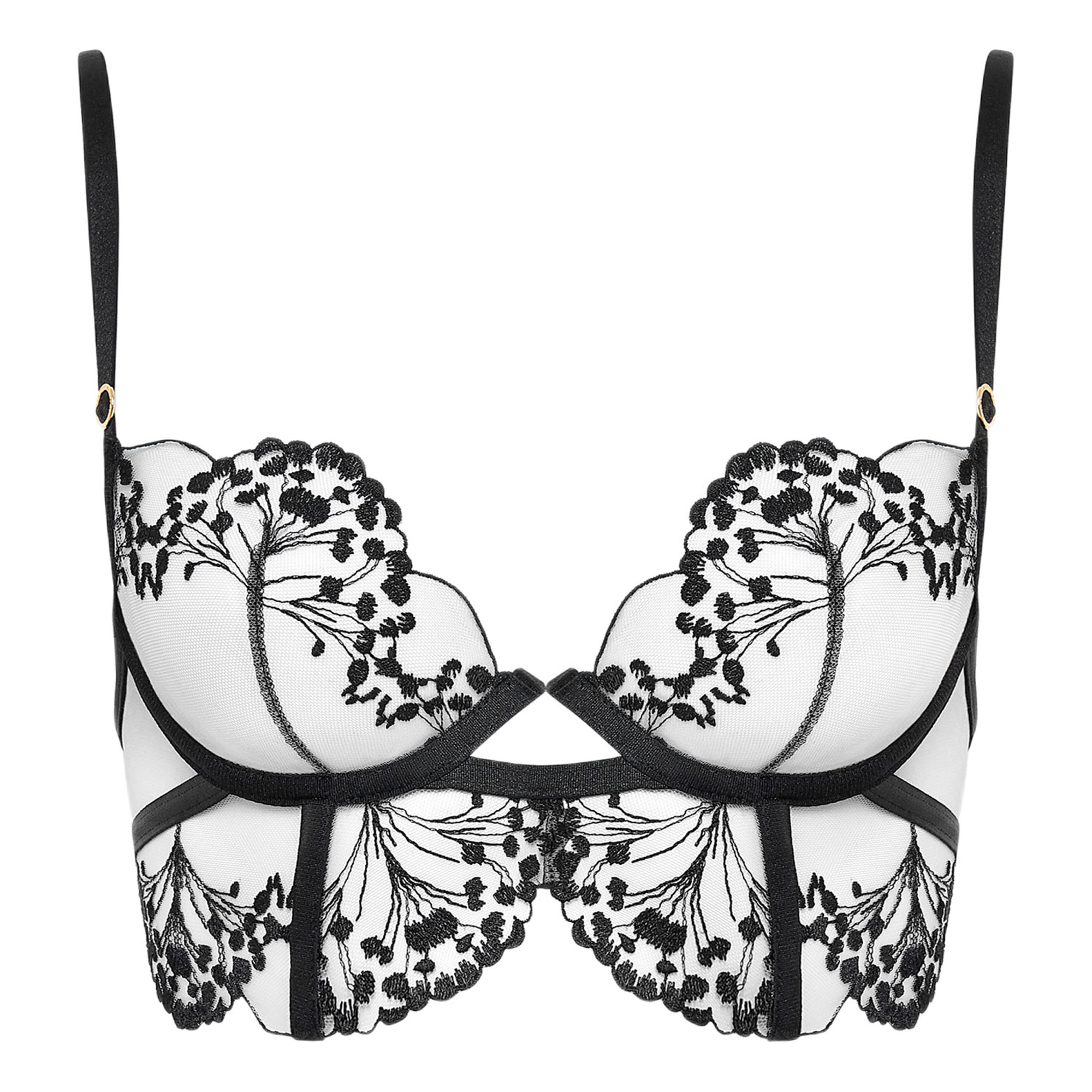 - Signature premium mesh, swirling floral embroidery, central V-wire for structure, adjustable shoulder straps