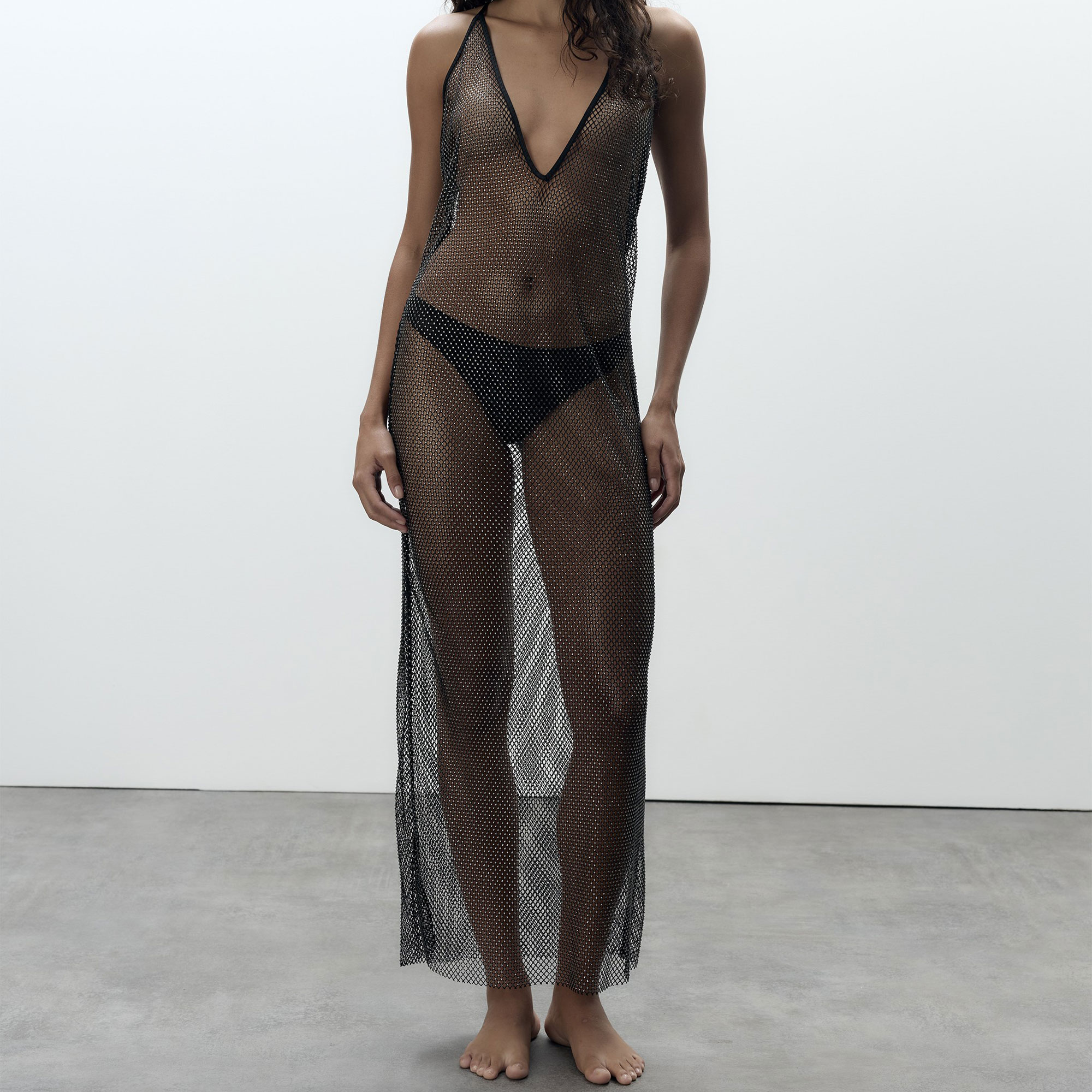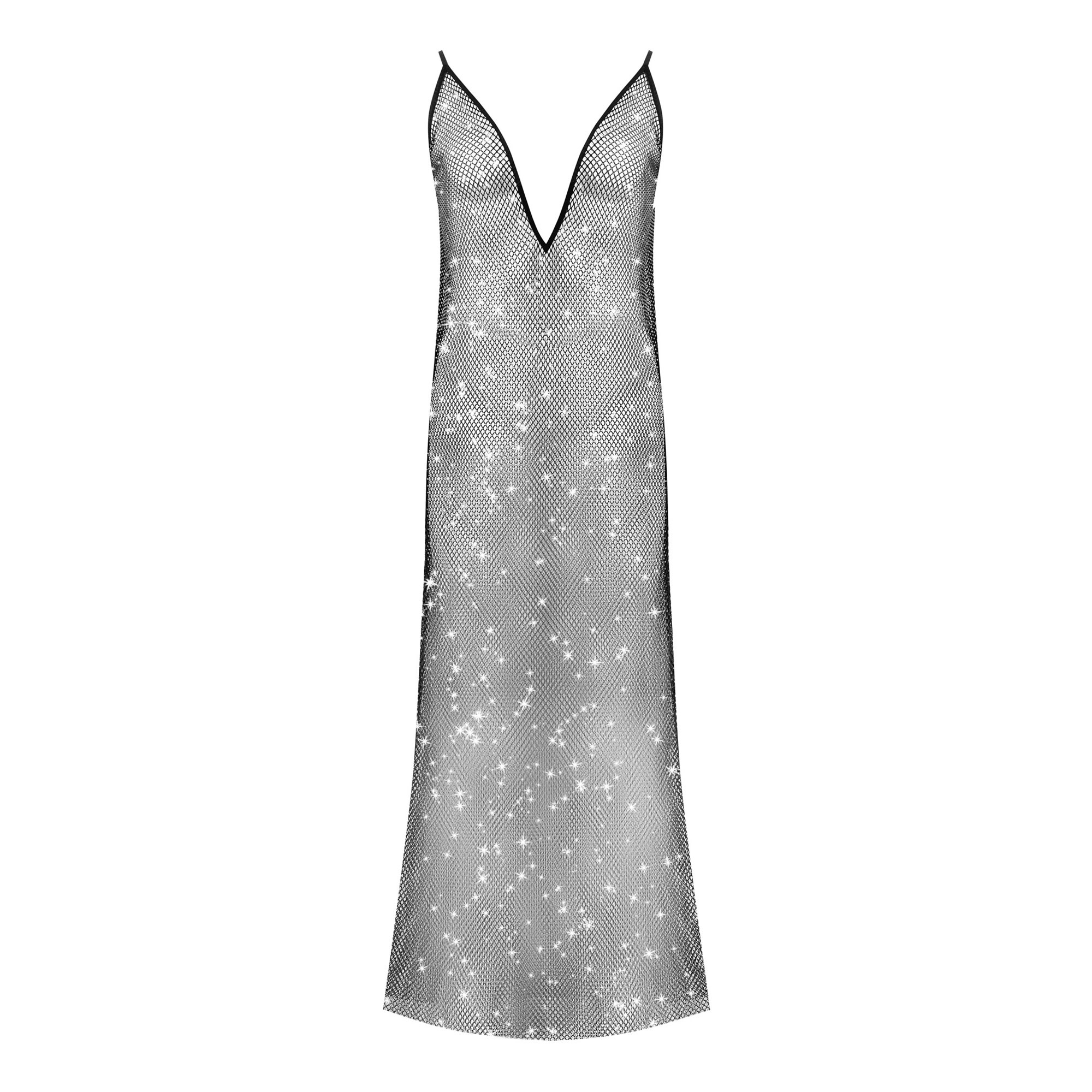 - Fishnet mesh fabric, rhinestone embellishments, fluid weighted drape, designed for party season or provocative layering
