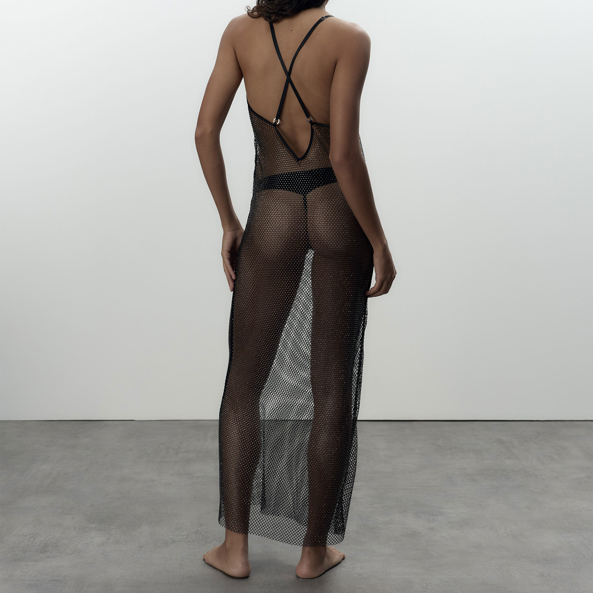 The Noor Sheer Mesh Chemise is crafted from fishnet mesh and scattered with rhinestone embellishments and a fluid, weighted drape that moves with you. Designed for party season or provocative layering, it’s a bold expression of modern sensuality.