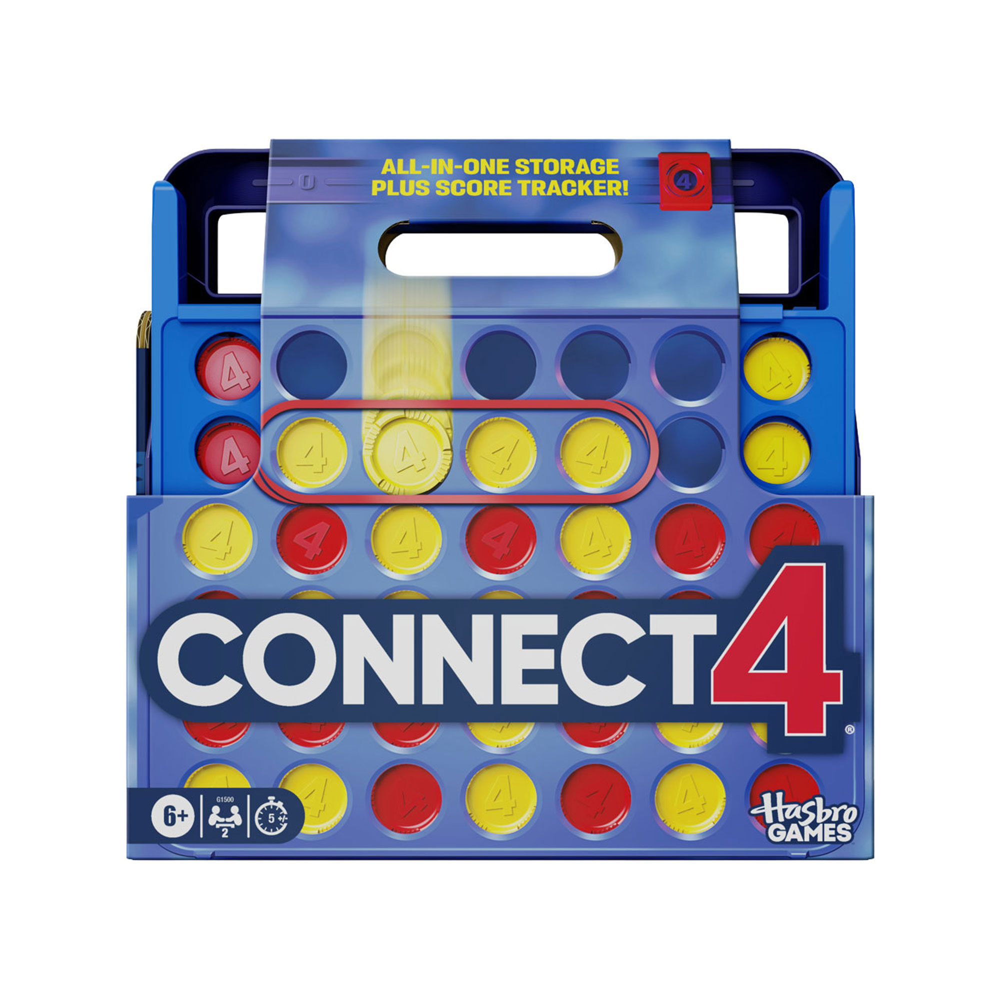 Drop in for the win in the Connect 4 game! This edition of the popular two-player game combines classic gameplay with fresh features, such as an all-in-one carrying case, disc storage and score tracking. To play, each player drops their discs into the grid and tries to get four of their coloured discs in a row. Strategize and block opponents to sink the winning disc. The first to win four rounds is the champ, and now players can track wins with built-in score trackers. This portable edition is designed for easy storage and on-the-go play. The discs can be conveniently stored inside the game unit, which converts into a handled carrying case!