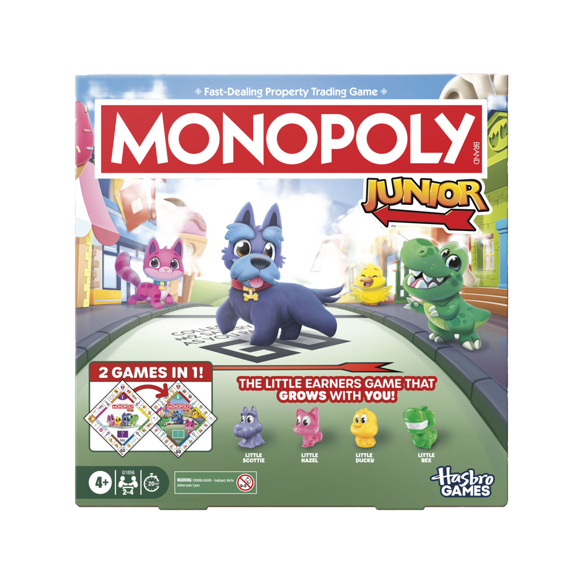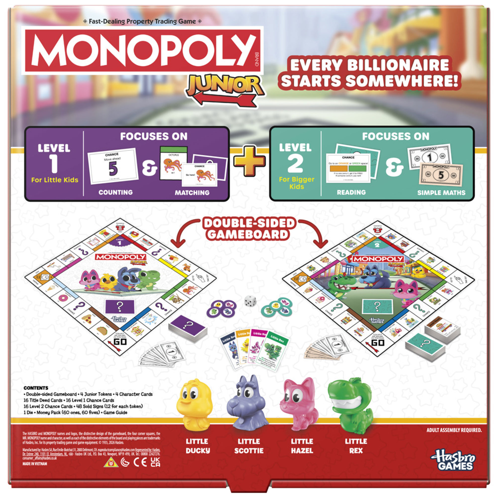 Every billionaire starts somewhere! This 2-in-1 Monopoly Junior game for children features a double-sided board and two levels of difficulty, so families can decide which level is best for them. The Level 1 game, recommended for ages 4-5, helps children practise matching and counting, as they count spaces, match pictures, and buy properties. The player with the most properties wins! Flip over the board for the more advanced Level 2 game for ages 6+. It focuses on reading and simple maths. Players can land on child-friendly spaces, buy properties, collect rent and discover their fortune! To win, be the player with the most money. Suitable for 2 to 4 players, the Monopoly Junior game is a great indoor game for family time, after dinner and holidays.