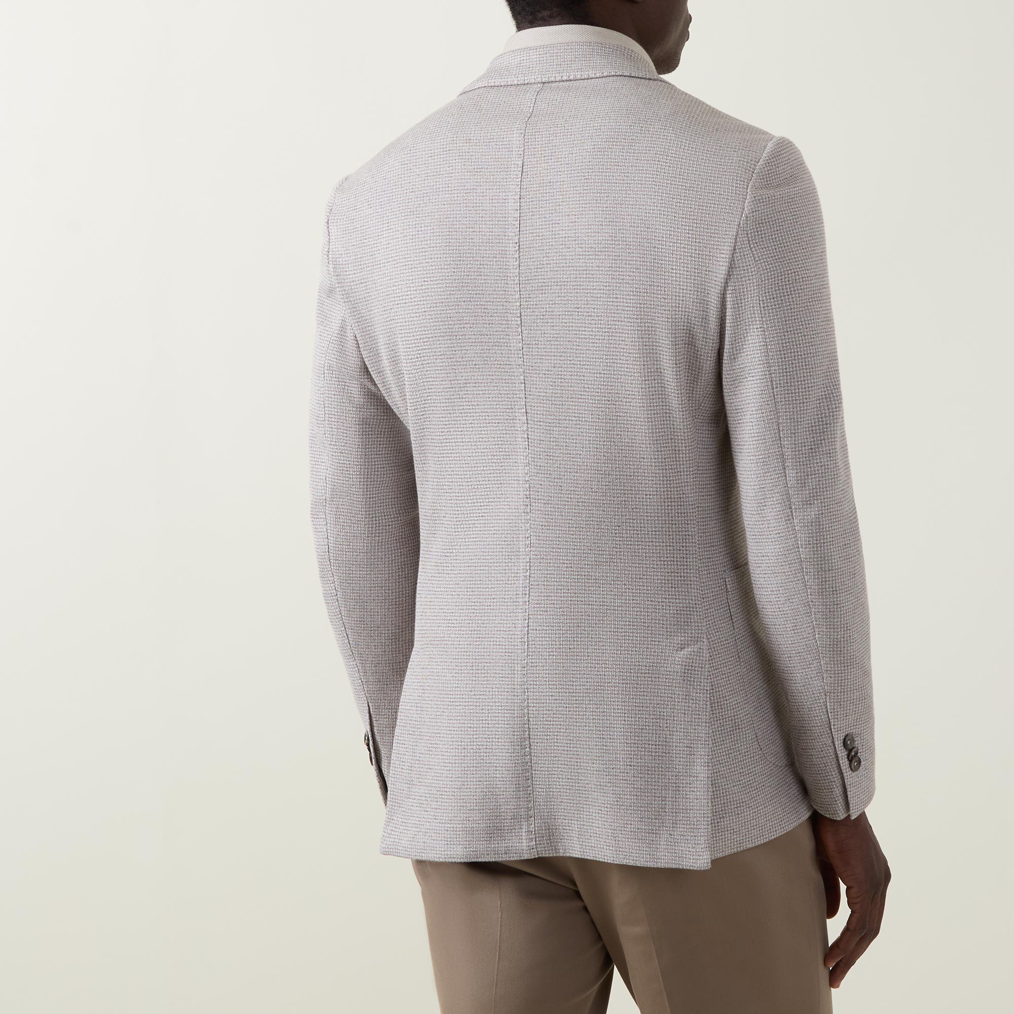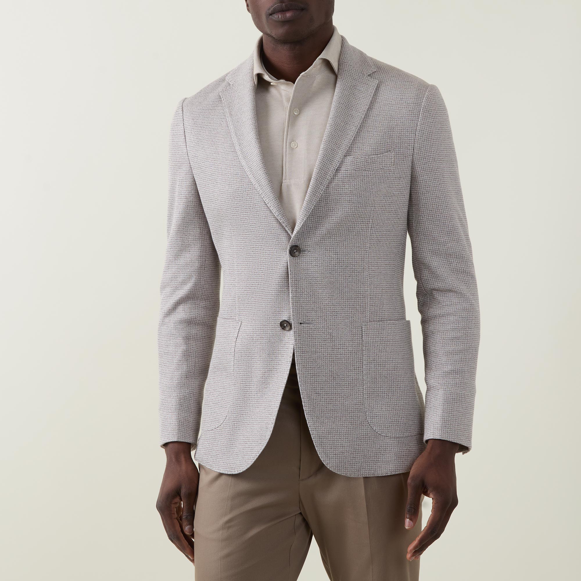 - Single breasted, micro textured pattern, notched lapels, chest pocket, two side patch pockets, button fastenings