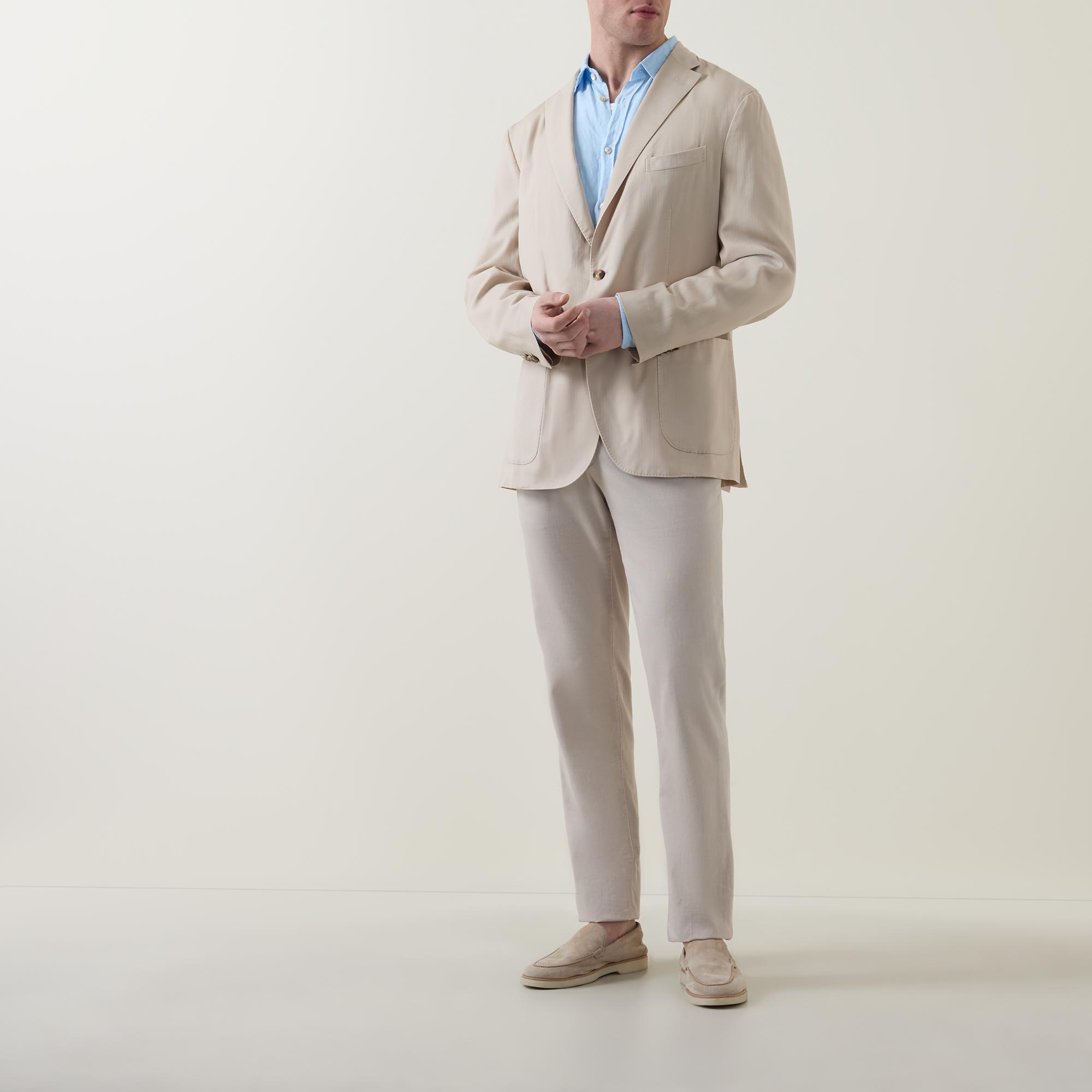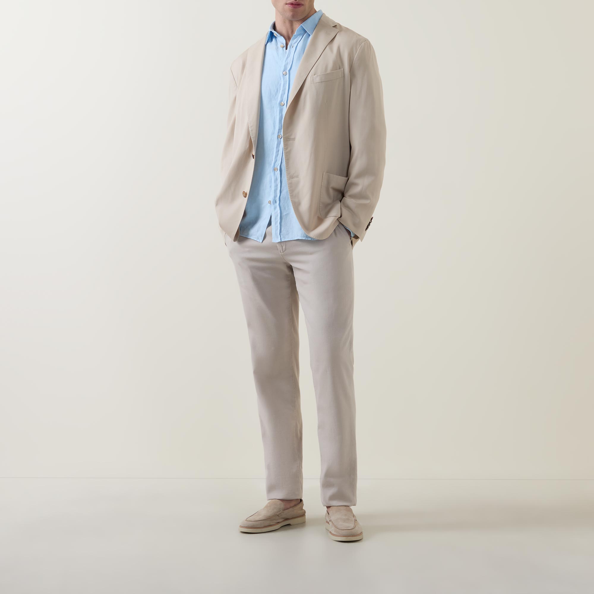 - Single-breasted, button fastening, long sleeves, chest pocket, patch pockets, buttoned cuffs, double-vented