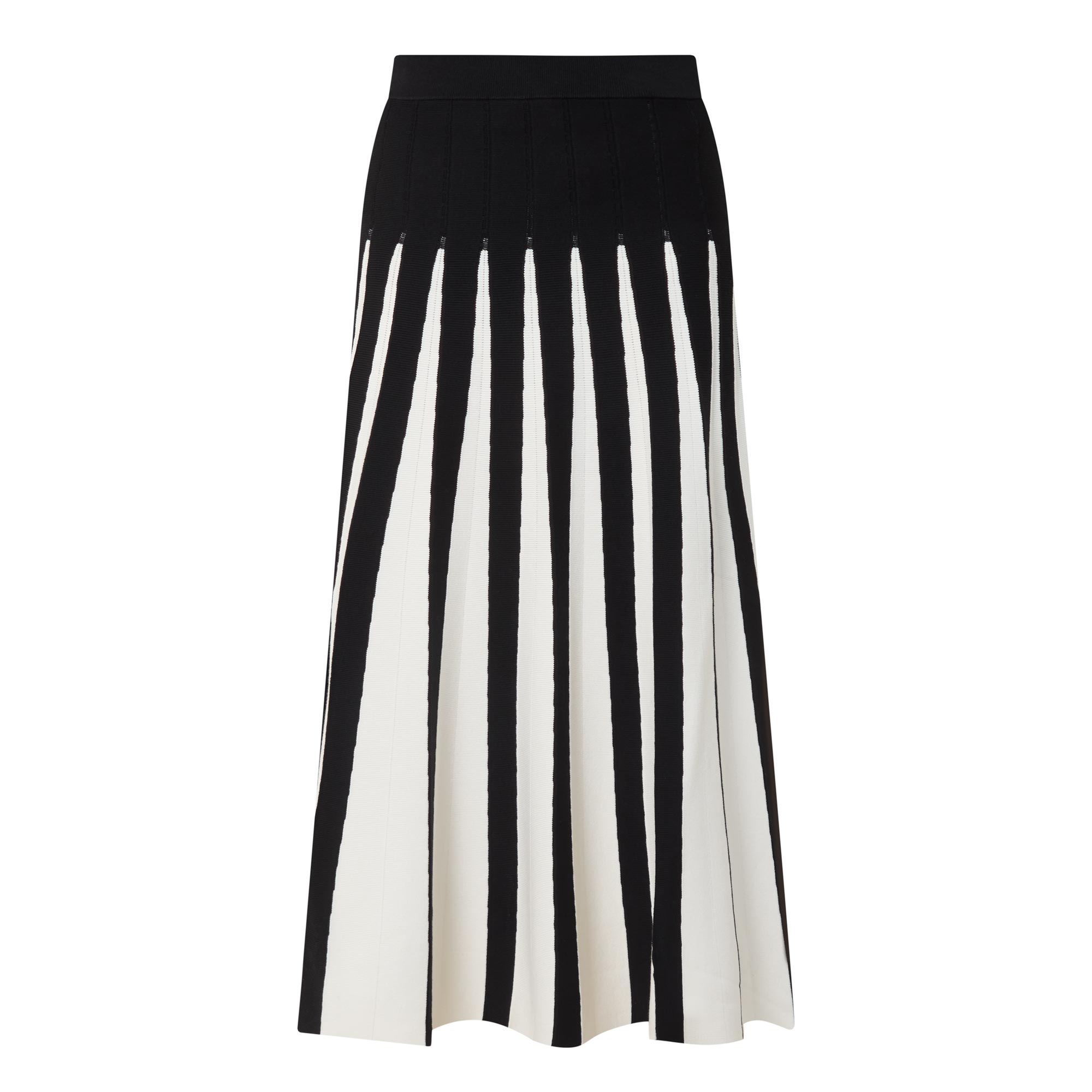 - High rise, elasticated waistband, two-tone pleats, knit construction, midi length