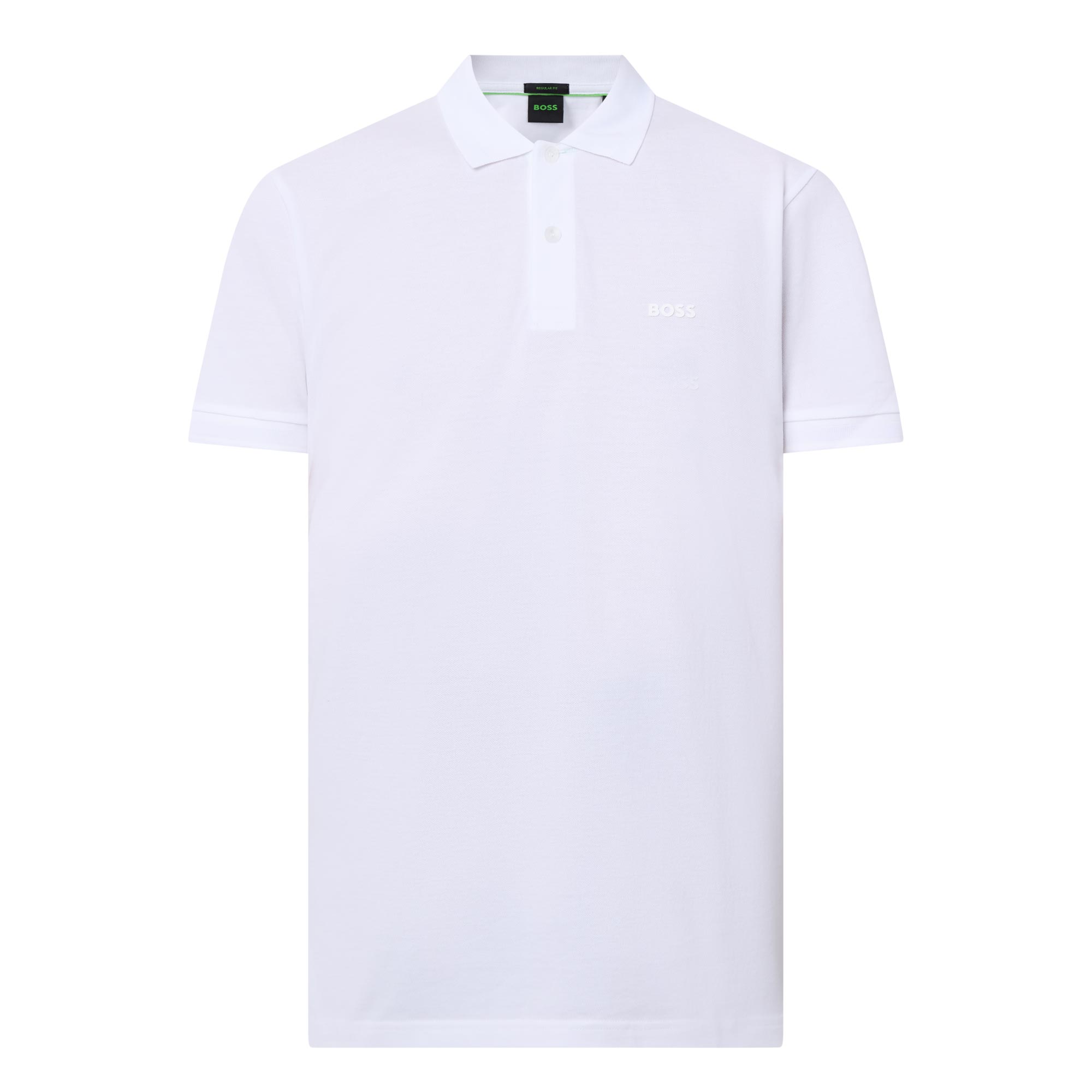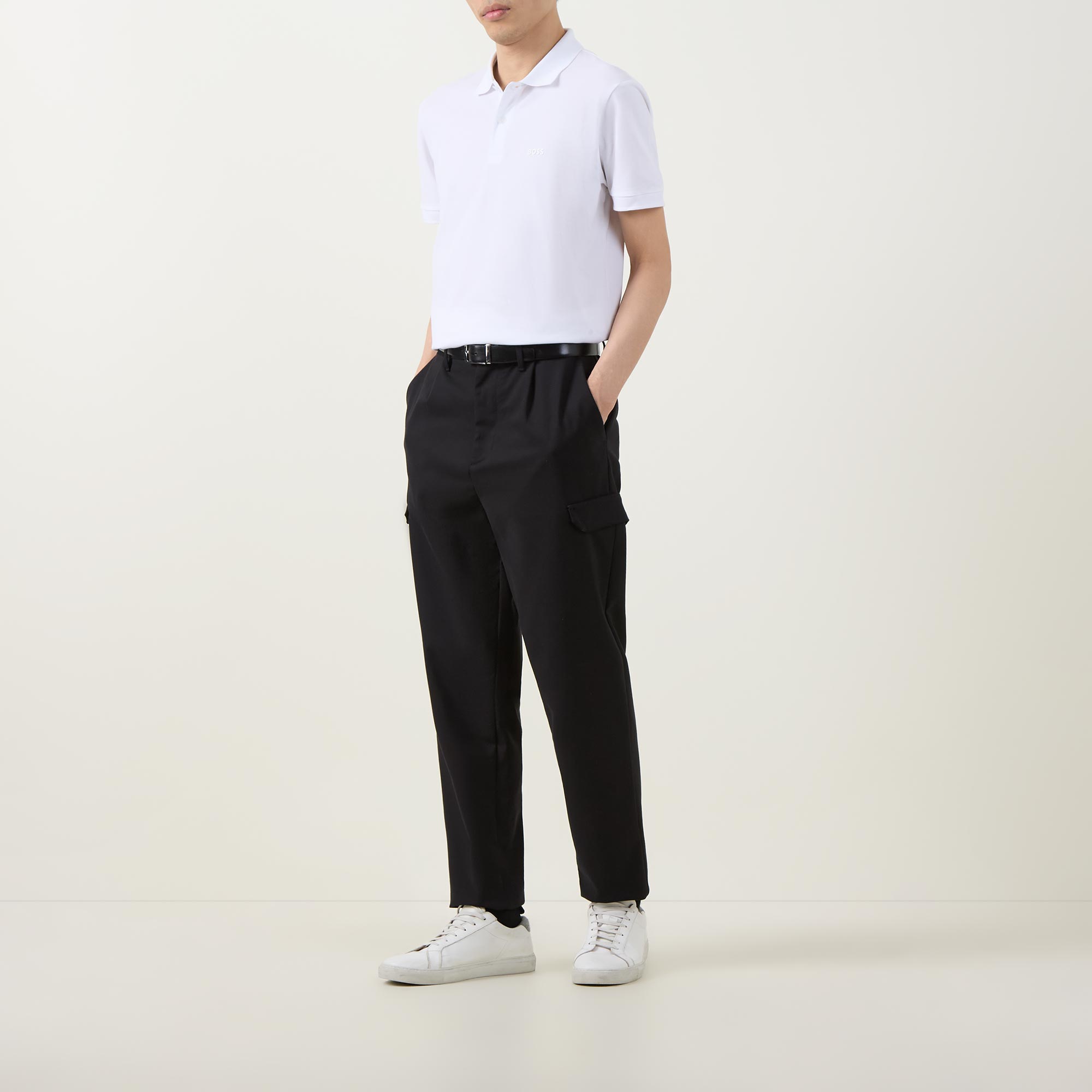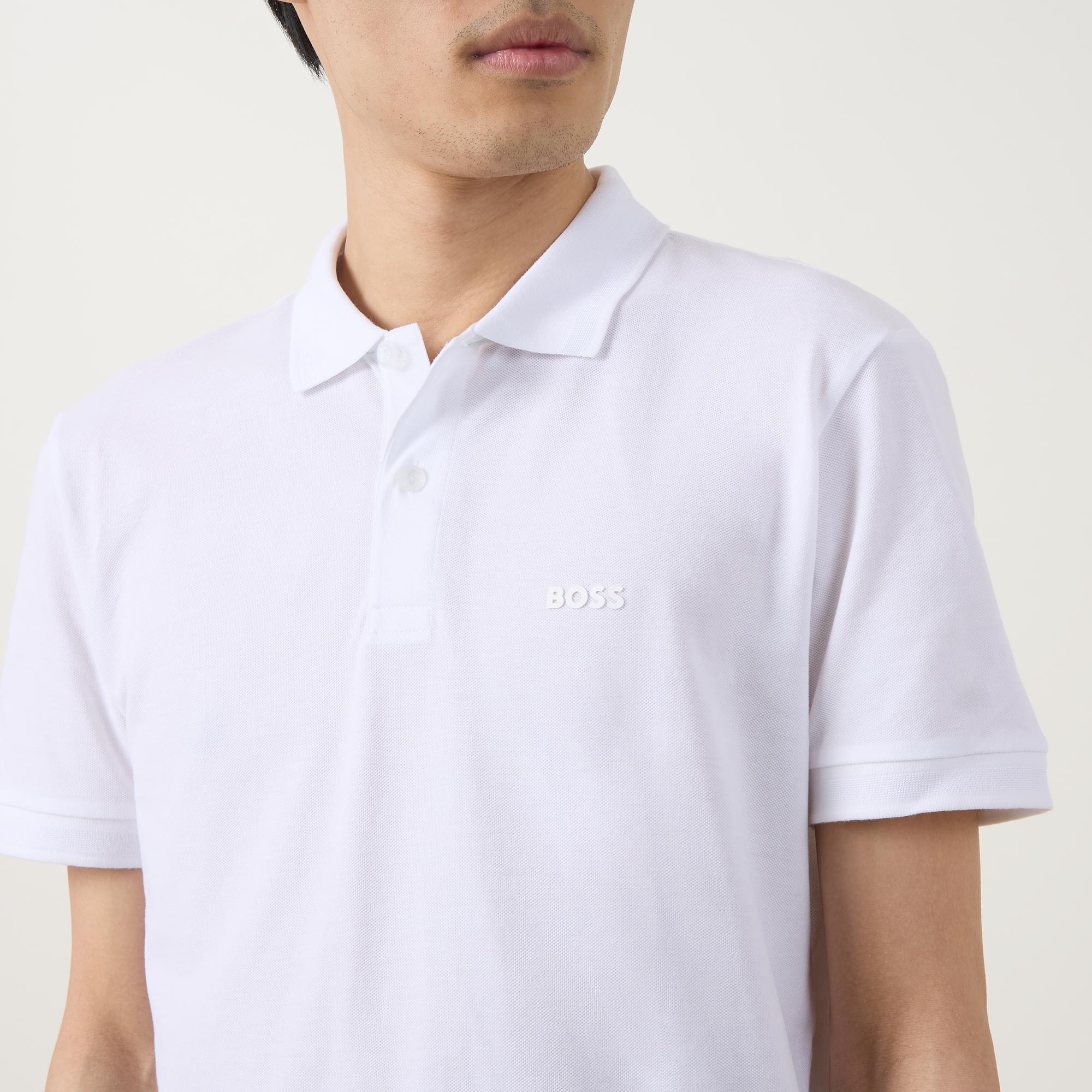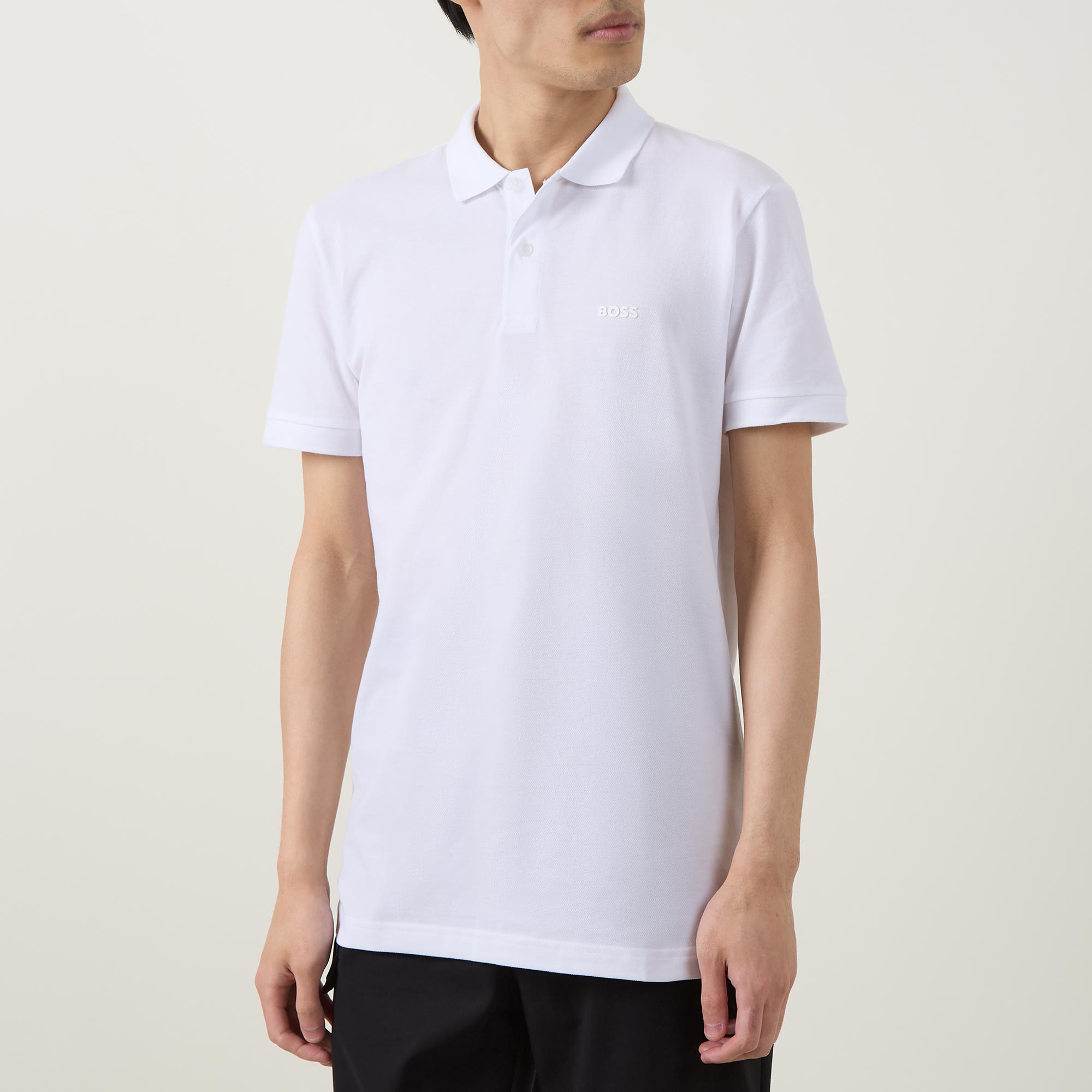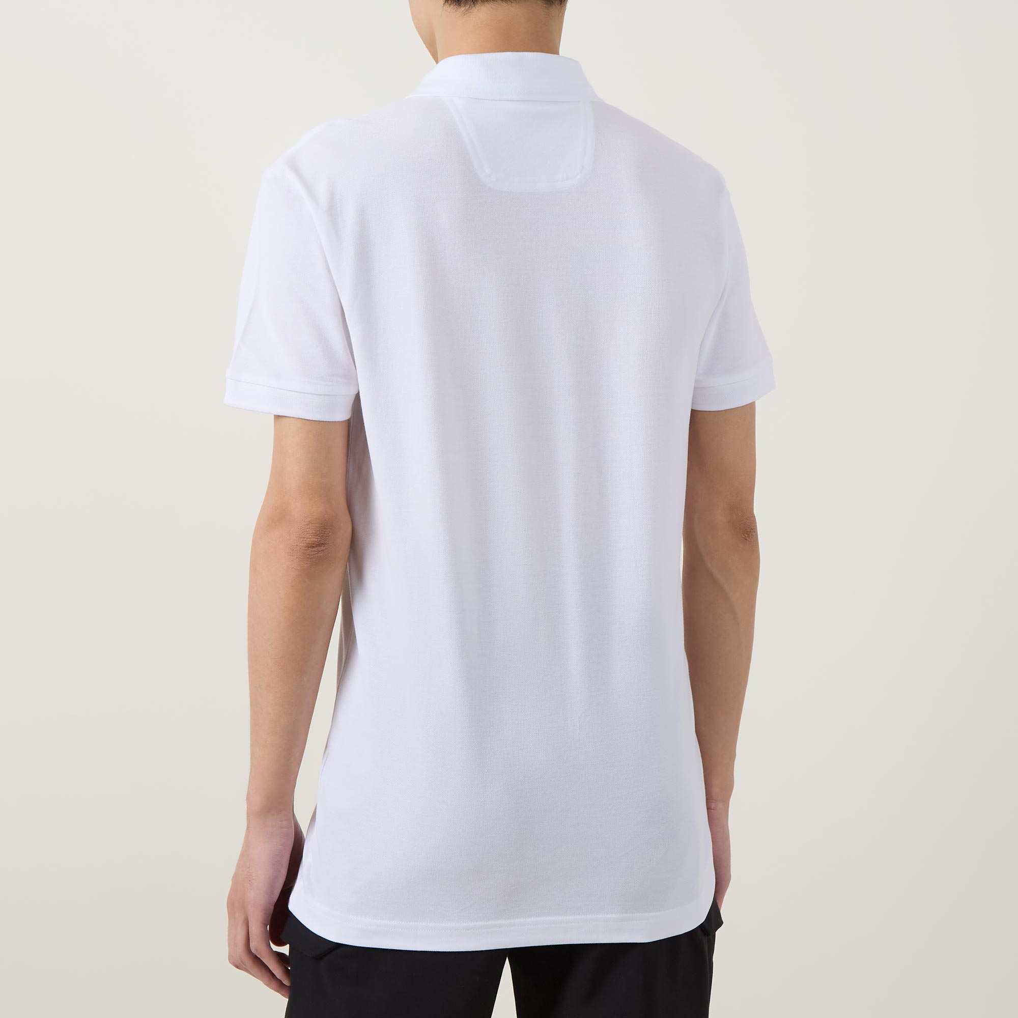 - Polo collar, two button placket, short sleeves, straight hem, tonal logo detail on the chest, smooth finish