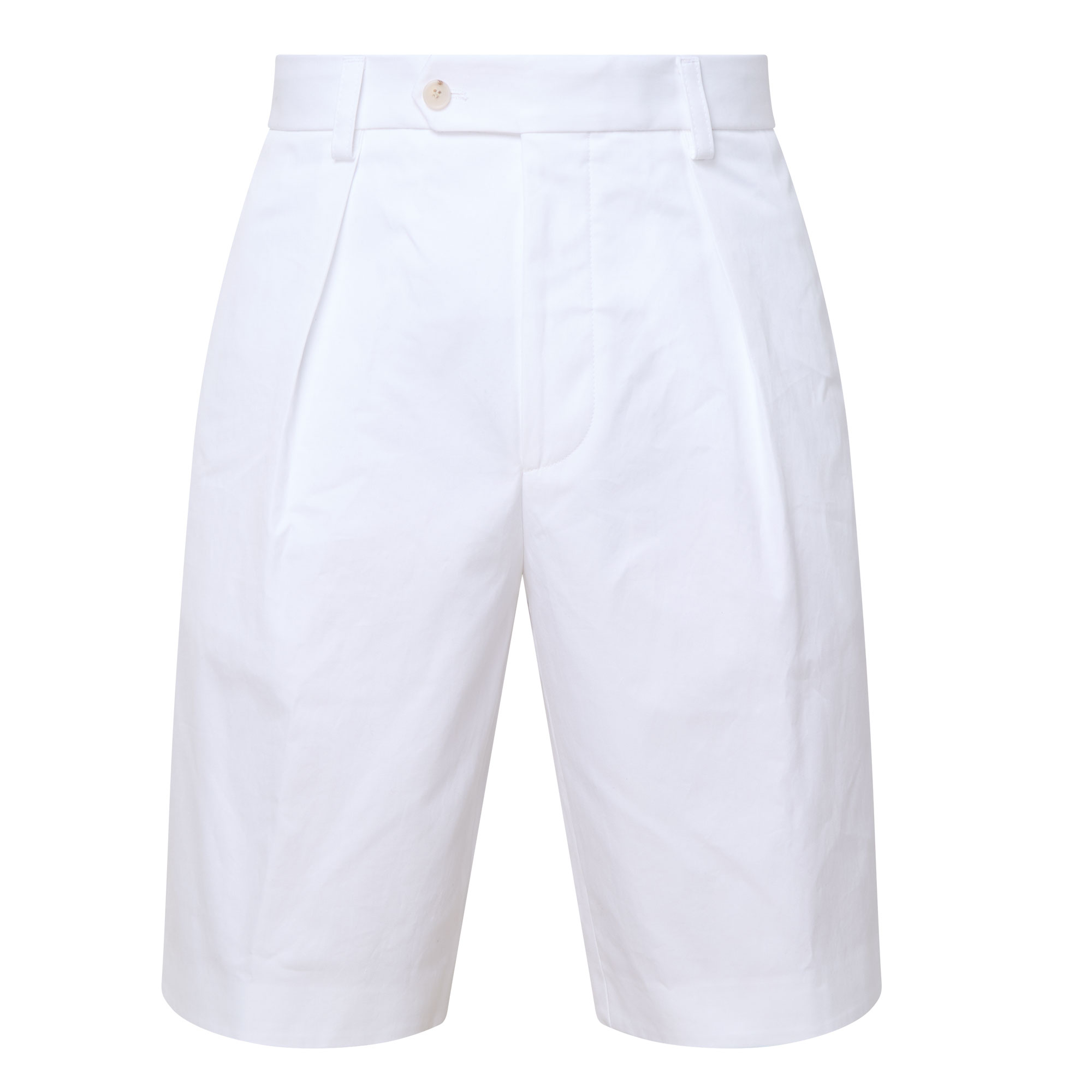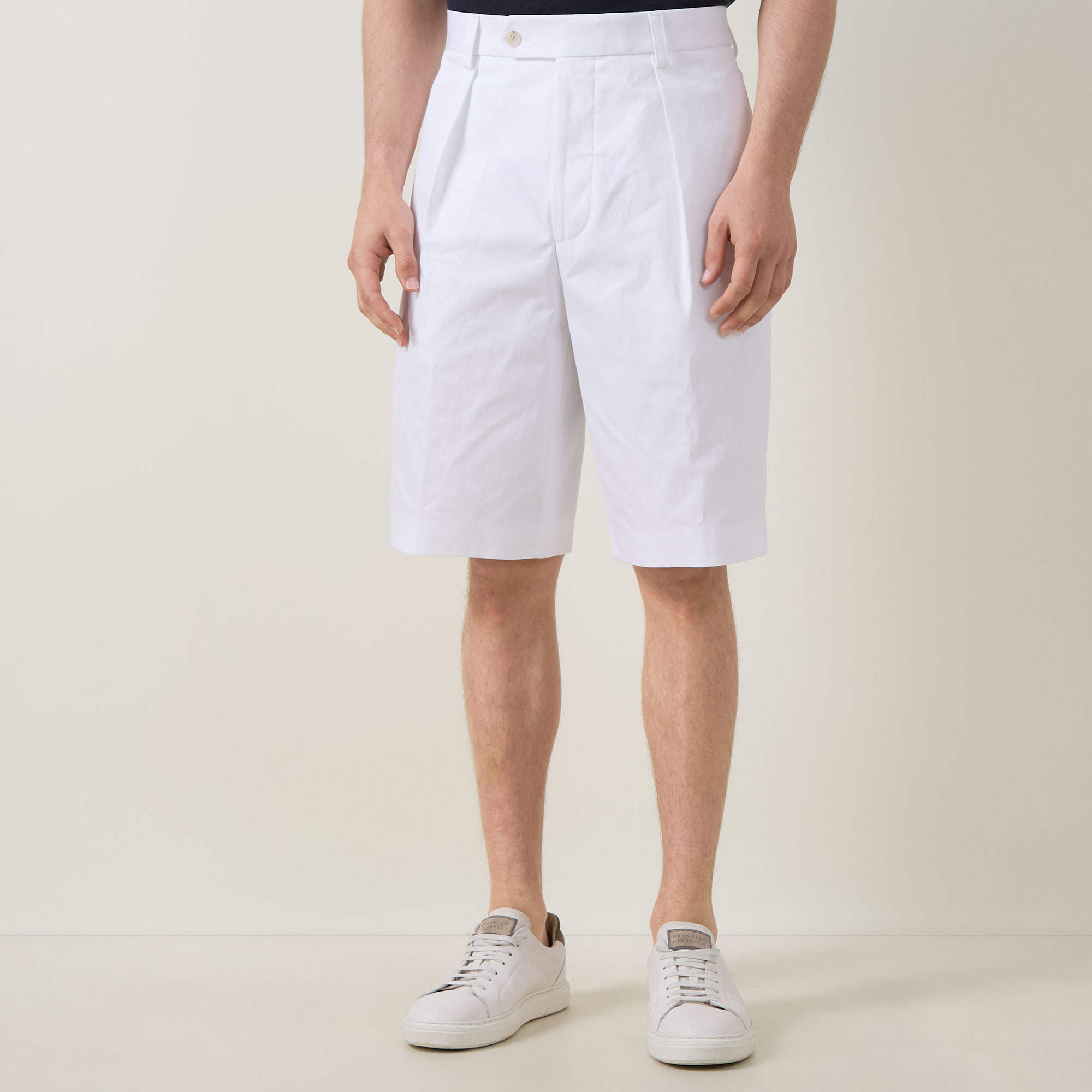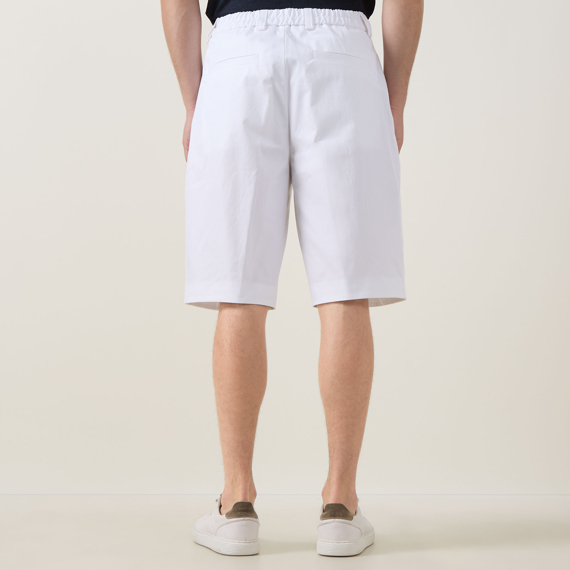 - Mid-rise, straight-leg, above-the-knee length, rear elasticated waistband, belt loops, concealed fly and button fastening, front pleats, two side entry pockets, two rear welt pockets, clean hems, pressed creases, tonal stitching