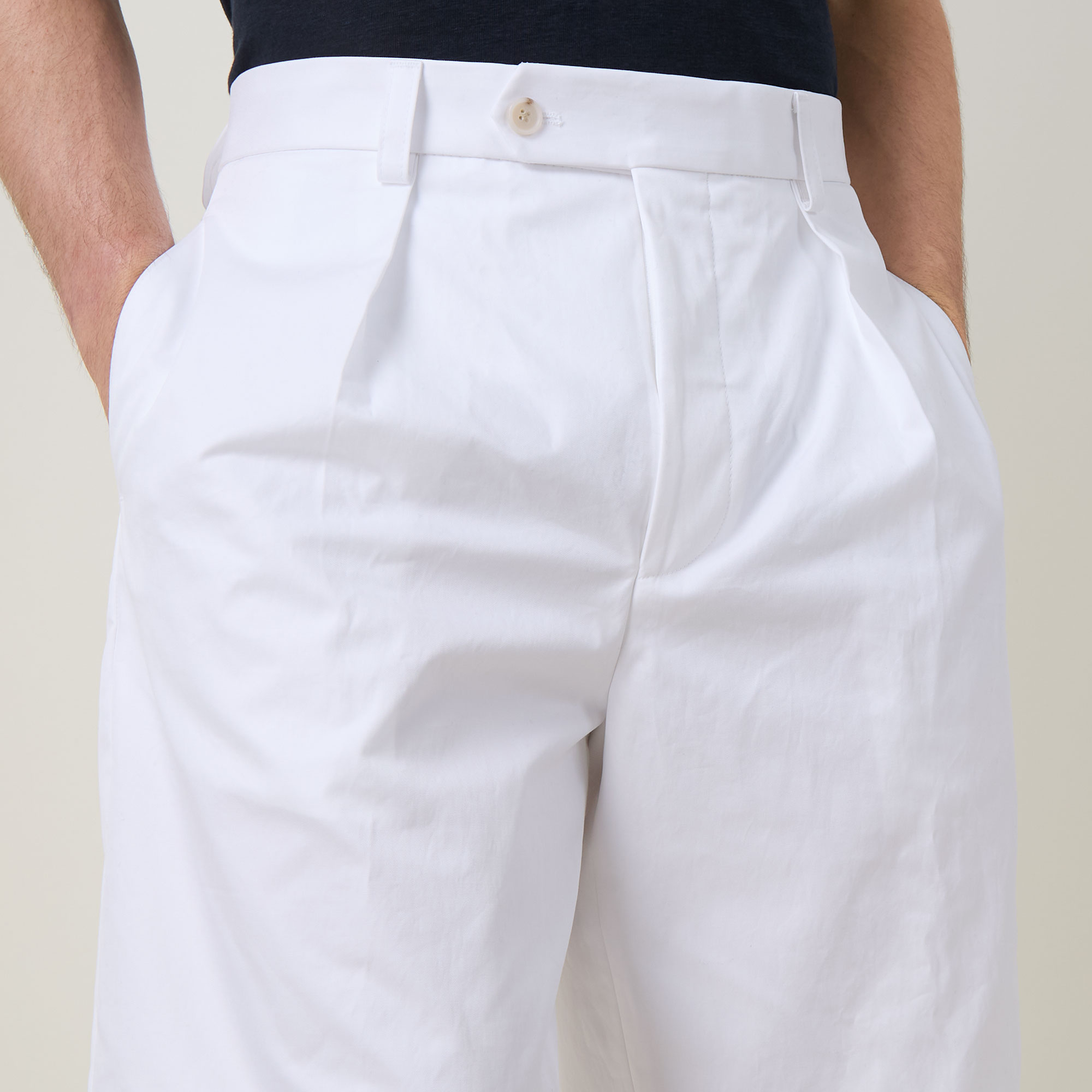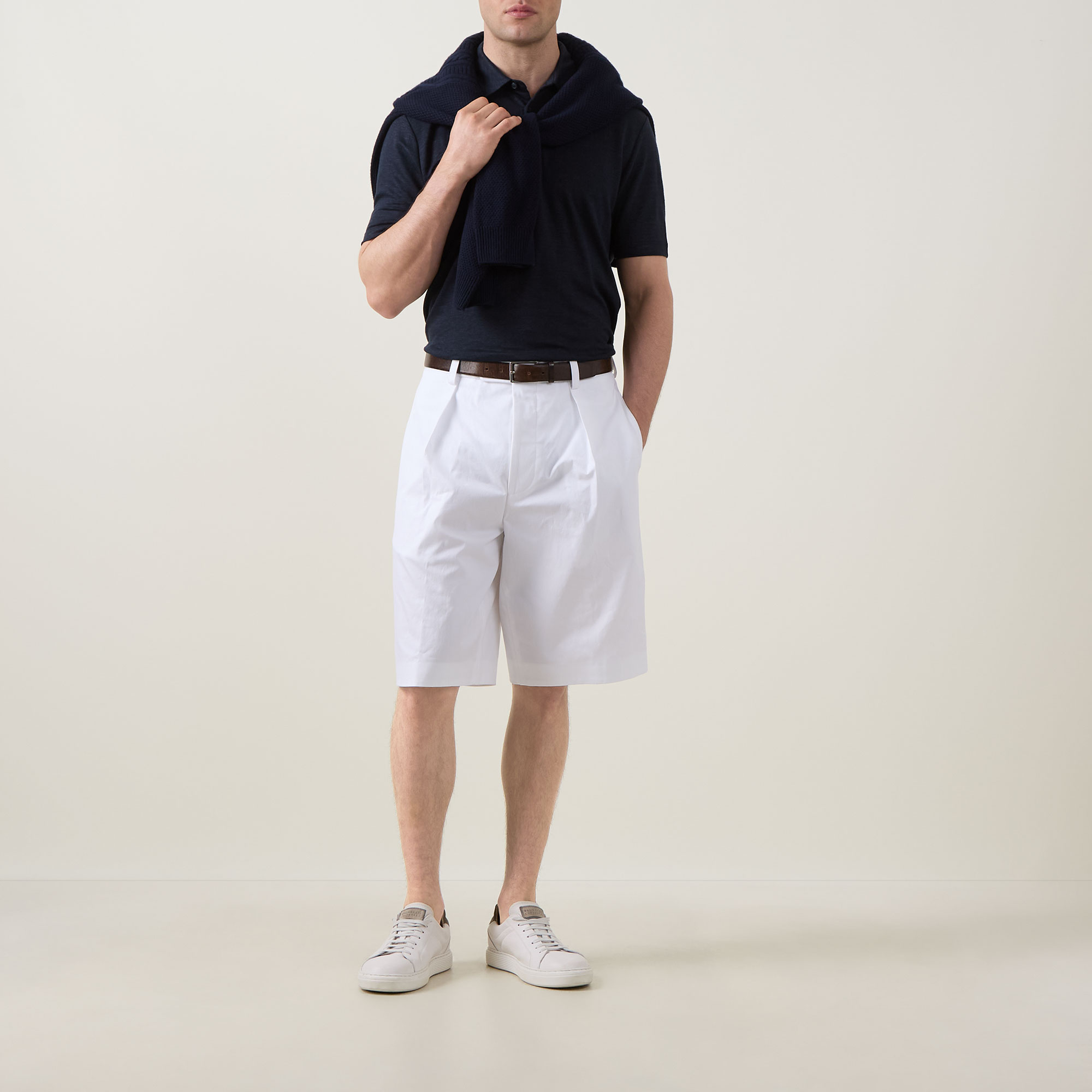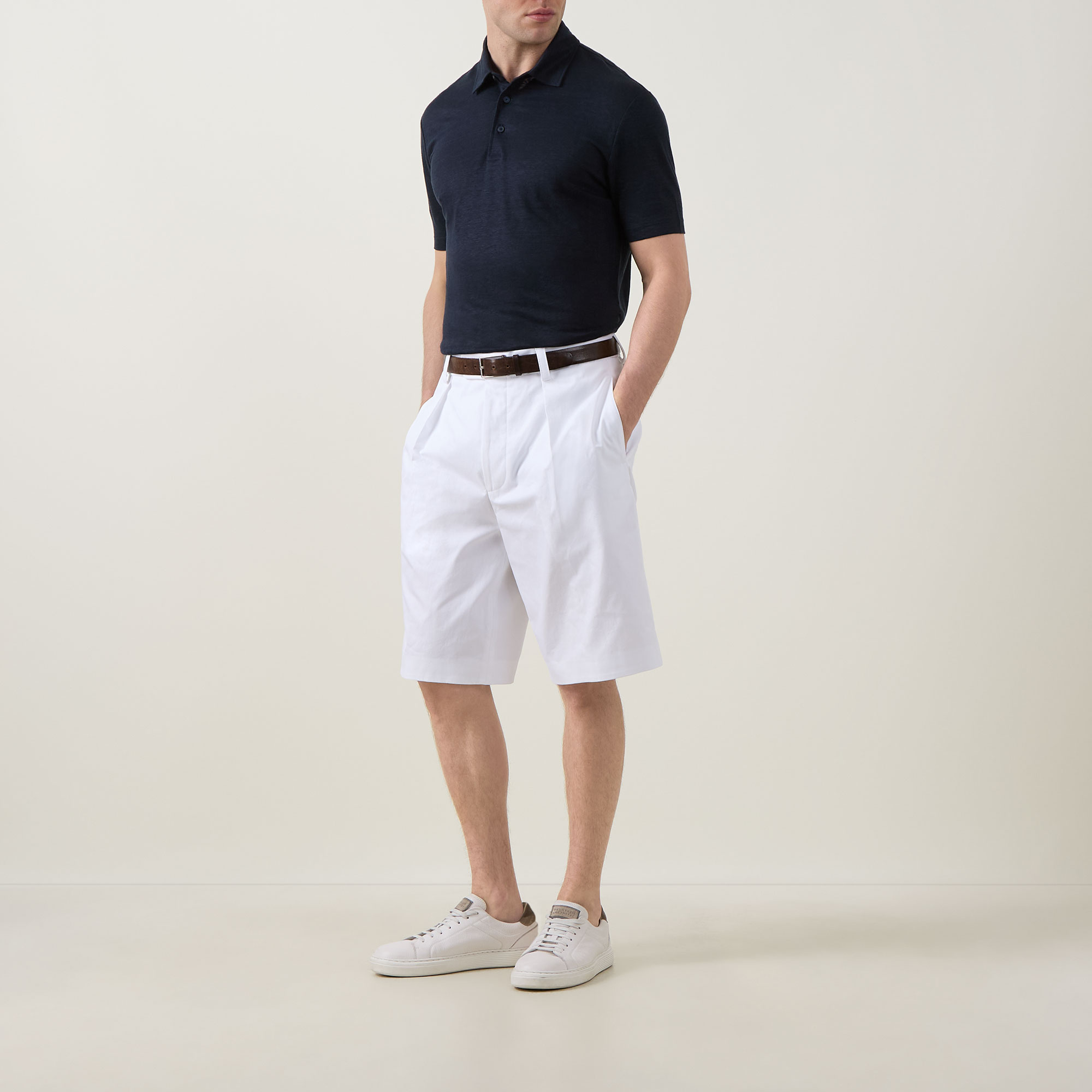 - Mid-rise, straight-leg, above-the-knee length, rear elasticated waistband, belt loops, concealed fly and button fastening, front pleats, two side entry pockets, two rear welt pockets, clean hems, pressed creases, tonal stitching