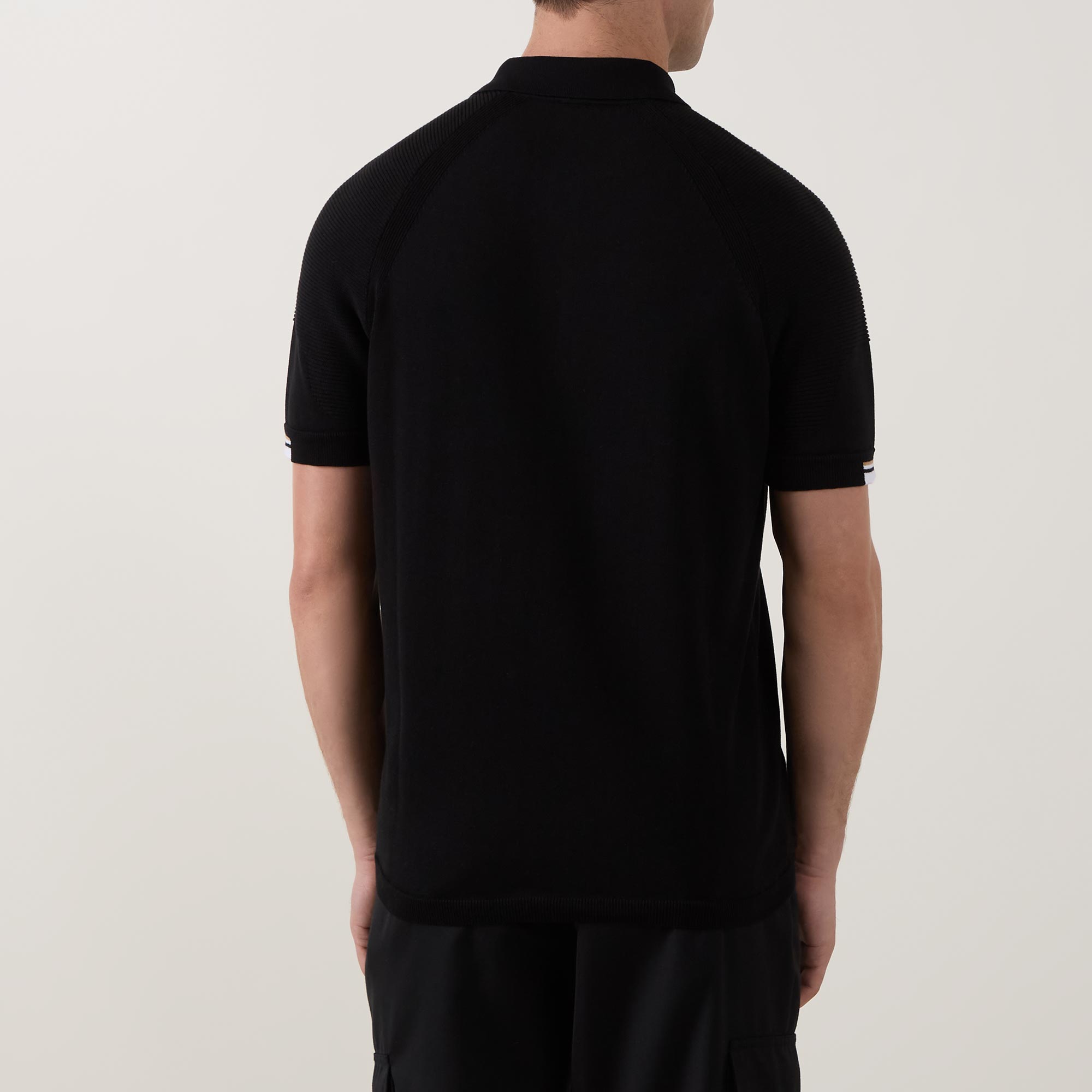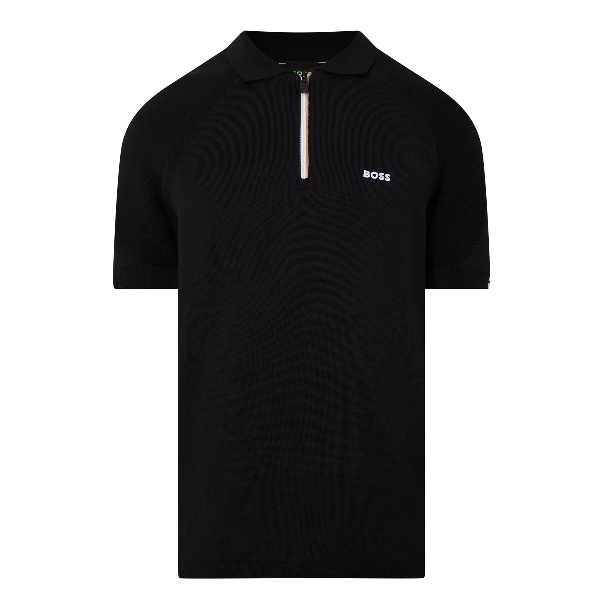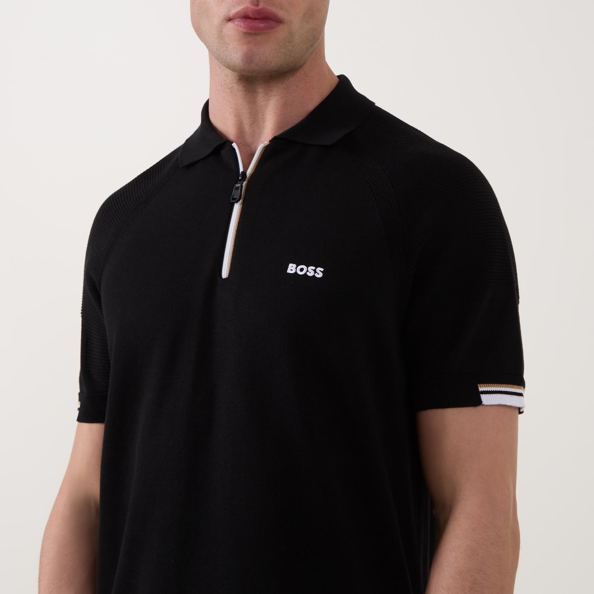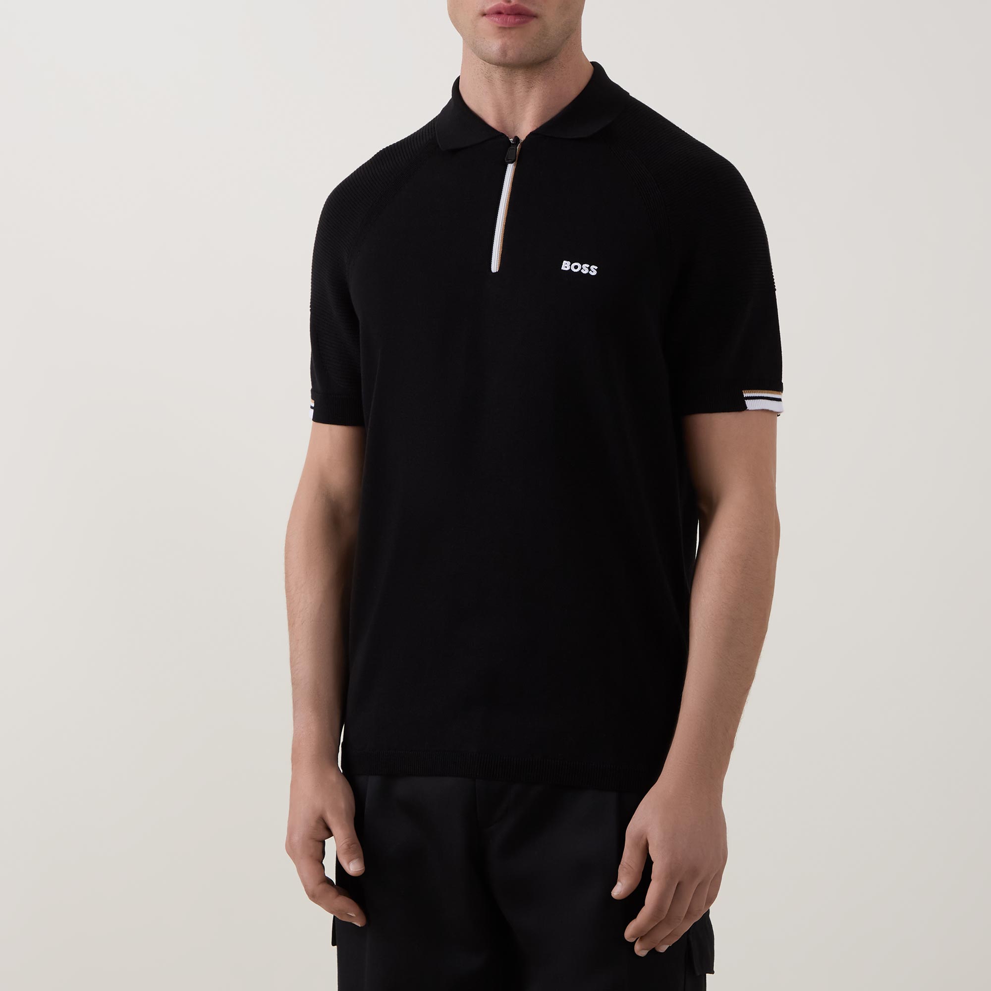 - Polo collar, half zip placket, short sleeves, signature stripe detailing, straight hem, contrasting logo detail on the chest
