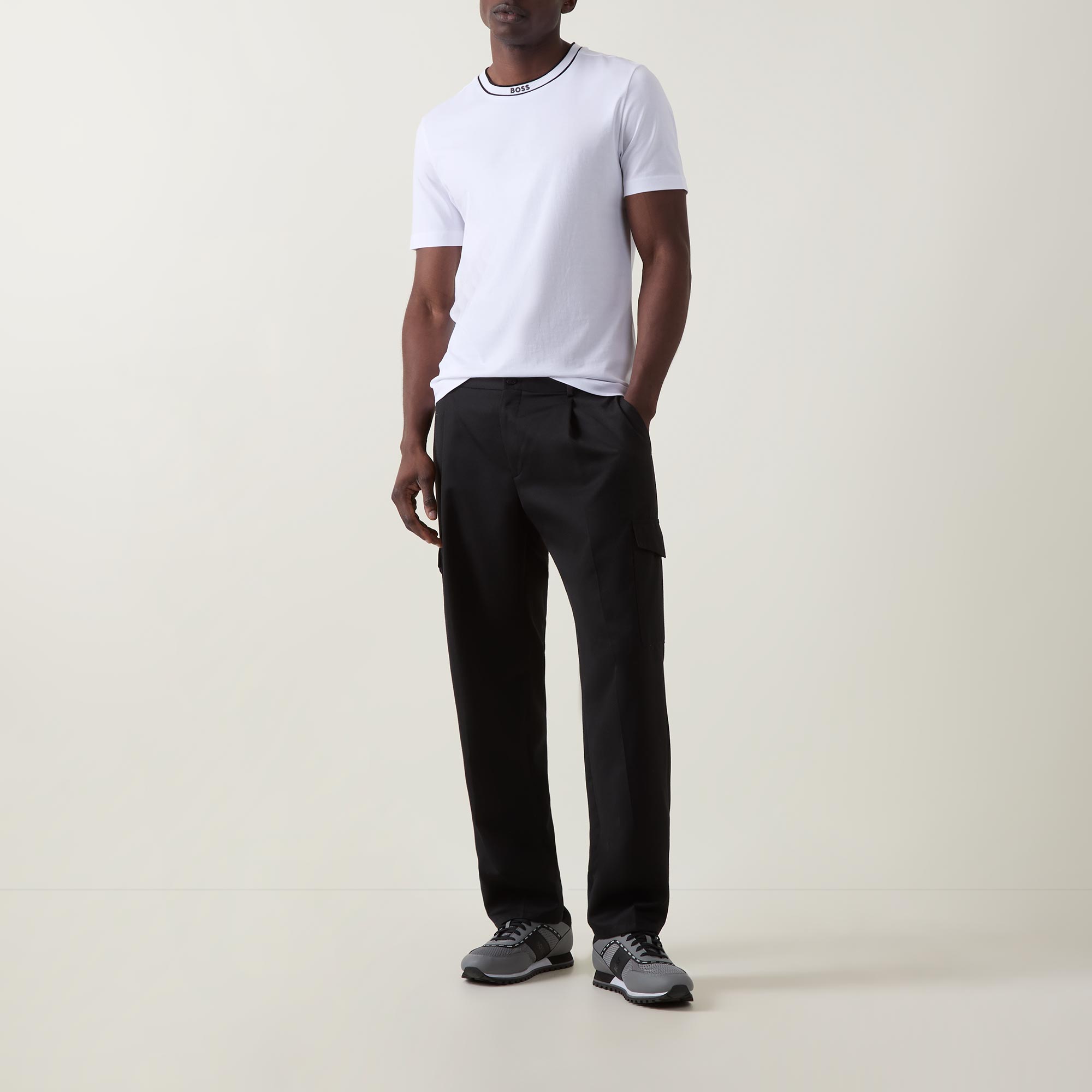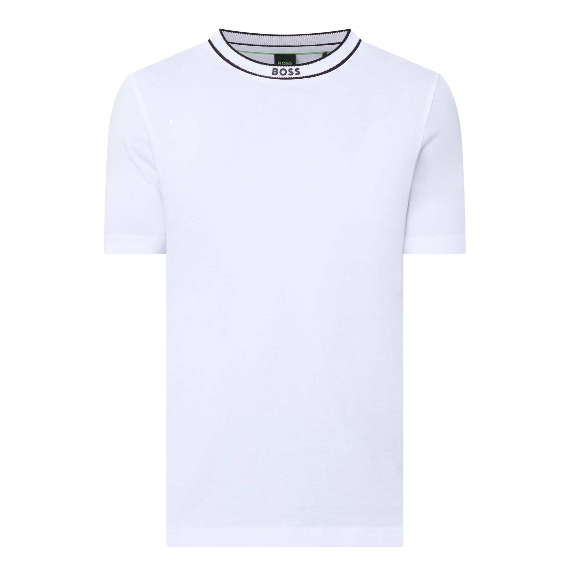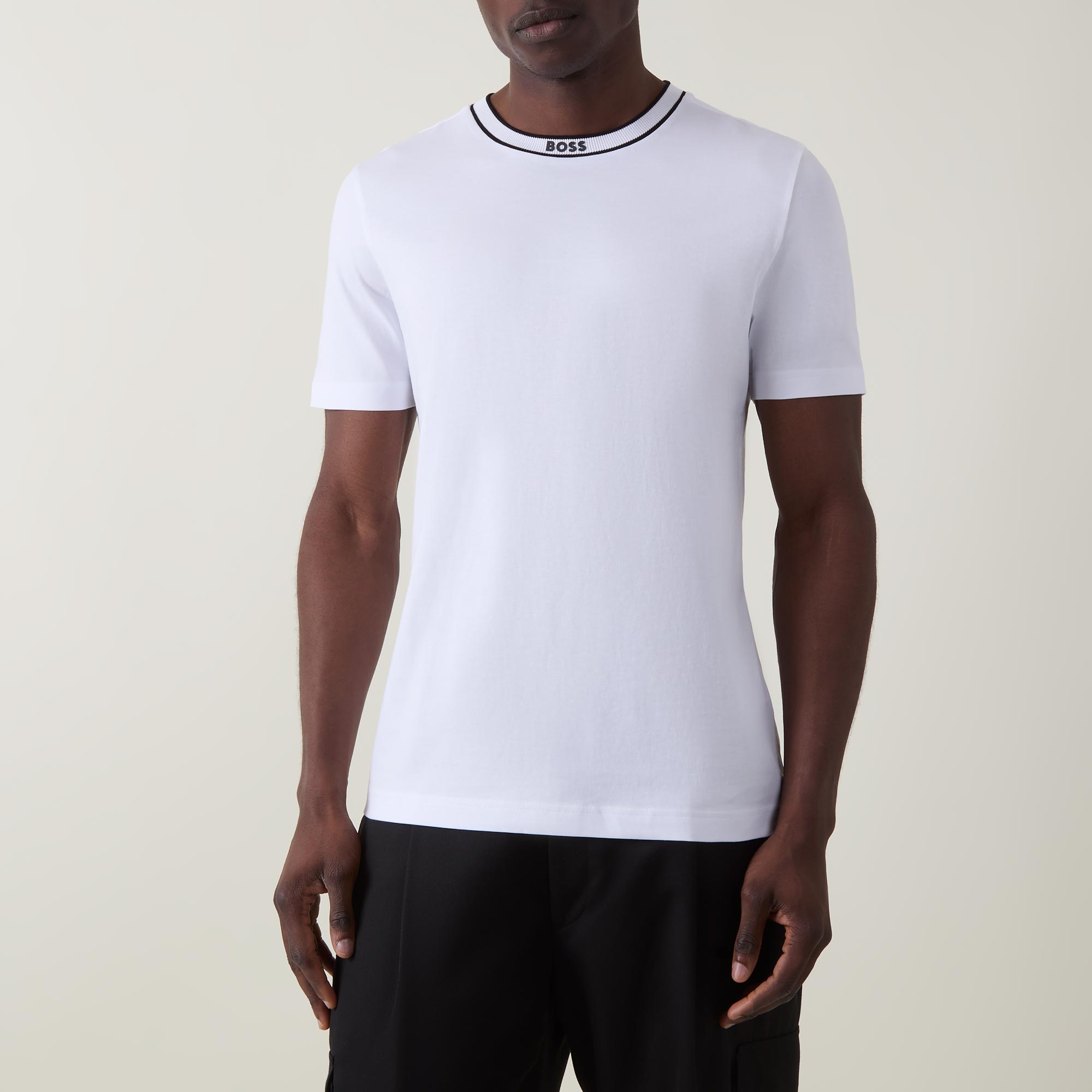- Round neck, short sleeves, straight hemline, logo detail on neckline