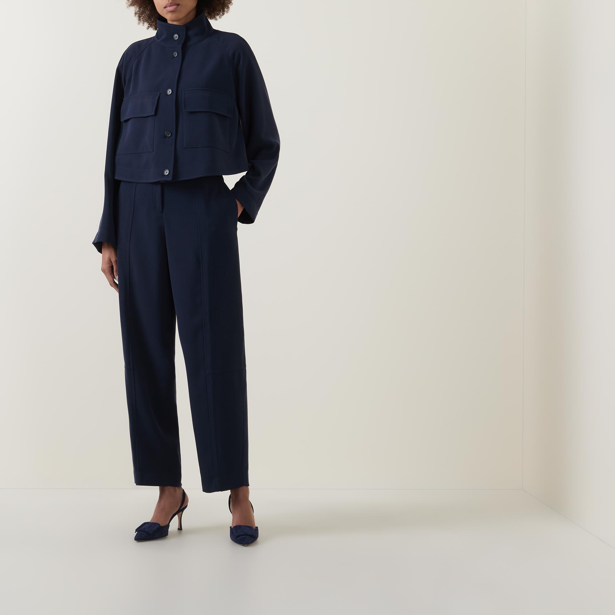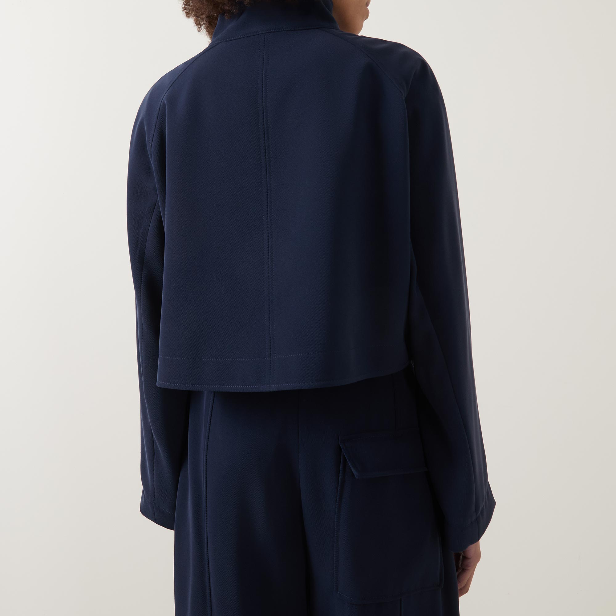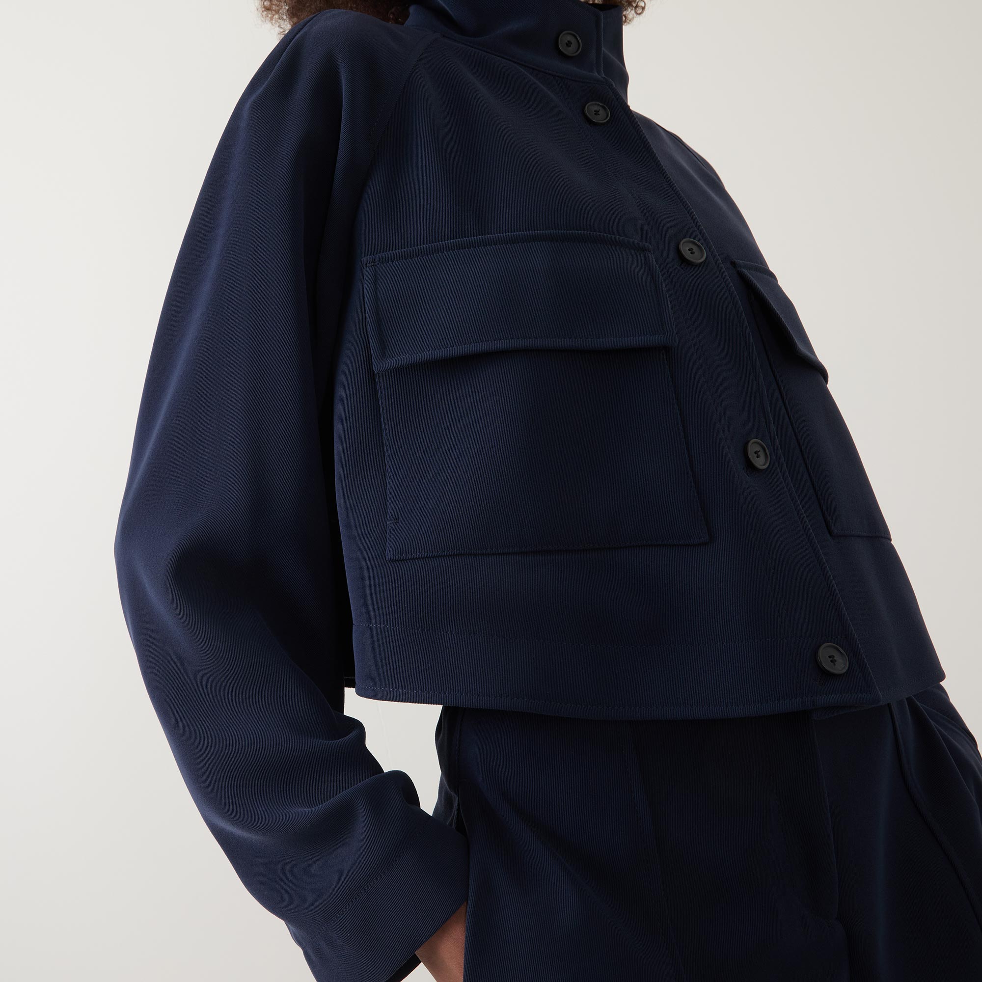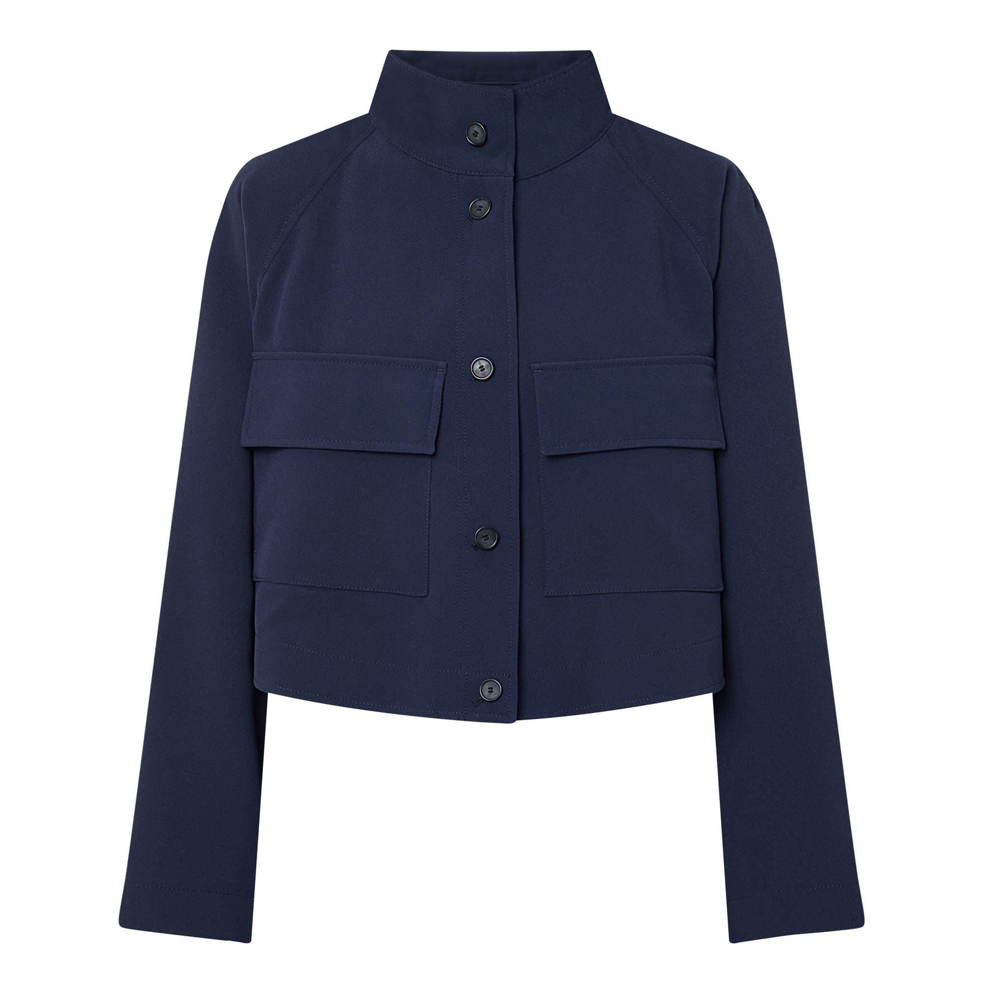 • Standing collar, button fastening, flap pockets, wrinkle-resistant, soft and drapey crepe fabric