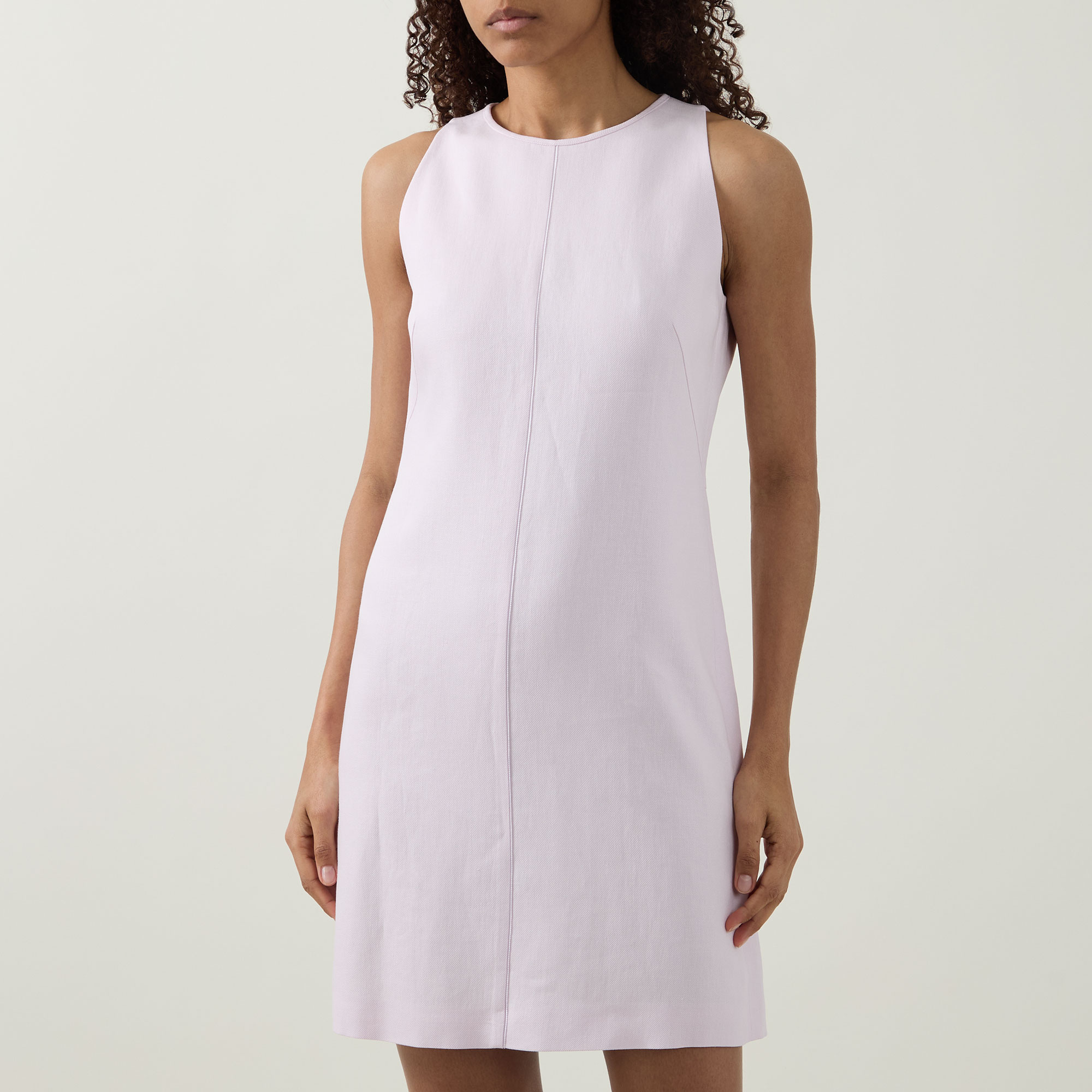 - High round neckline, sleeveless design, rear zip fastening, fitted through the waist and hips, straight hem, tonal stitching, mini length, shift silhouette