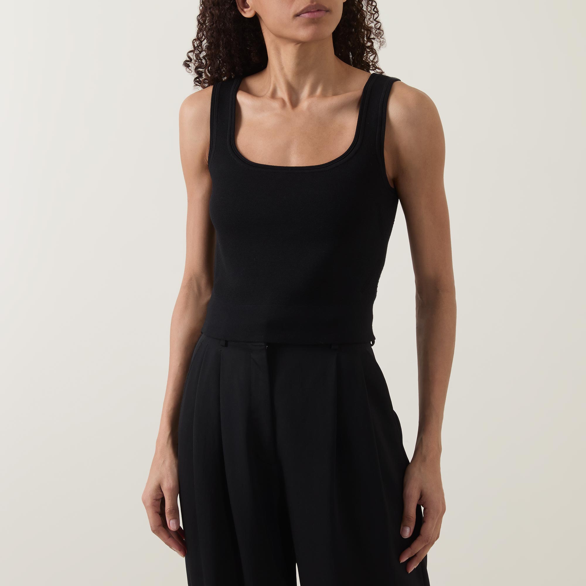 - Scoop neckline, wide tank straps, straight hem, cropped length, smooth finish
