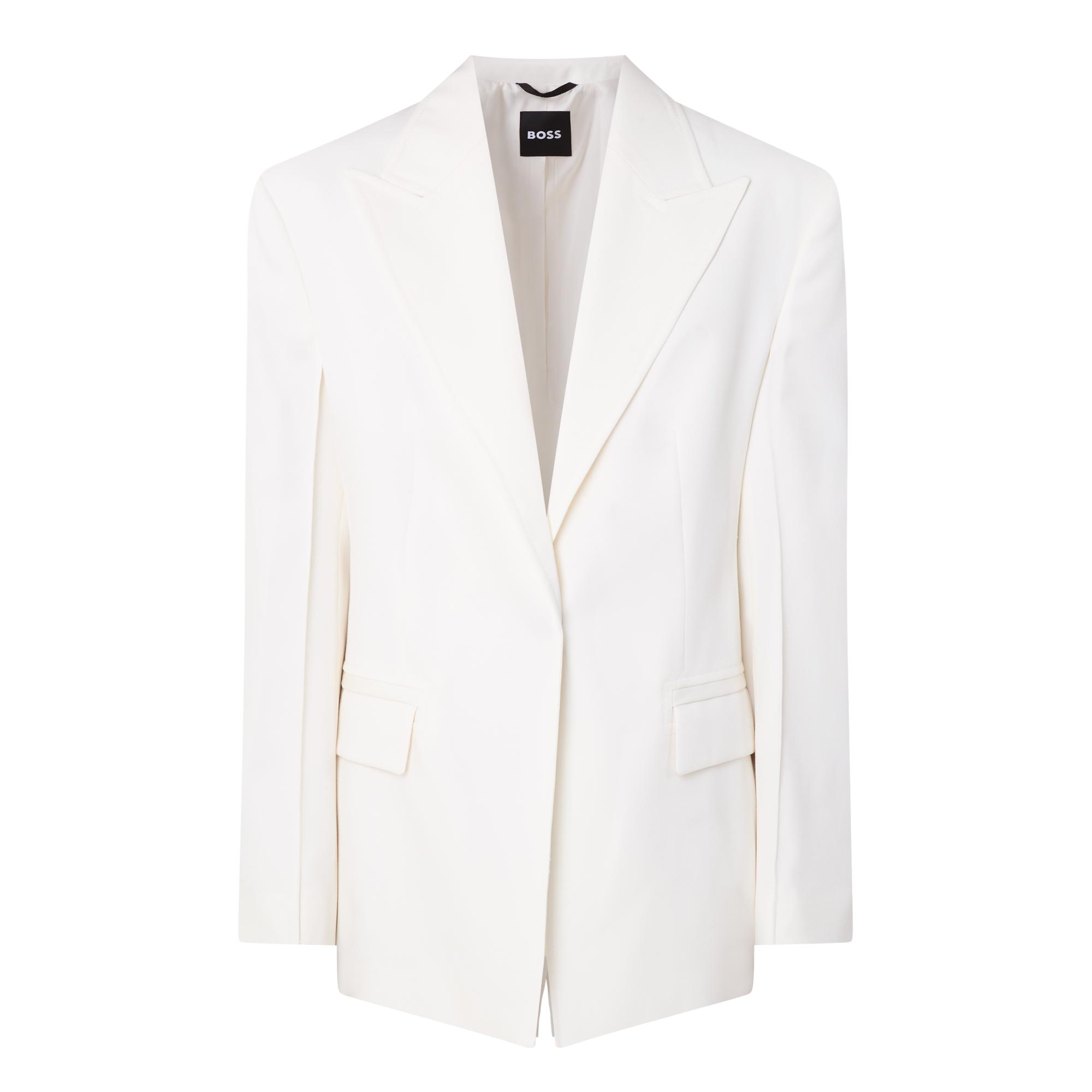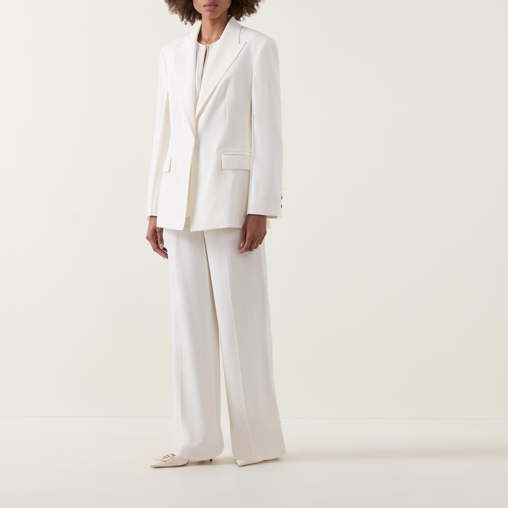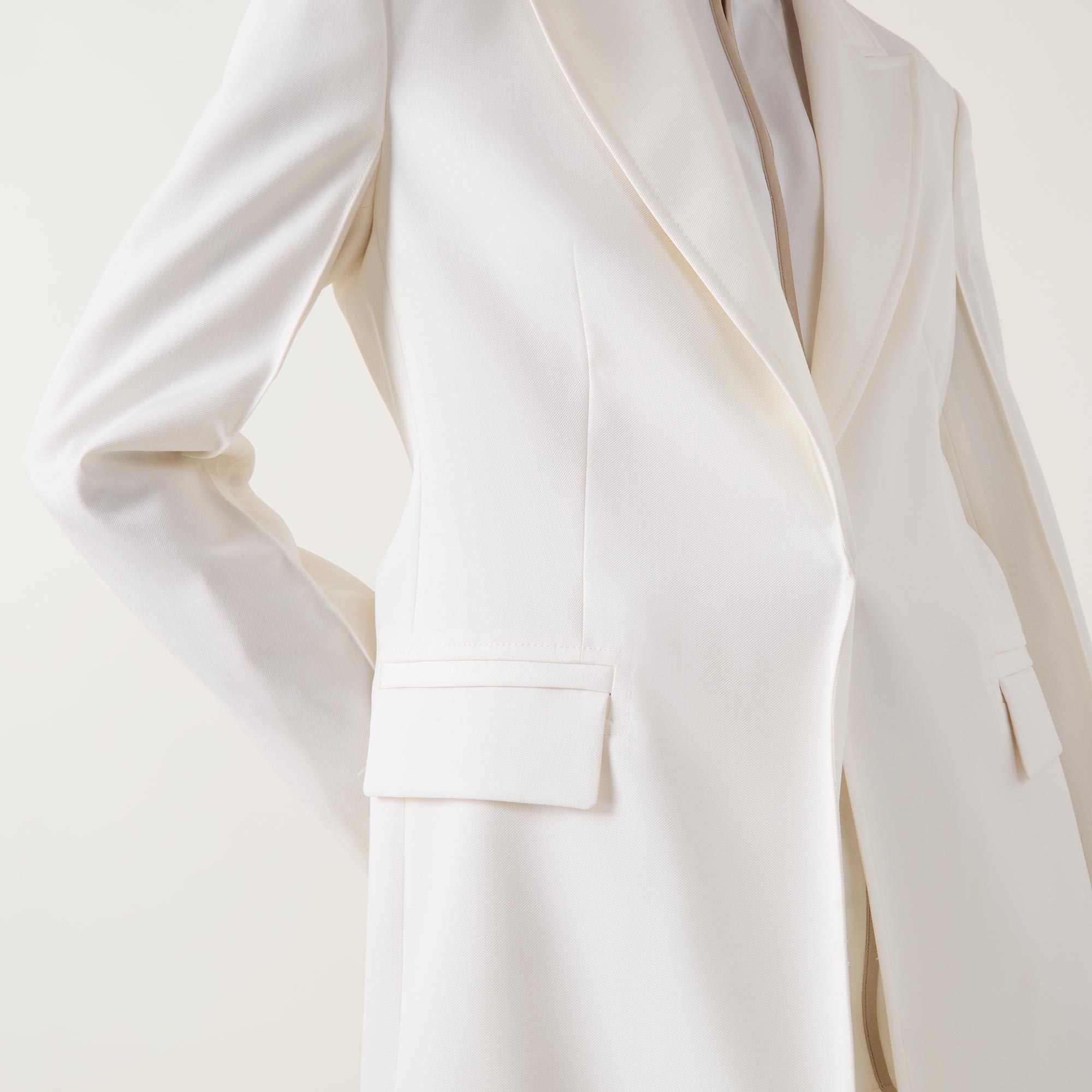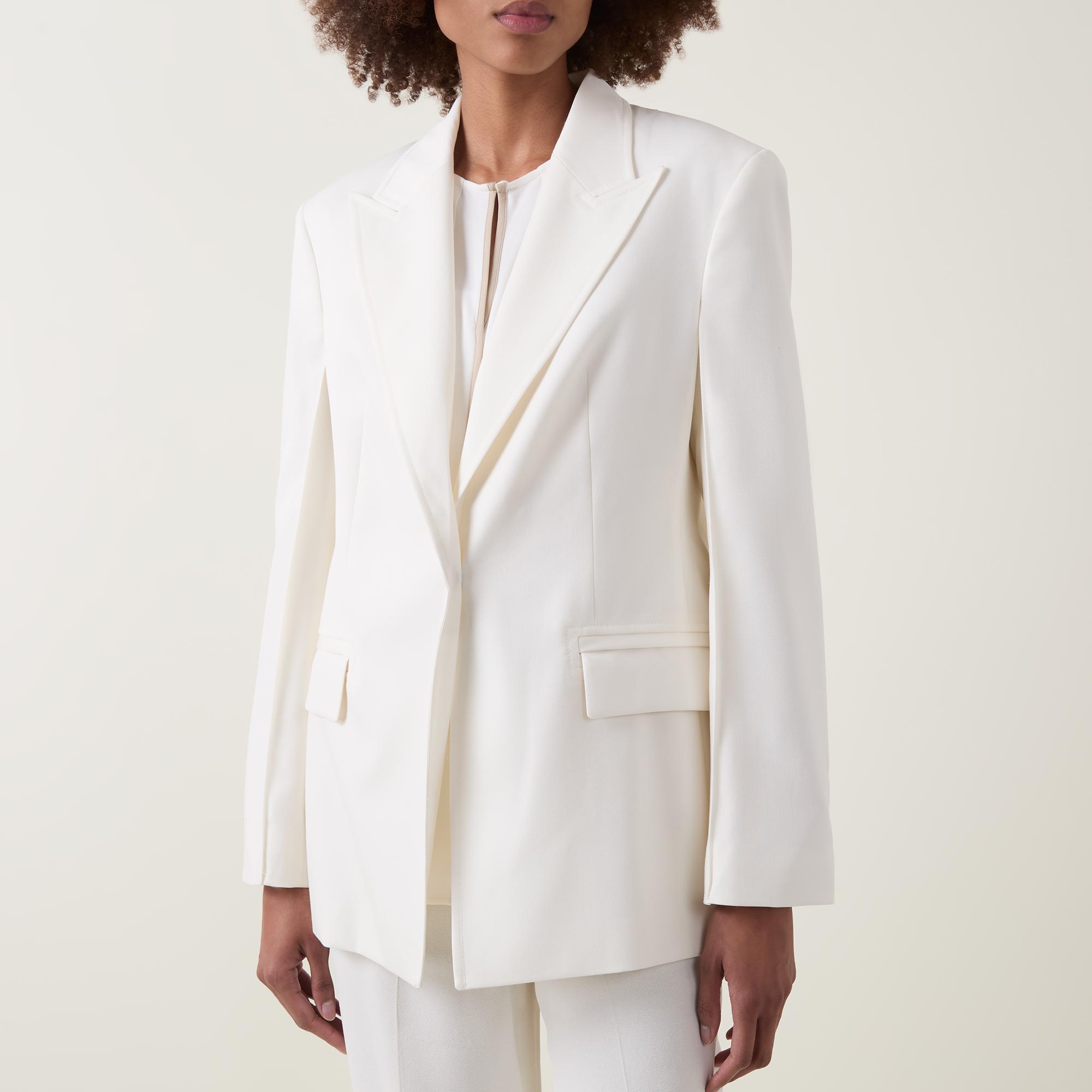 - Single-breasted, peaked lapels, concealed button fastening, flap pockets, extended vent to the back, contrast buttons at cuffs, darting details