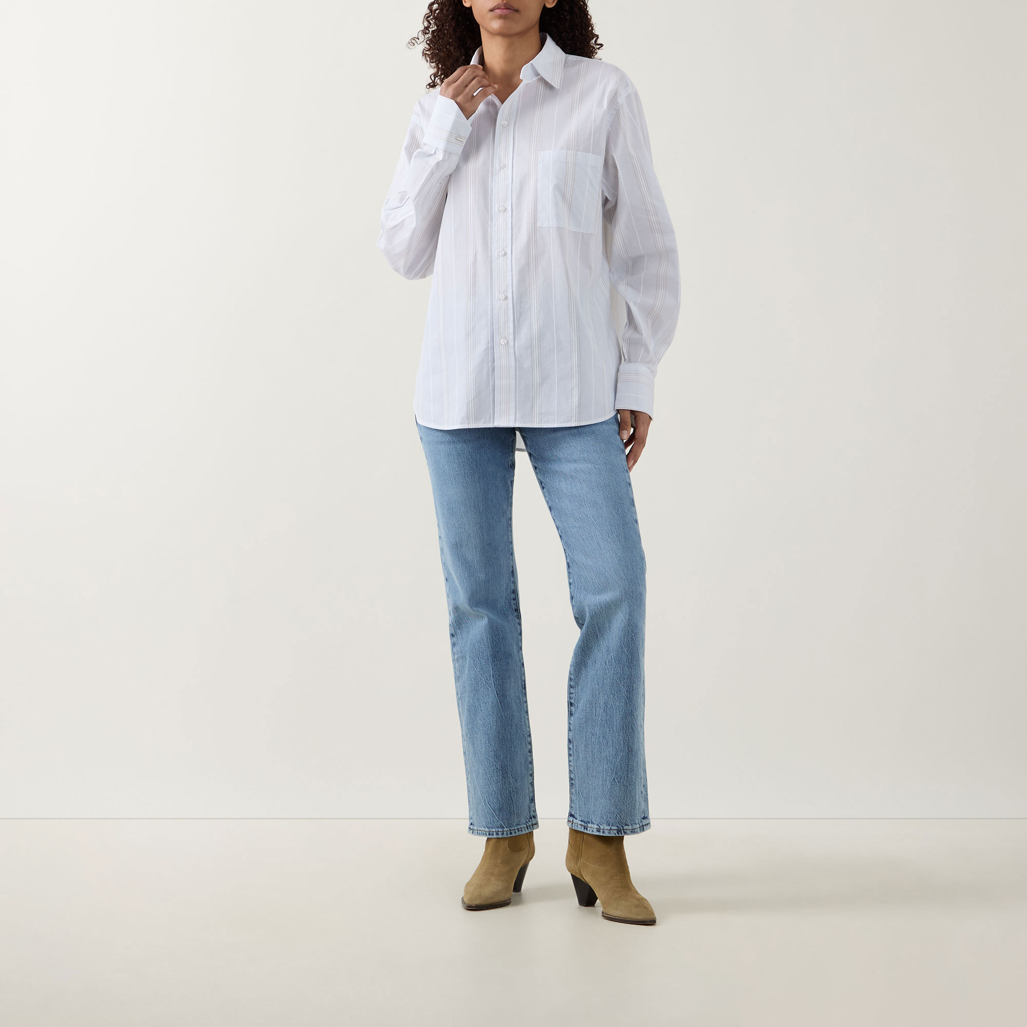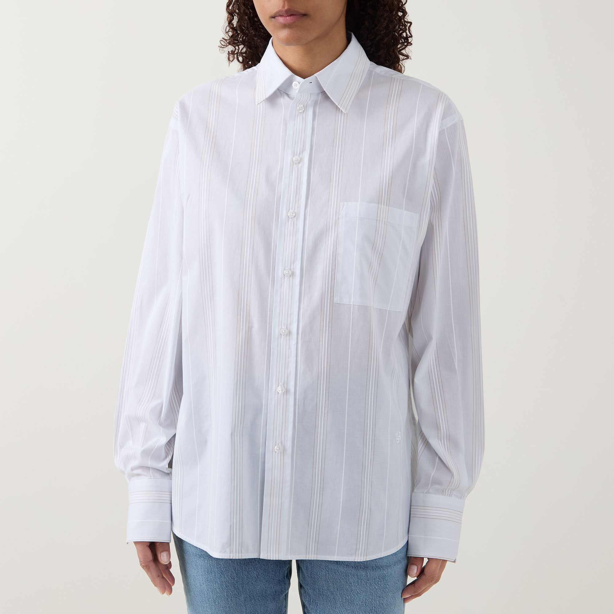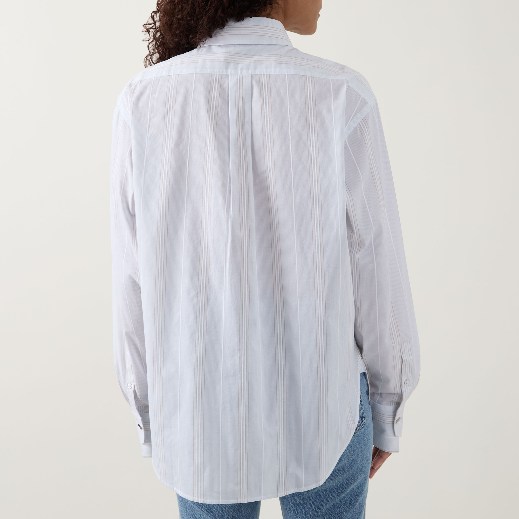 - Point collar, dropped shoulders, long sleeves, buttoned cuffs, front button placket, one chest patch pocket, curved hem, rear box pleat, striped pattern, breathable