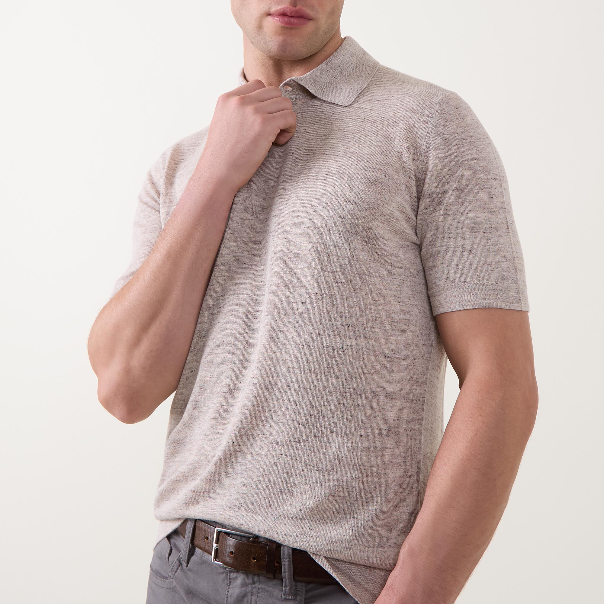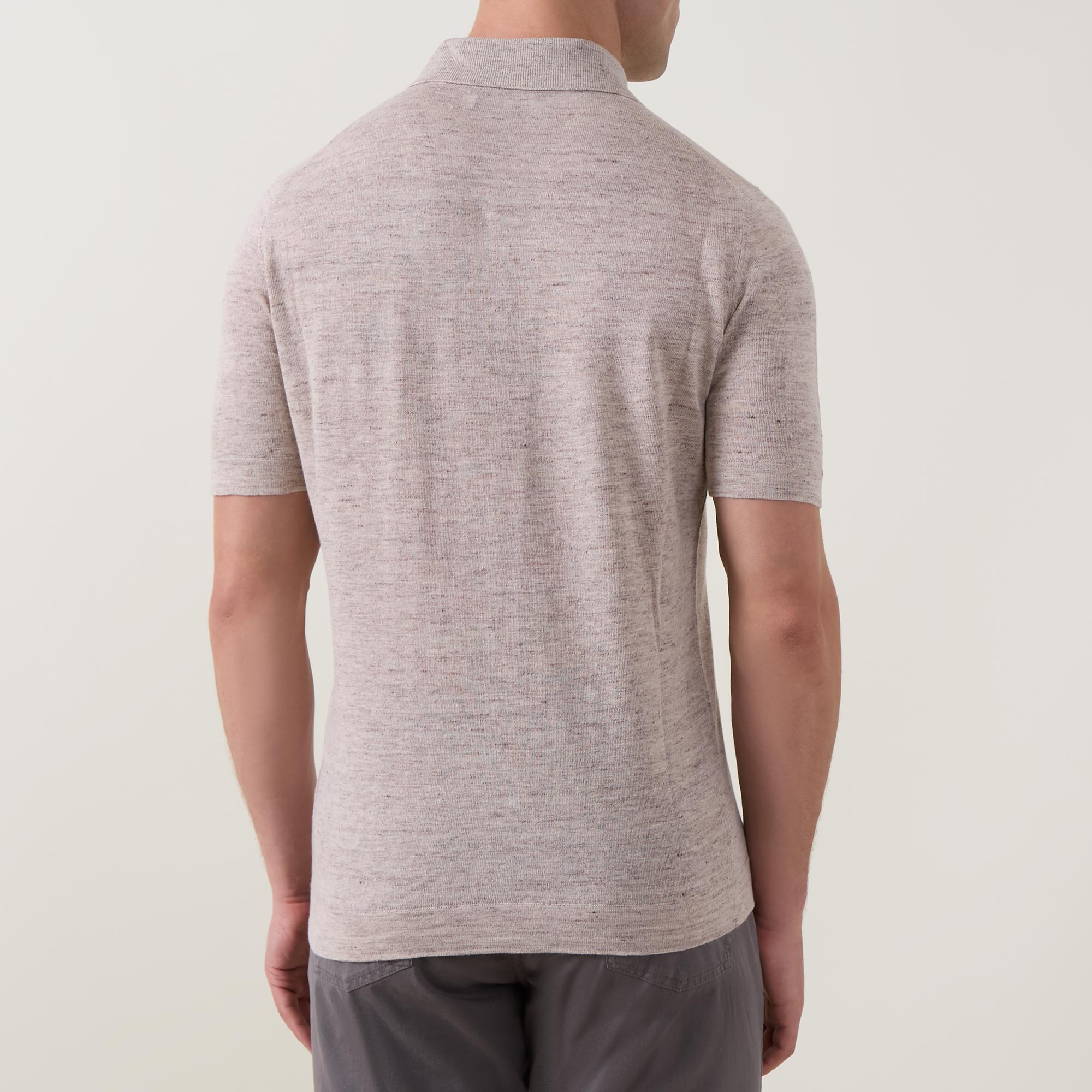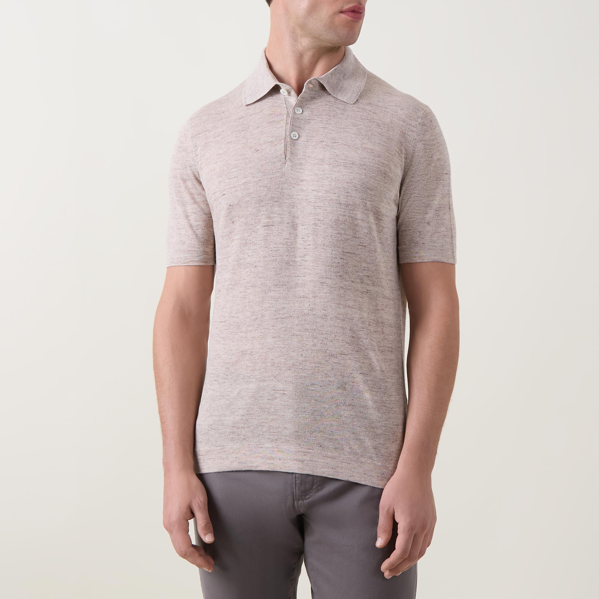 - Polo collar, three-button placket, short sleeves, straight hem, textured finish