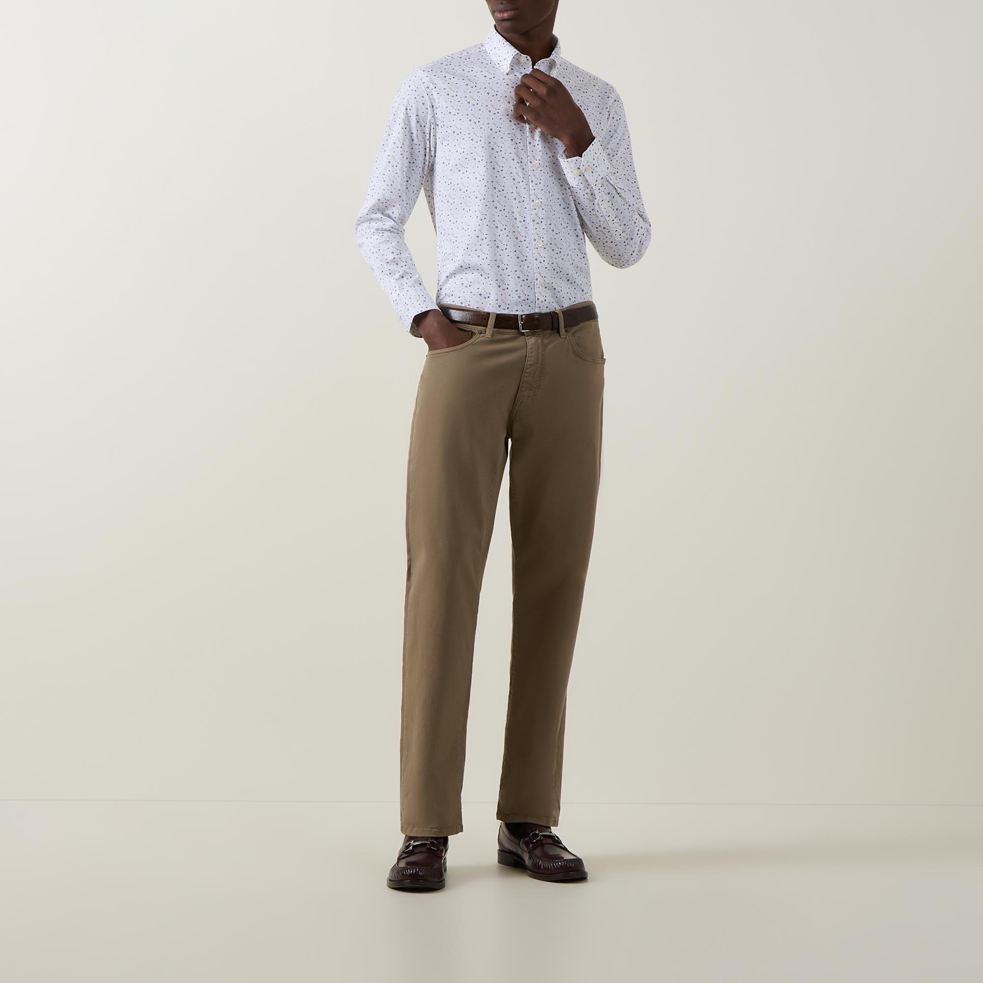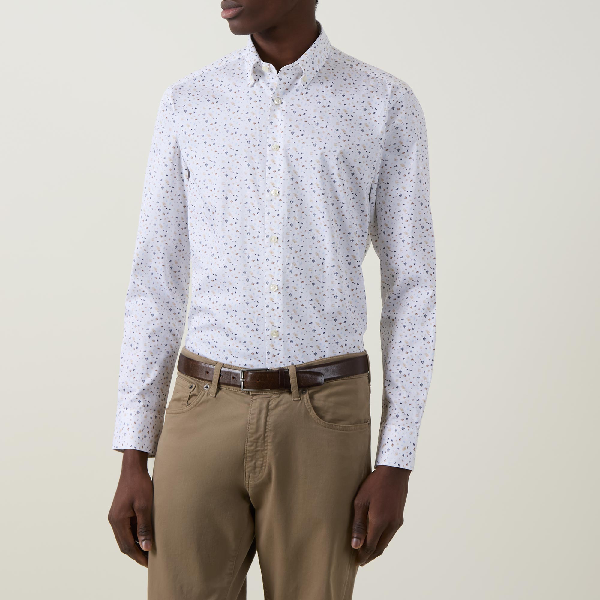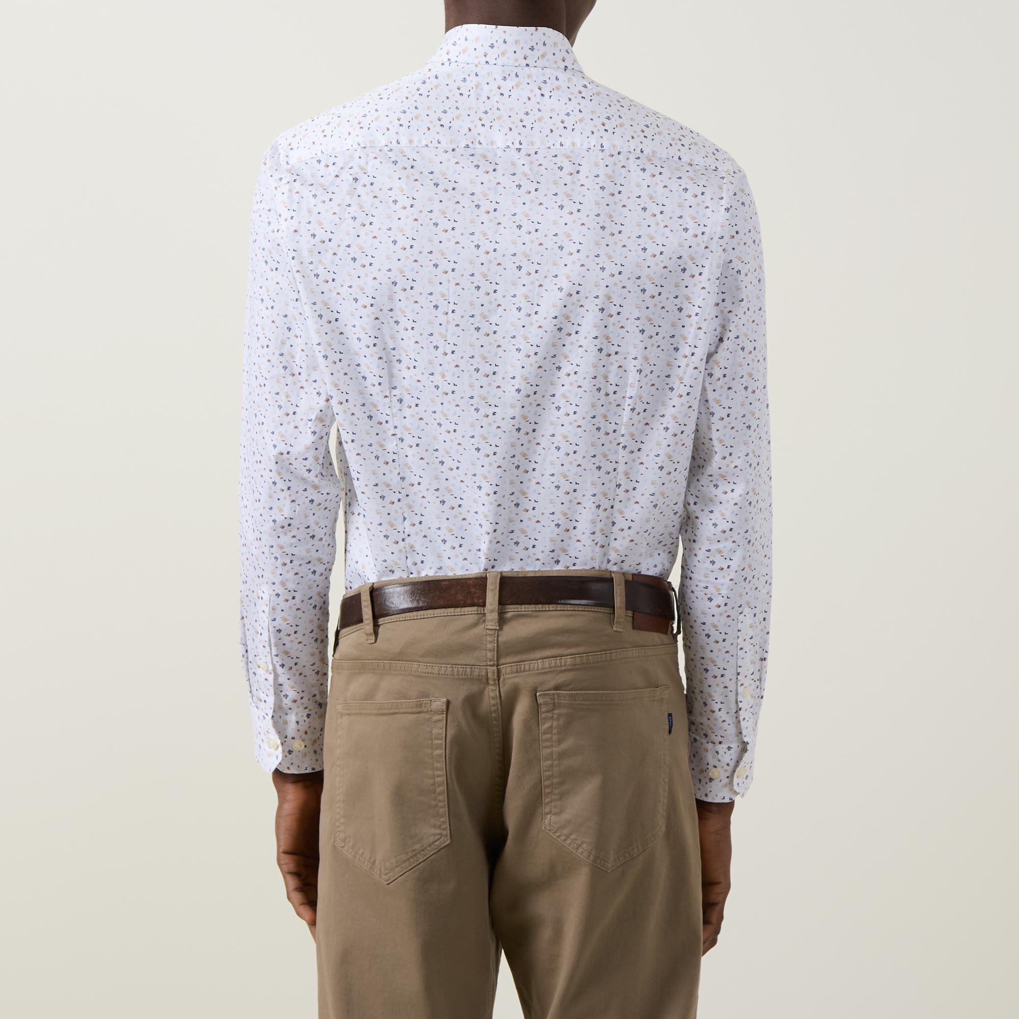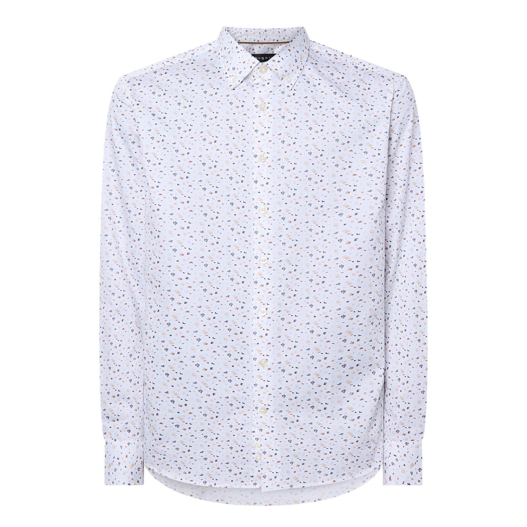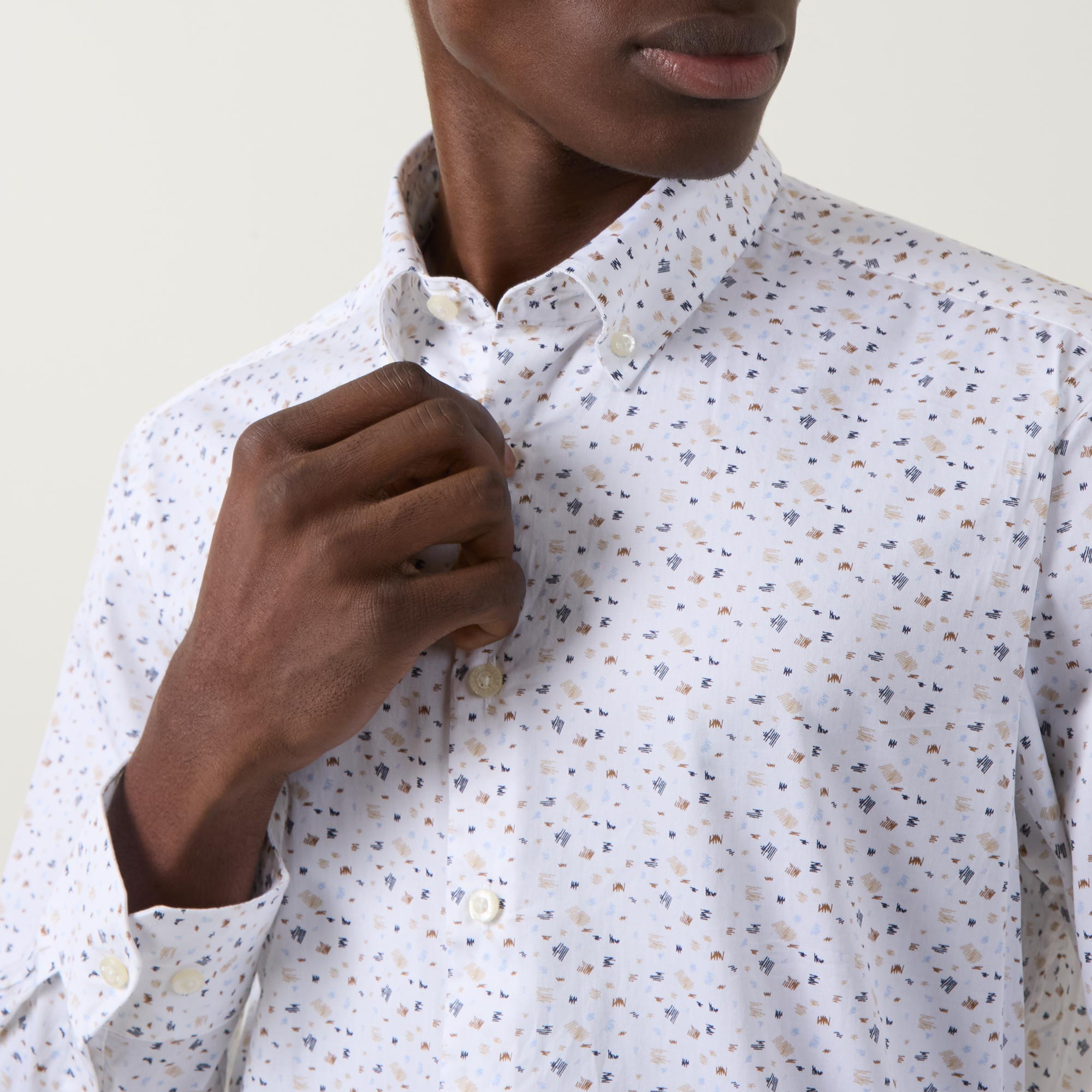 • Point collar, long sleeves, front button placket, geometric pattern, single-button cuffs, darting to the back, tonal stitching, curved hemline, smooth fabric