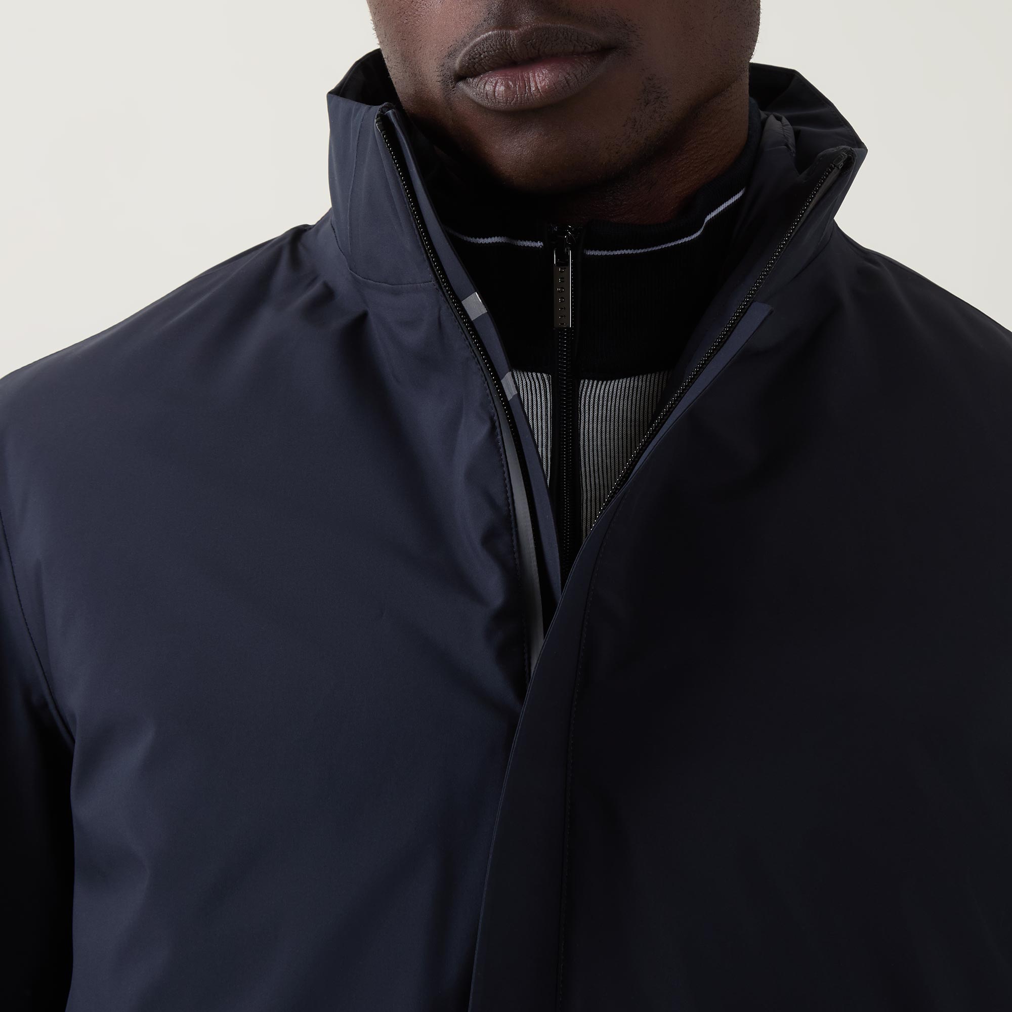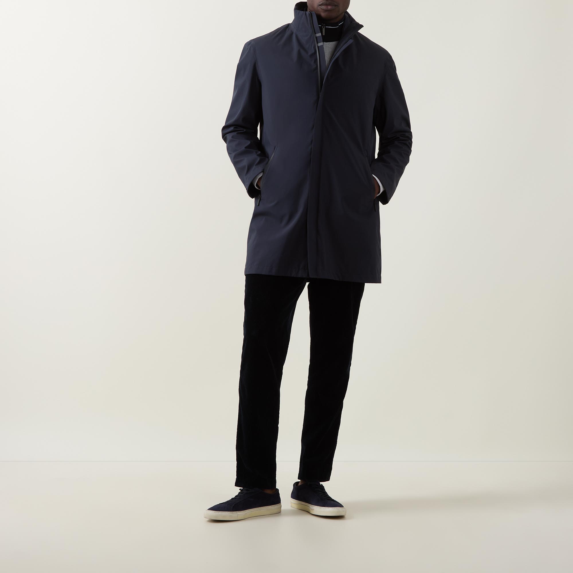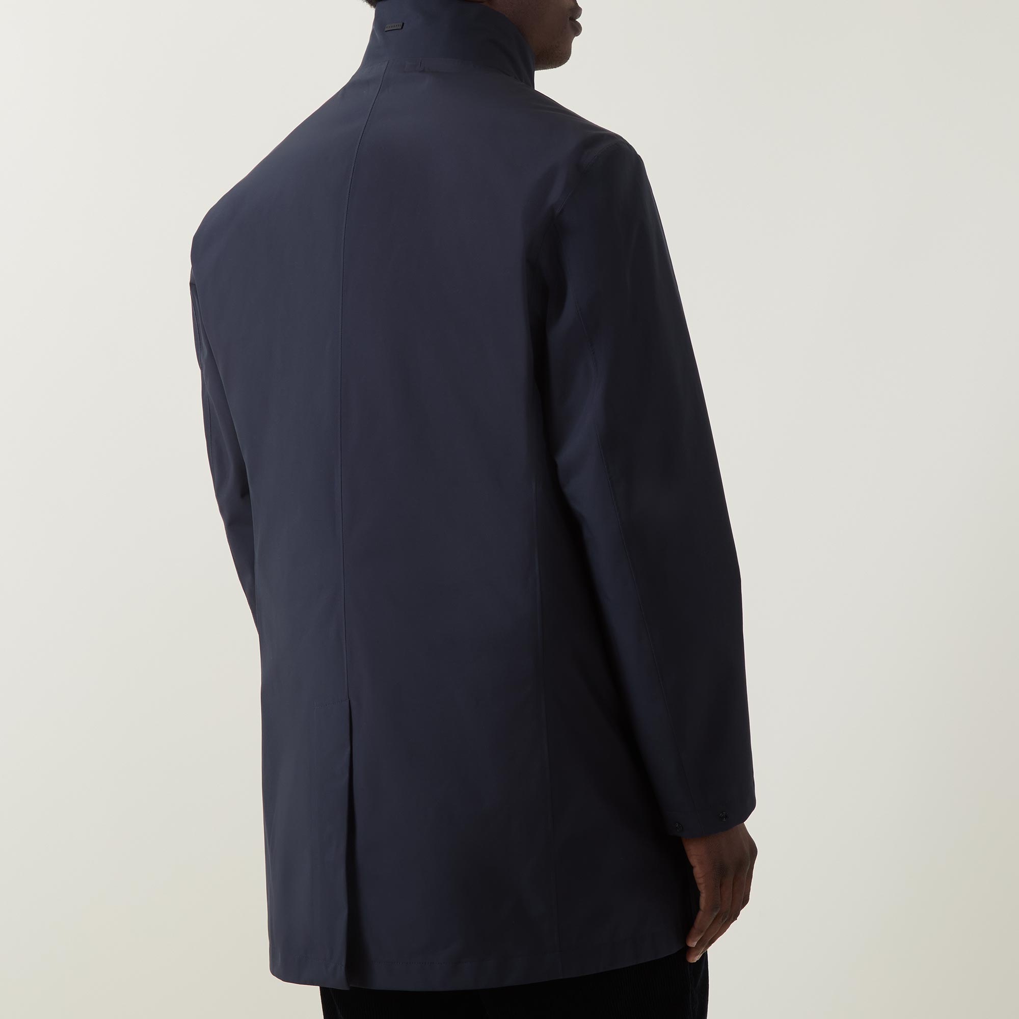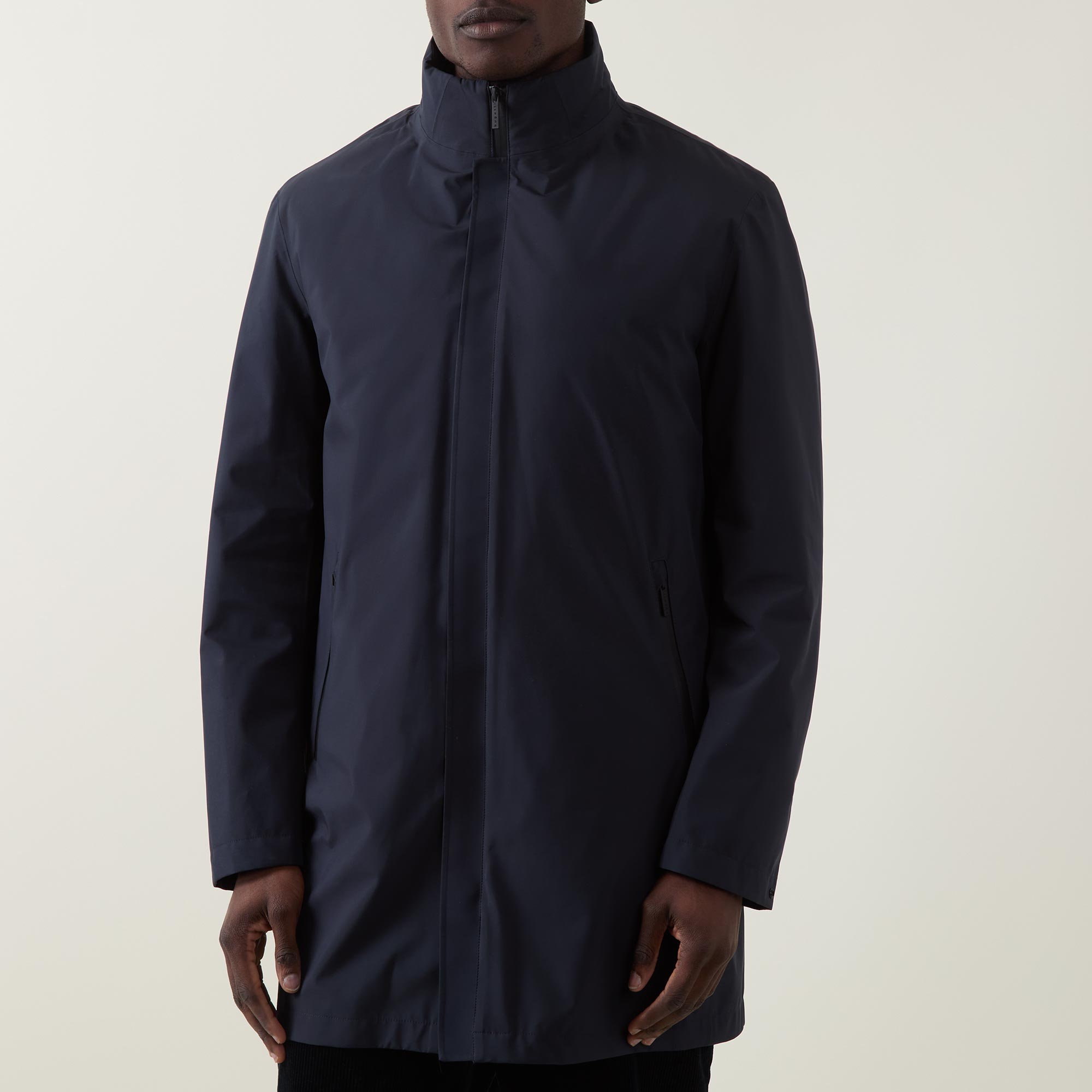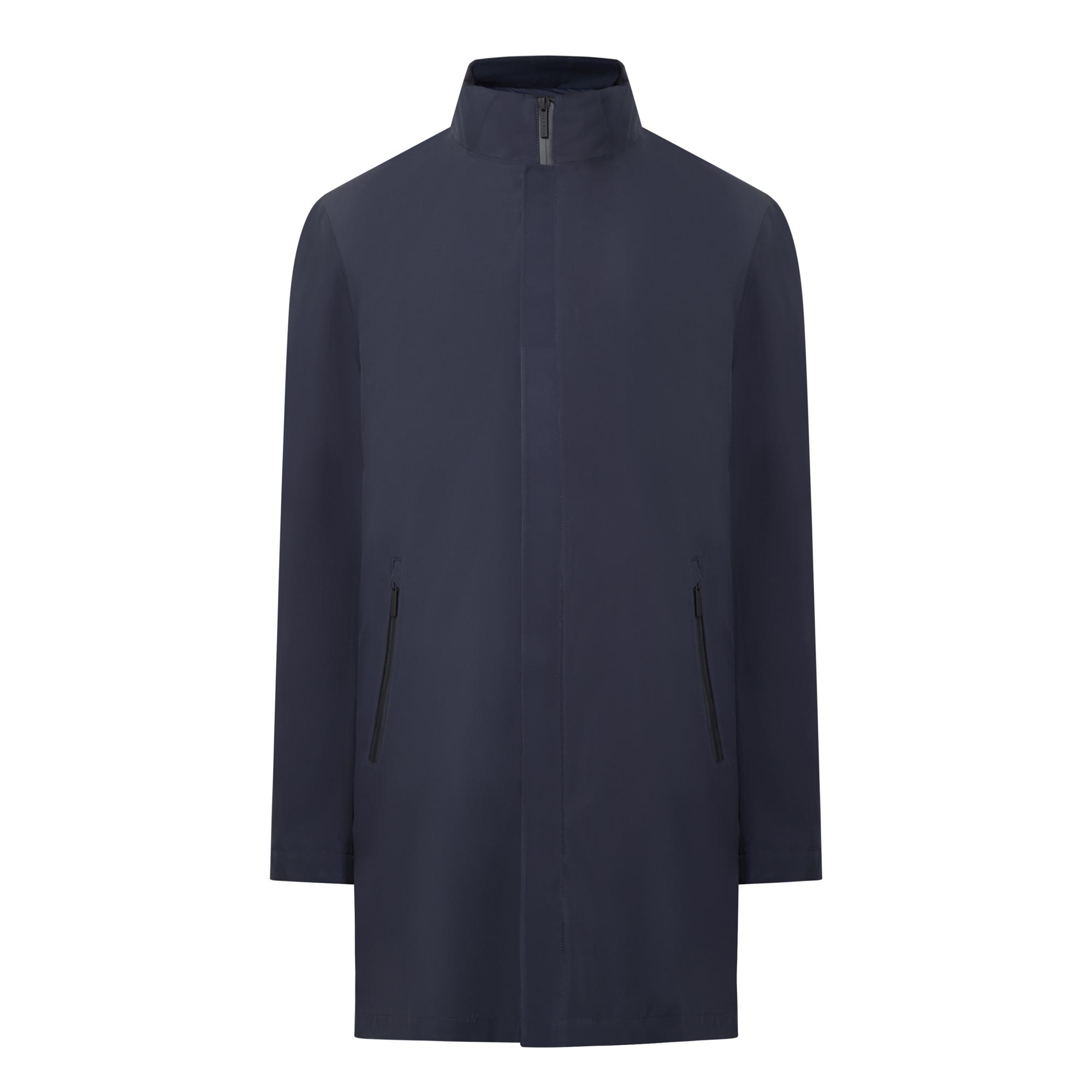 - Funnel neckline, concealed zip fastening, long sleeves, straight hemline, vent to the rear, pockets, logo details
