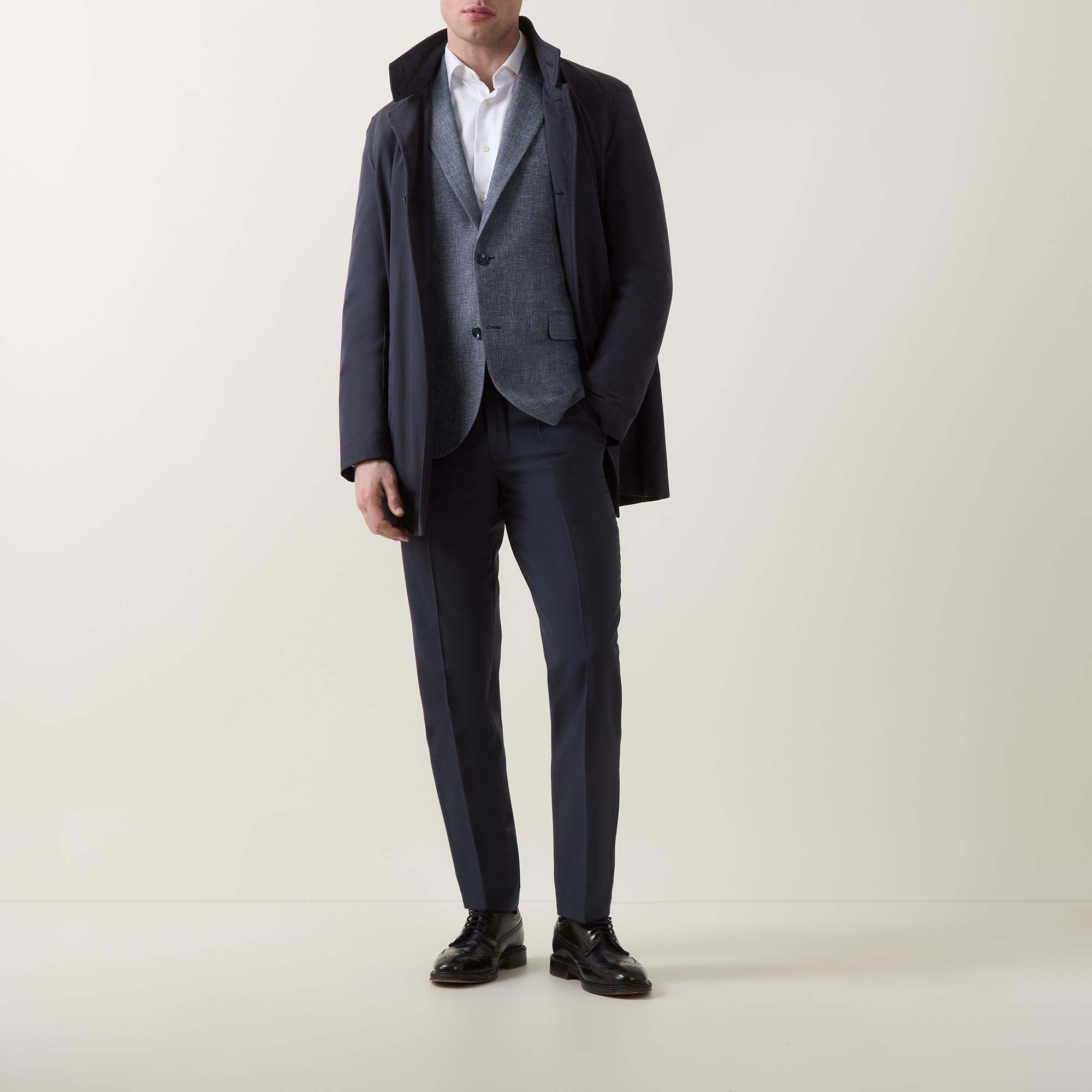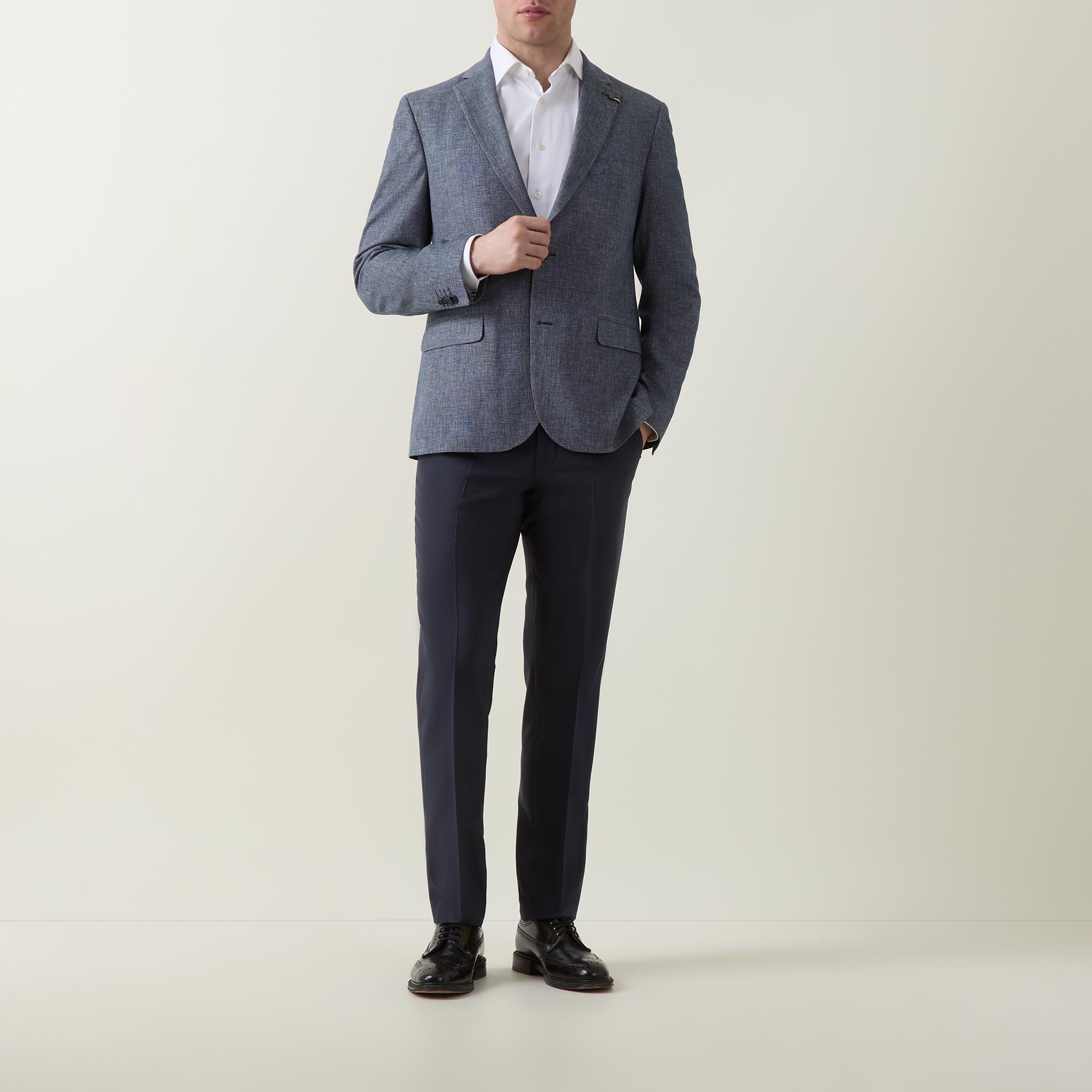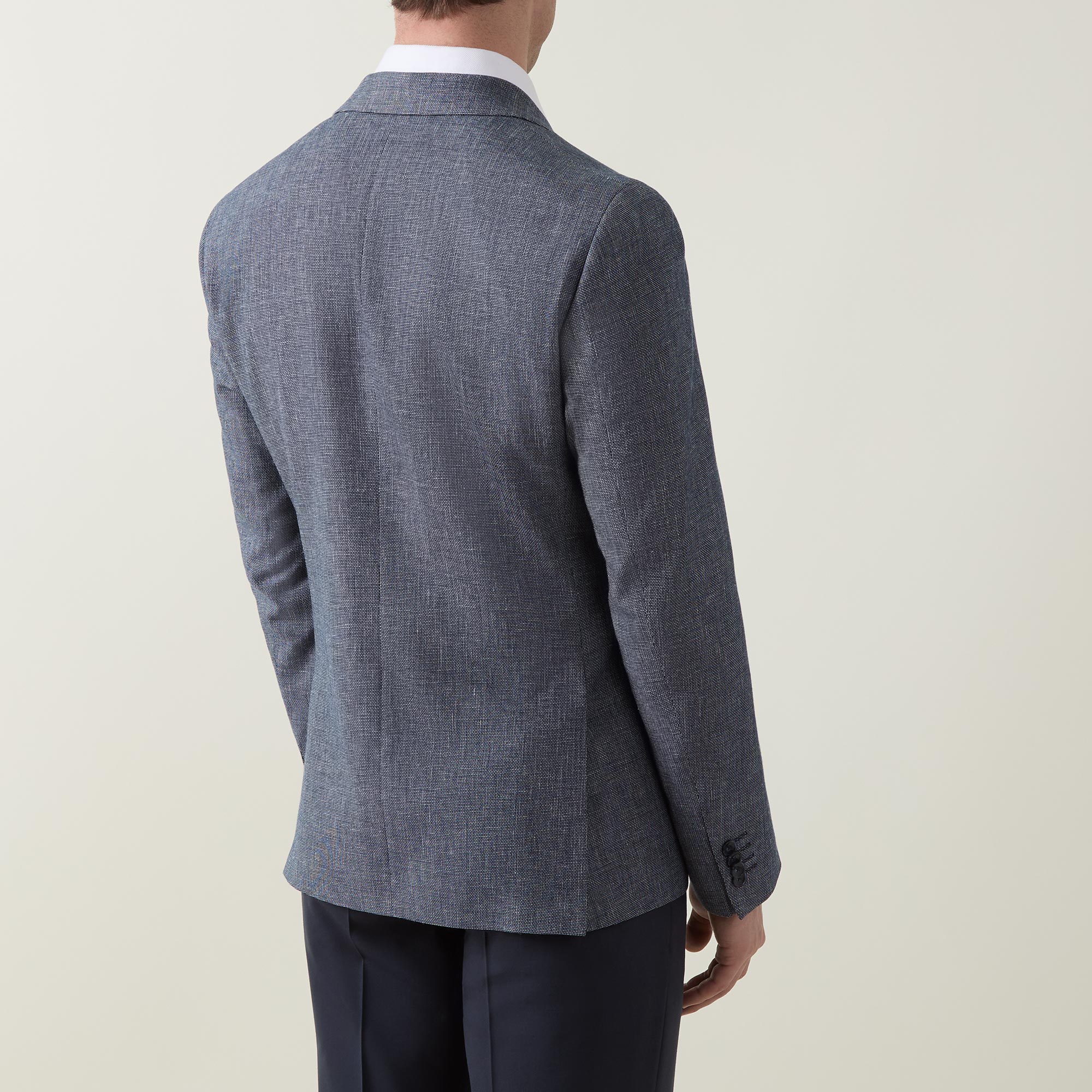 • Single breasted, notch lapel collar, long sleeves, buttoned cuffs, front button fastening, one chest welt pocket, two hip flap pockets, rear vents, textured finish