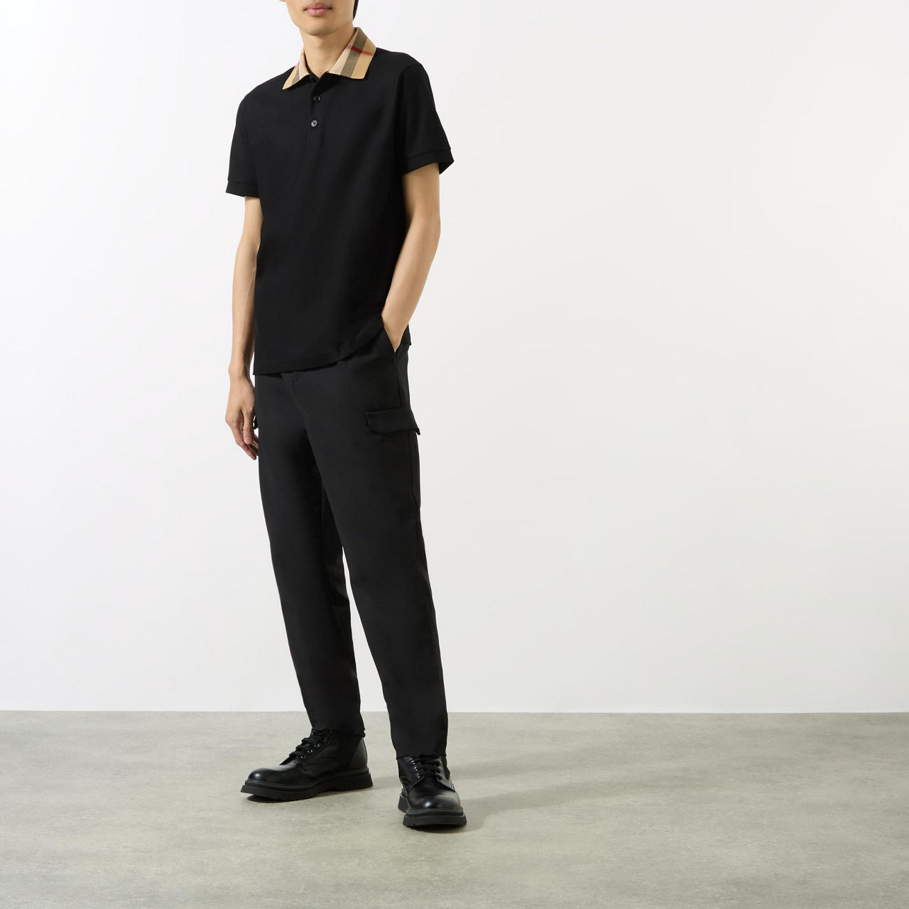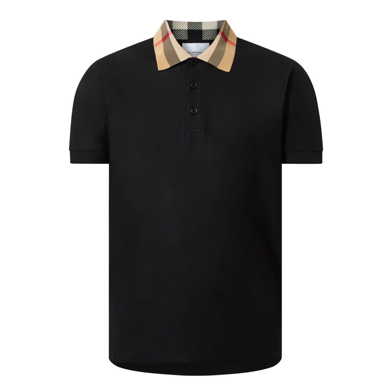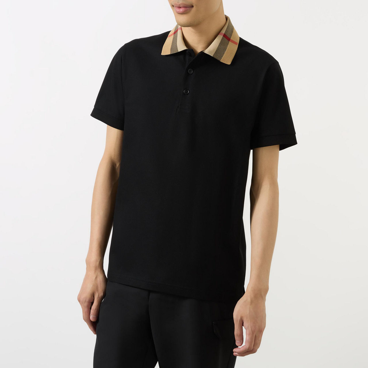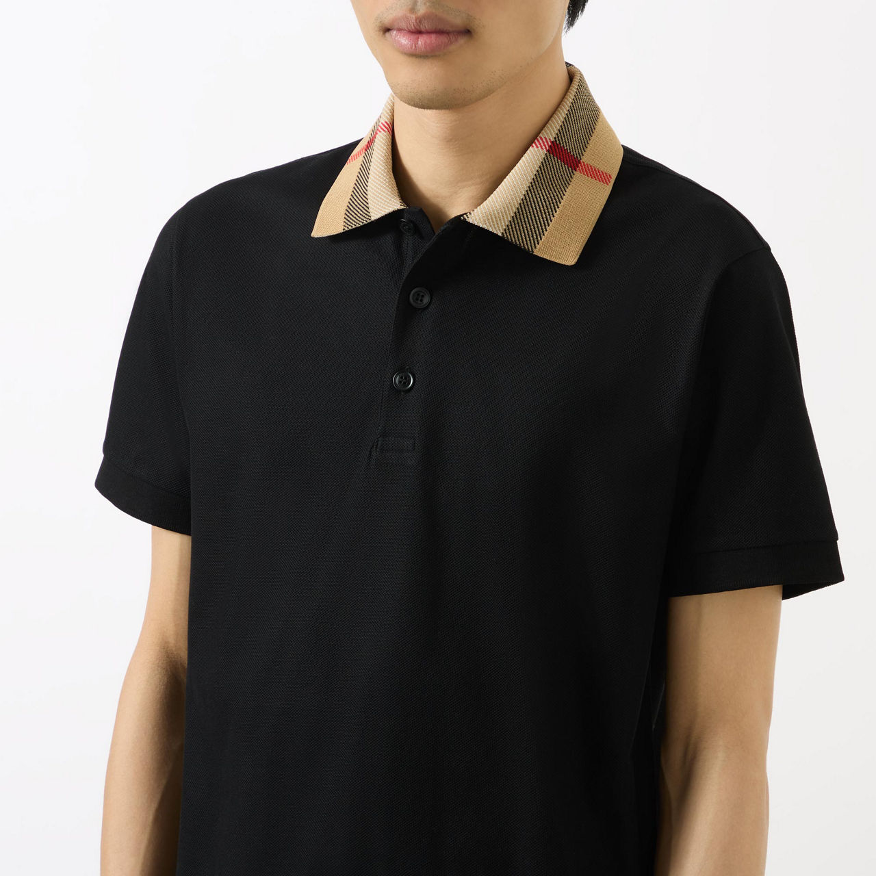 - Contrast collar, check pattern, short sleeves, button fastenings, polo collar