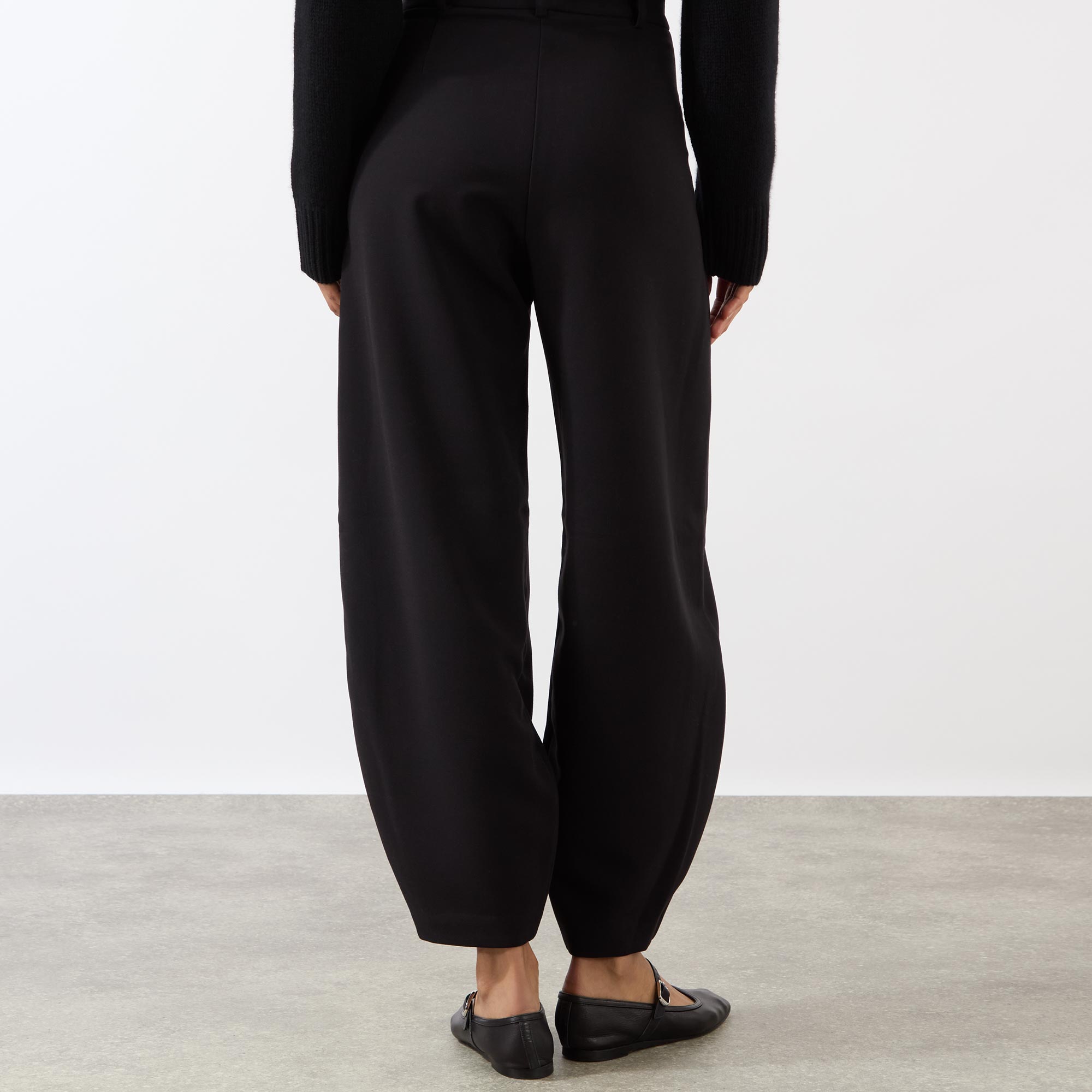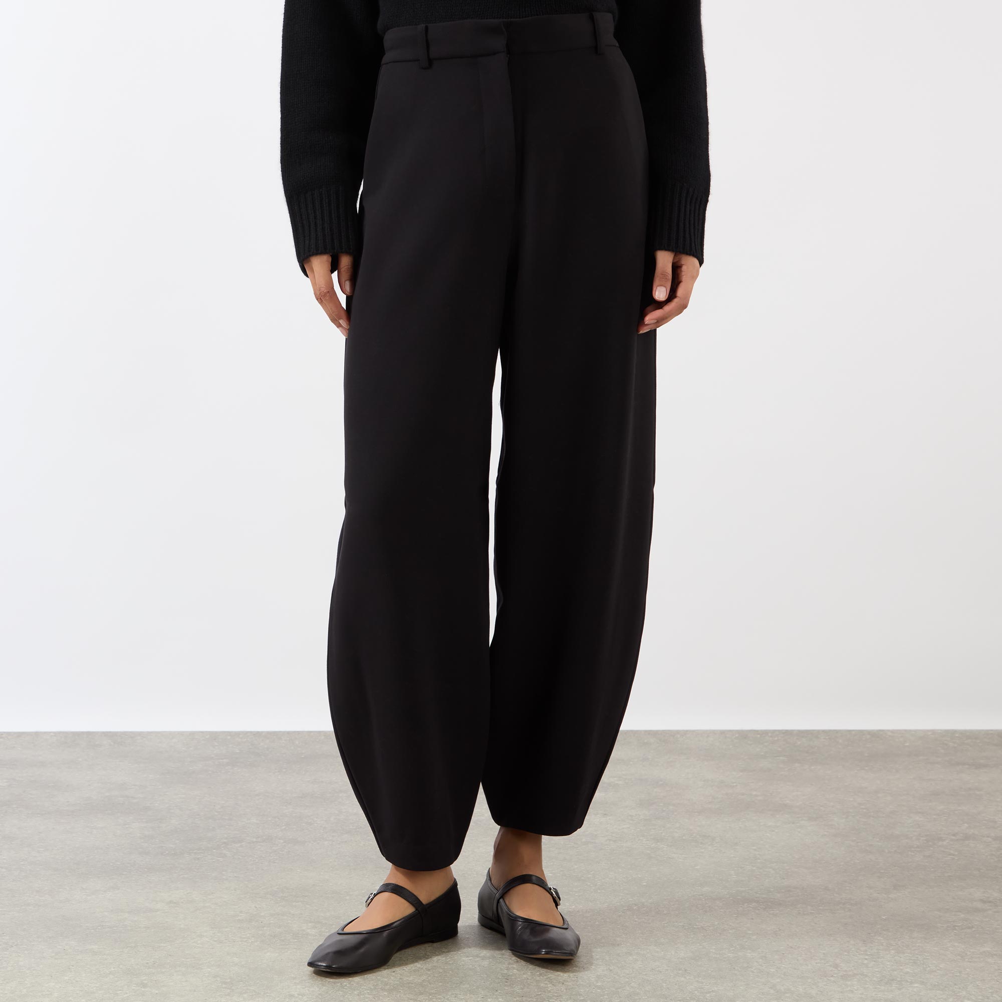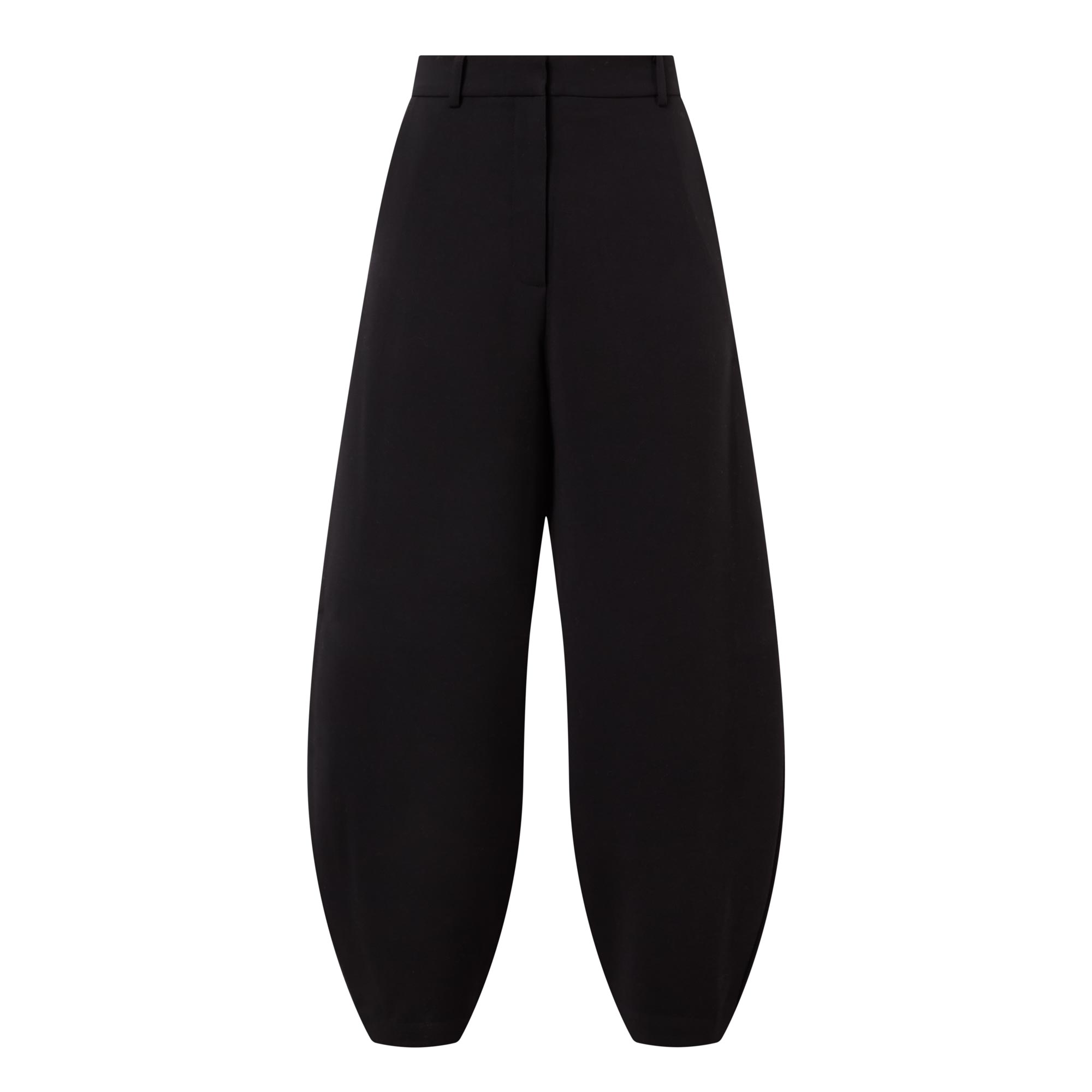 - Barrel silhouette, pressed creases, high waist, belt loops, side pockets, hook and zipper fastening
