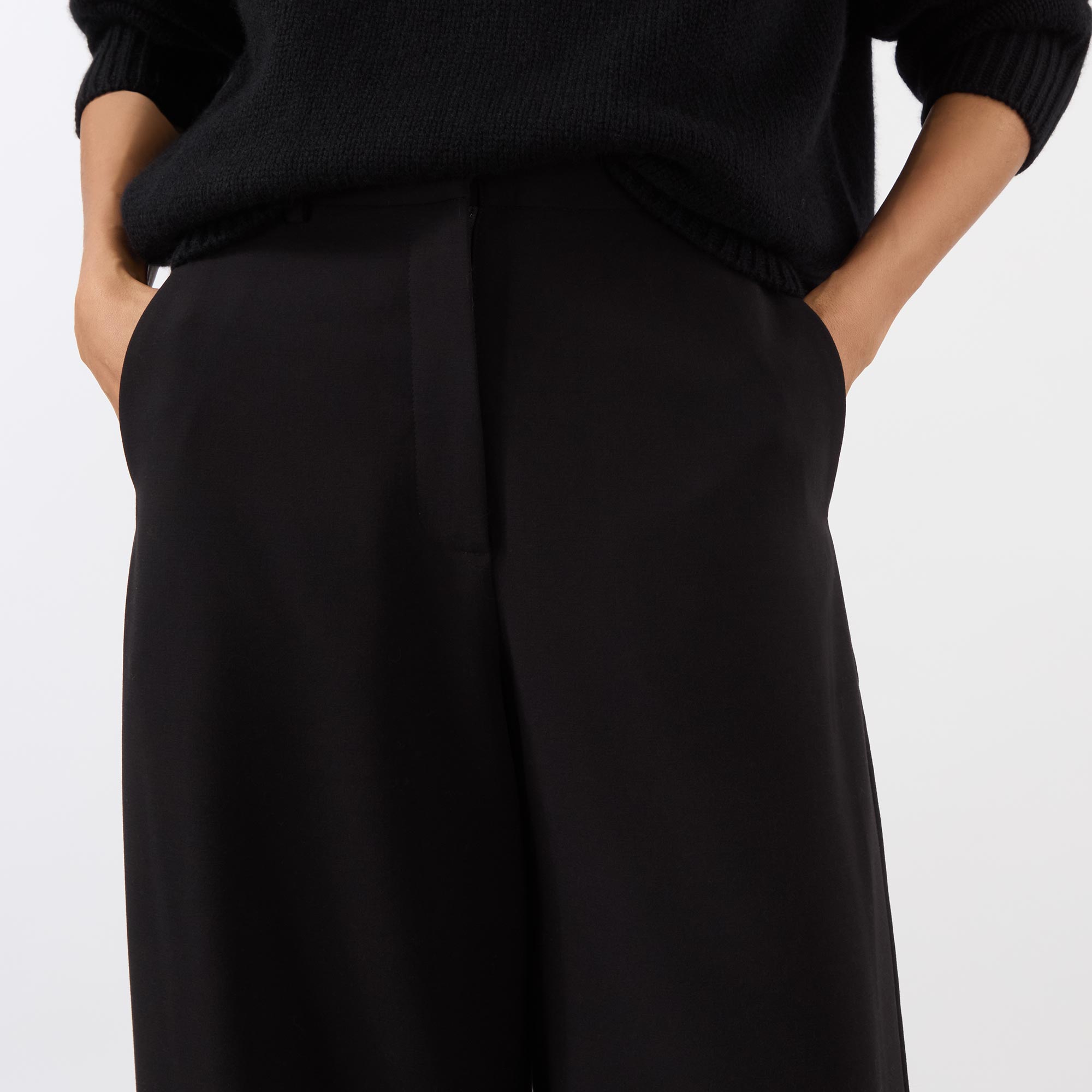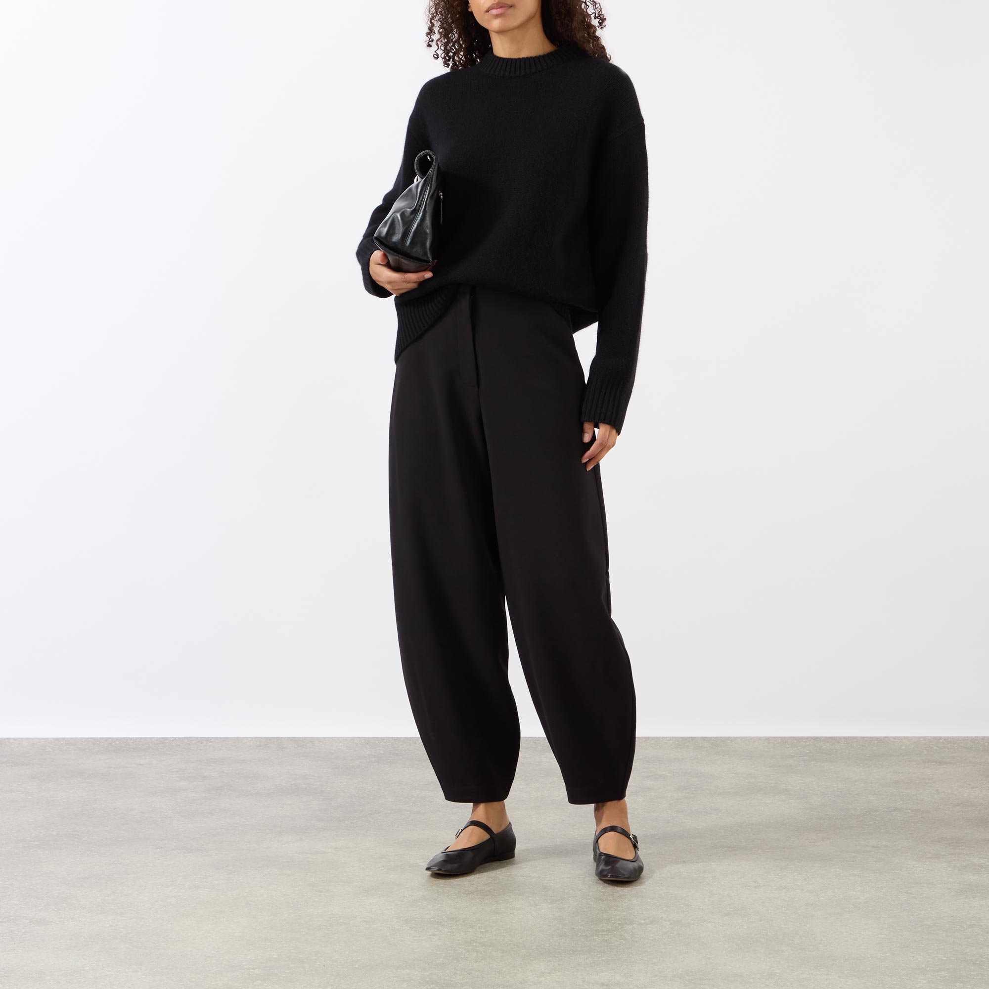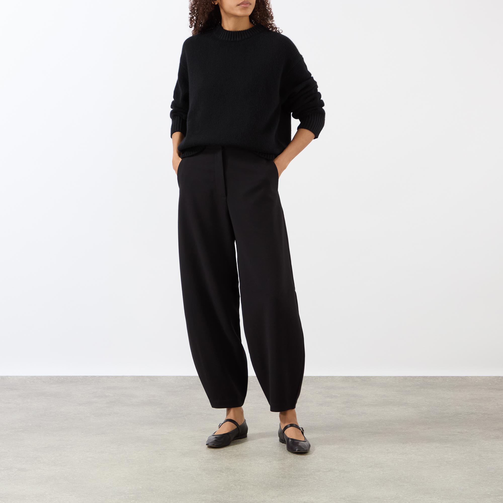- Barrel silhouette, pressed creases, high waist, belt loops, side pockets, hook and zipper fastening