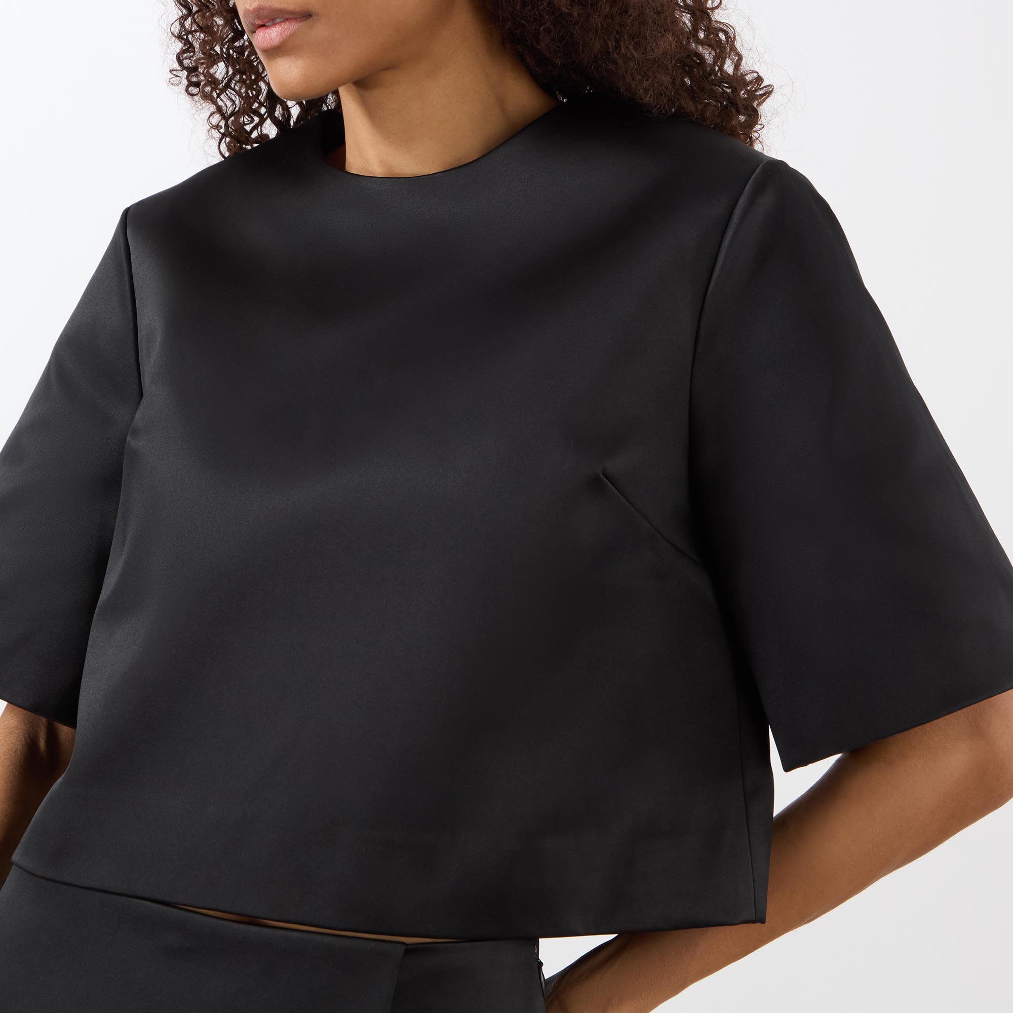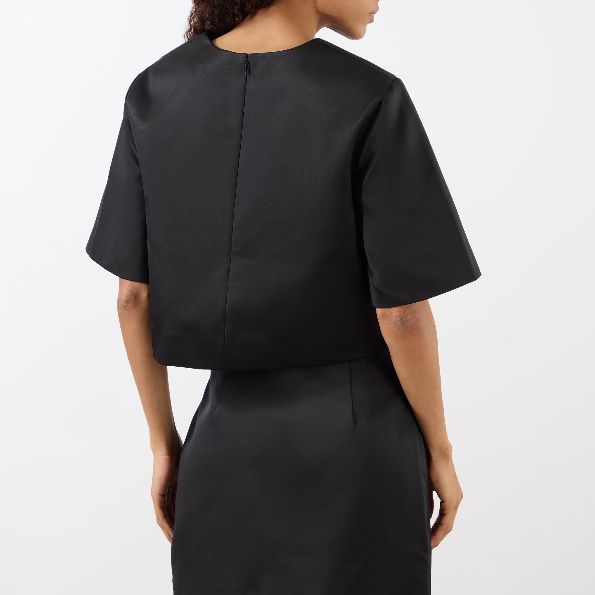 - Cropped, round neckline, zip and hook closure, smooth fabric