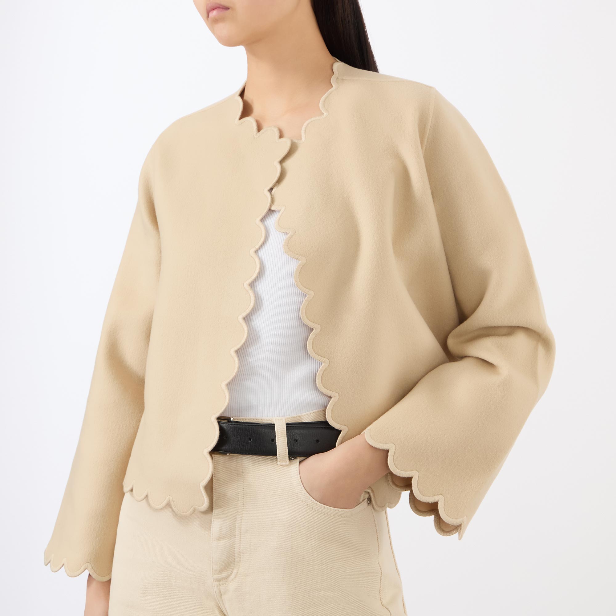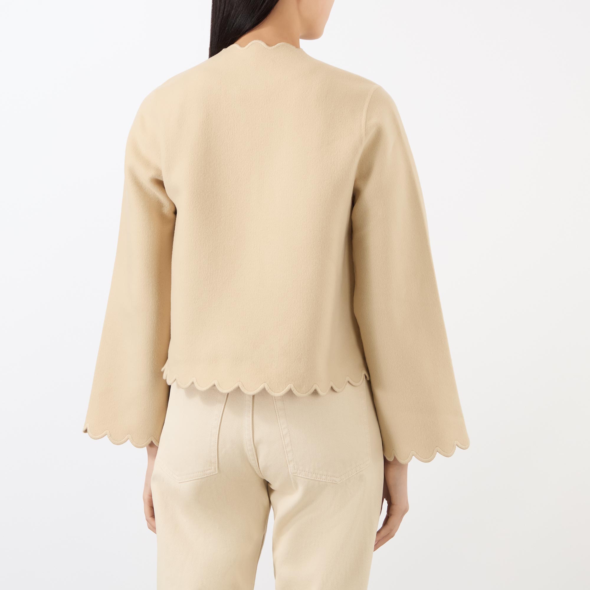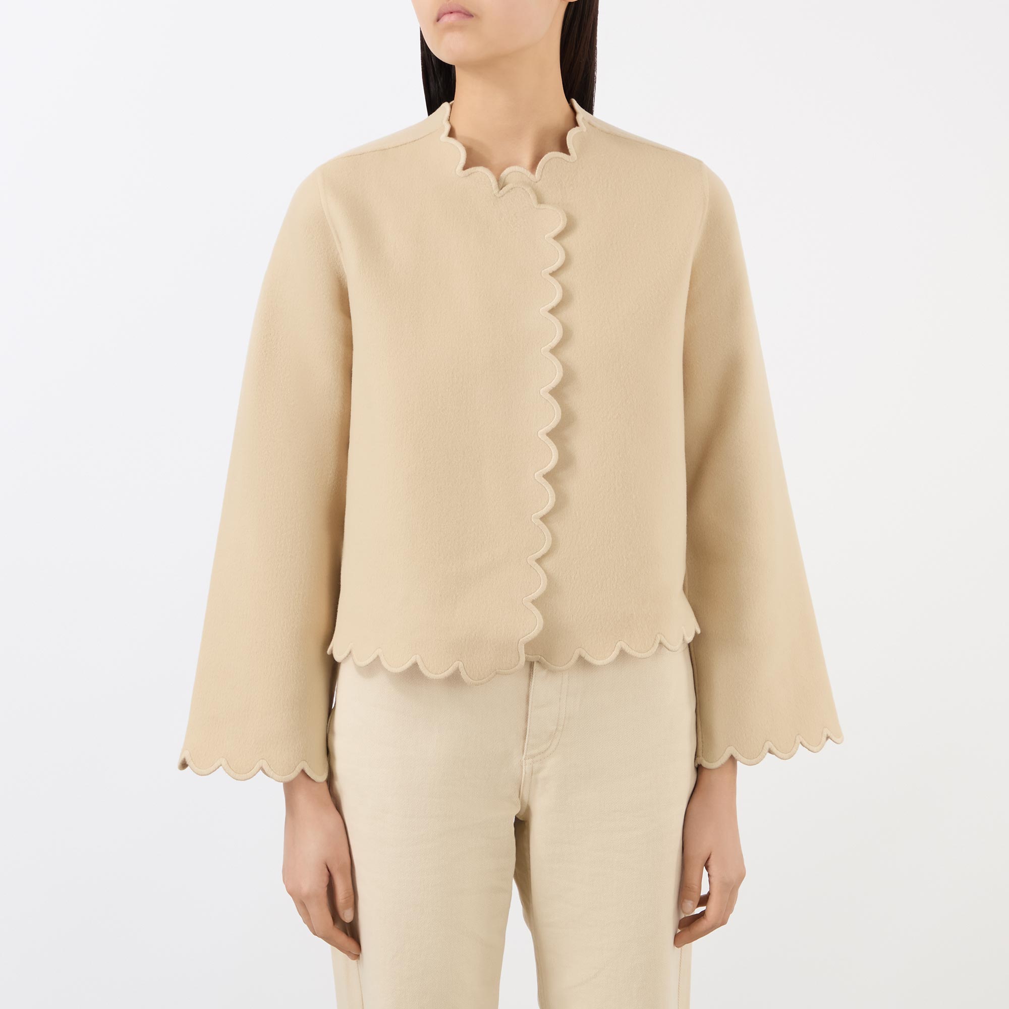 • Scalloped trims, long sleeves, open silhouette, unlined, double-faced wool