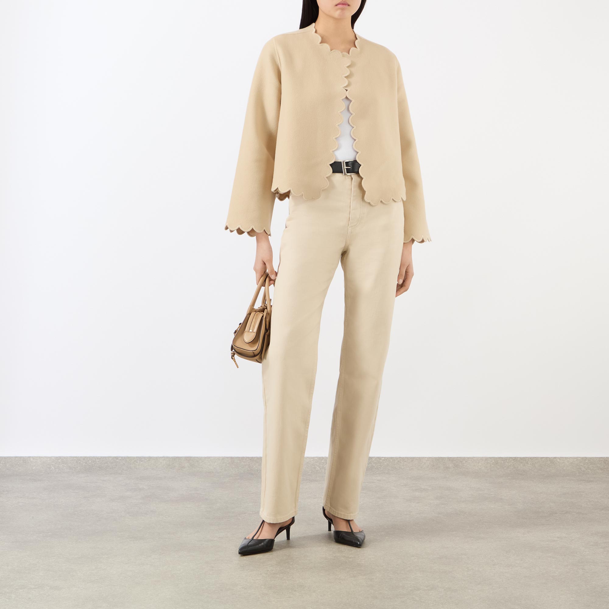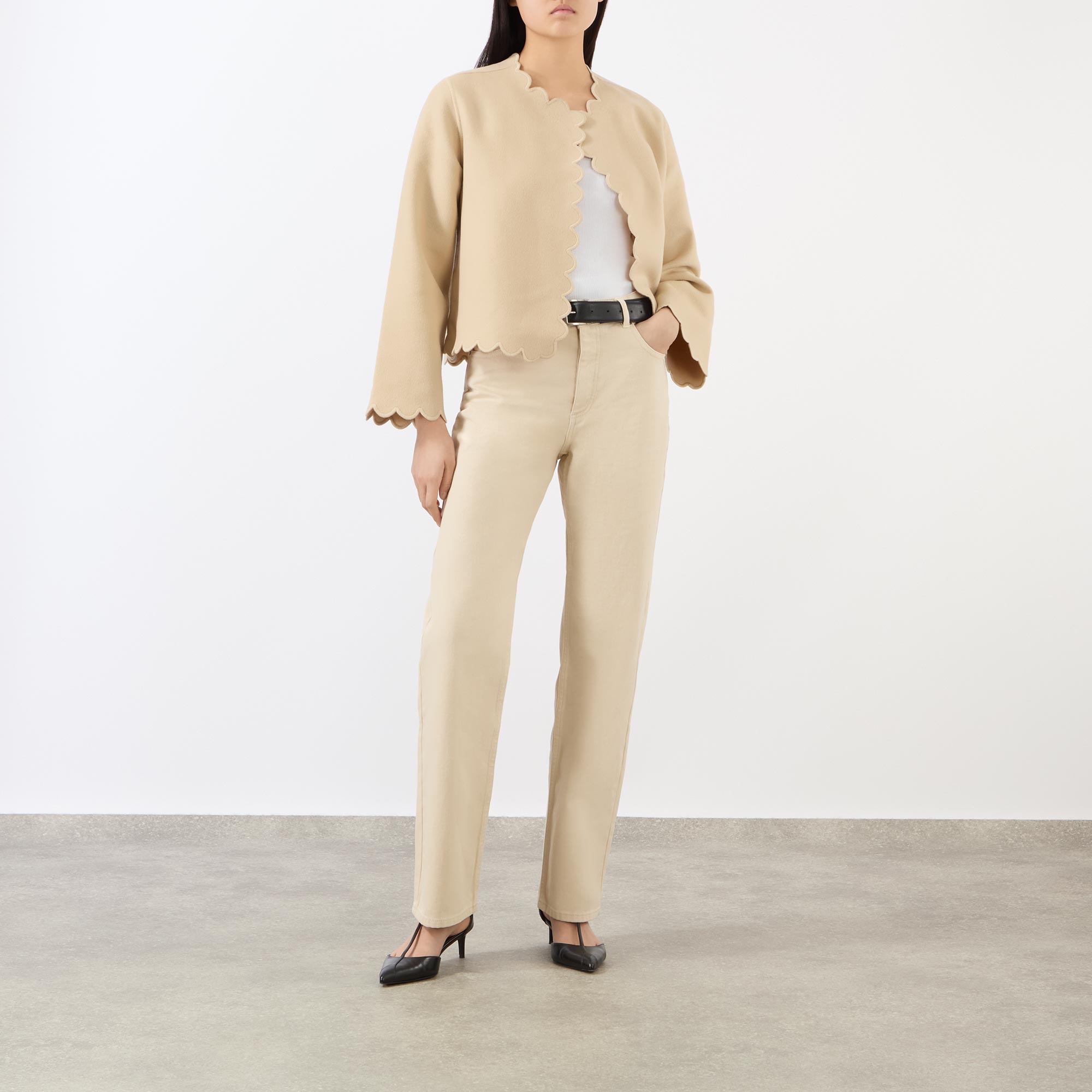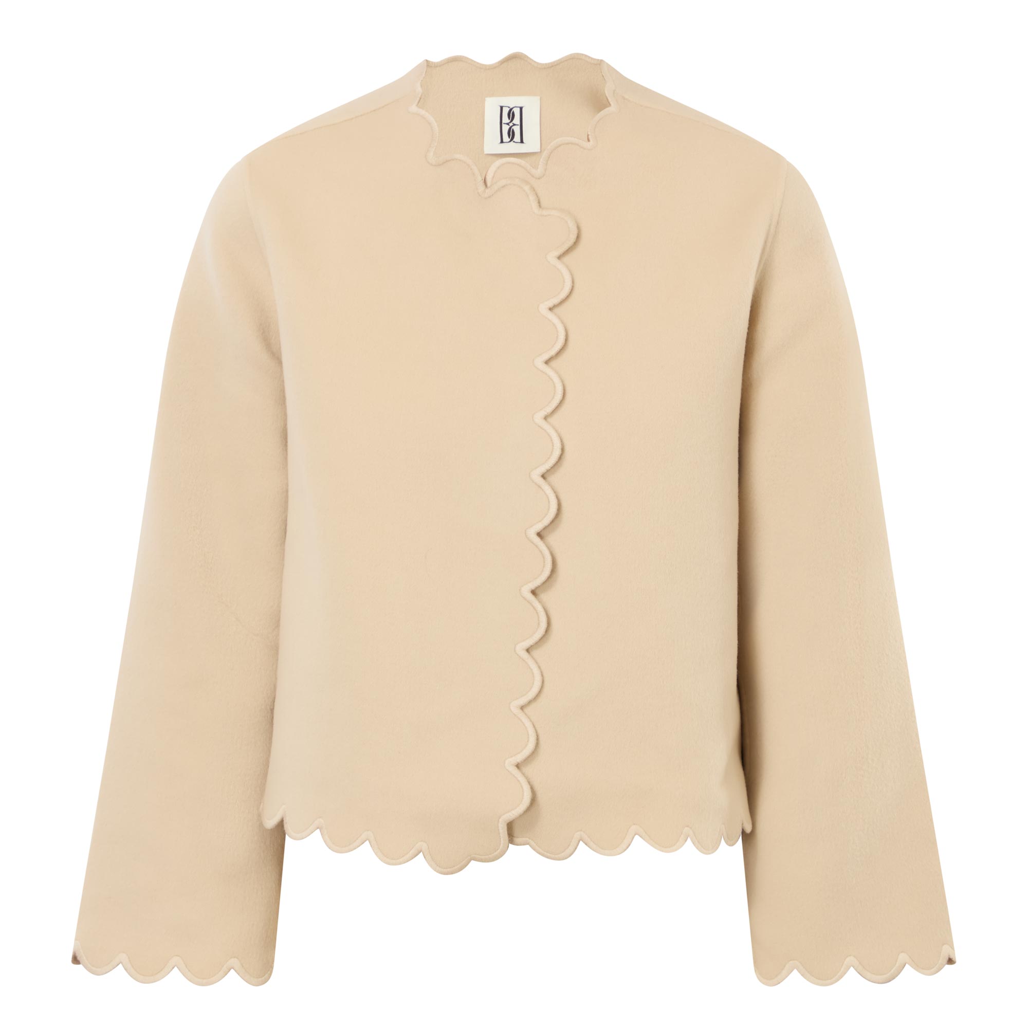 • Scalloped trims, long sleeves, open silhouette, unlined, double-faced wool