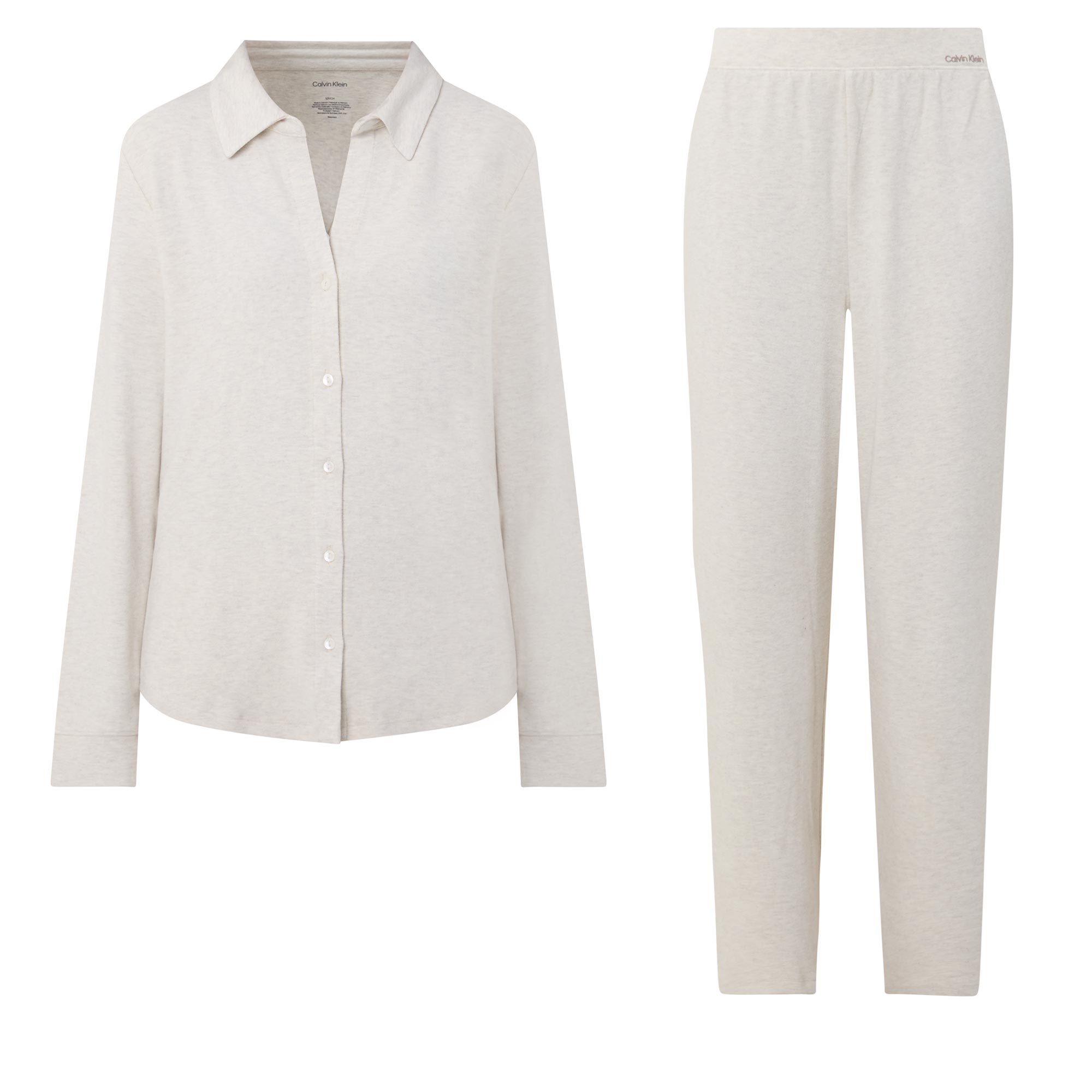 - Two-piece set, top with shirt collar, long sleeves, ribbed cuffs, front button fastening, curved hem, logo detail, mid rise pants, straight leg, elasticated waistband, clean hems, brushed jersey finish throughout