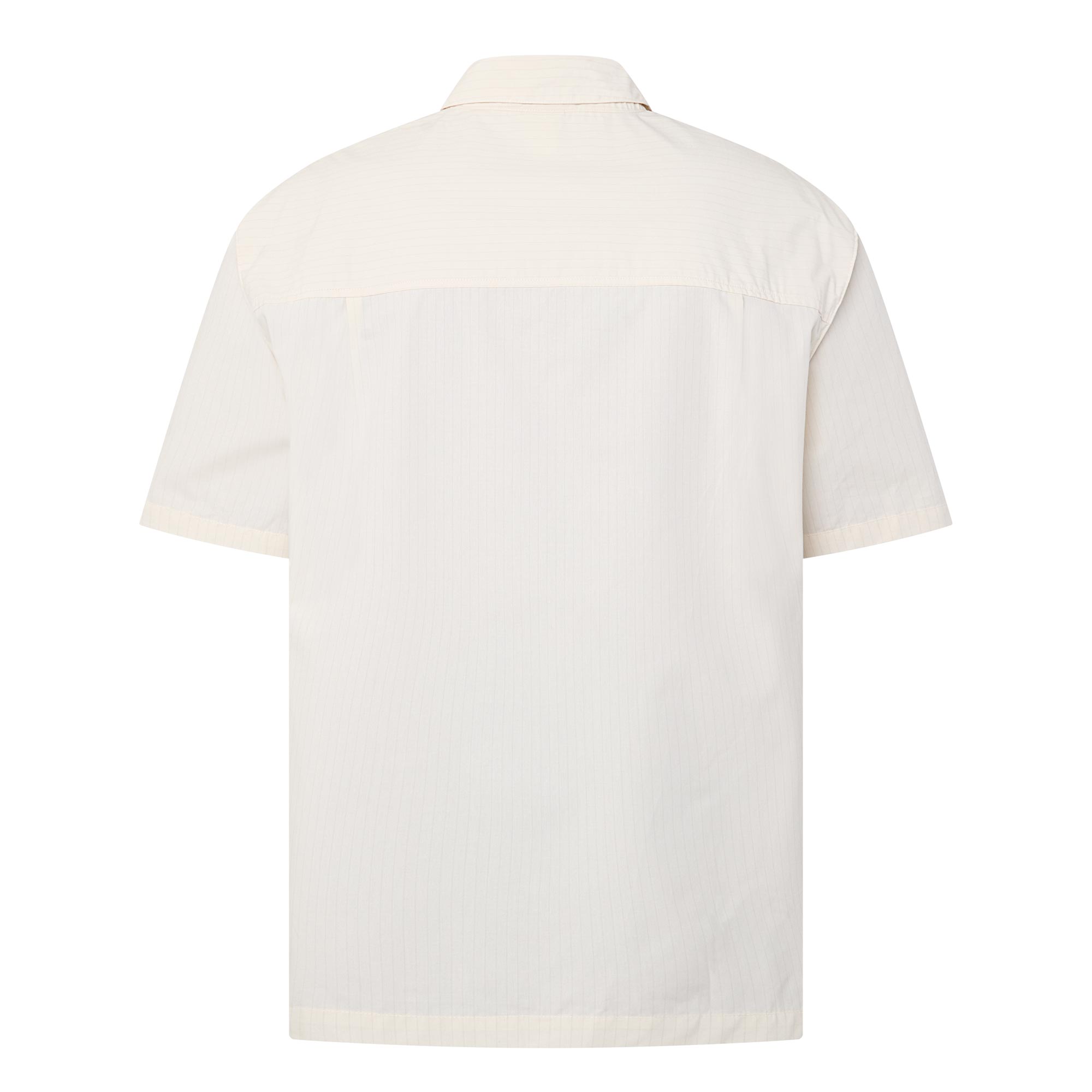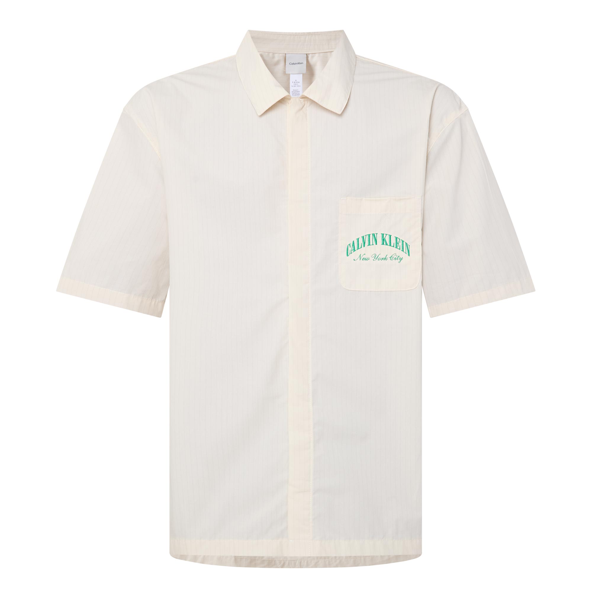 • Flat collar, concealed button fastening, short sleeves, chest patch pocket, embroidered crest logo, straight hemline