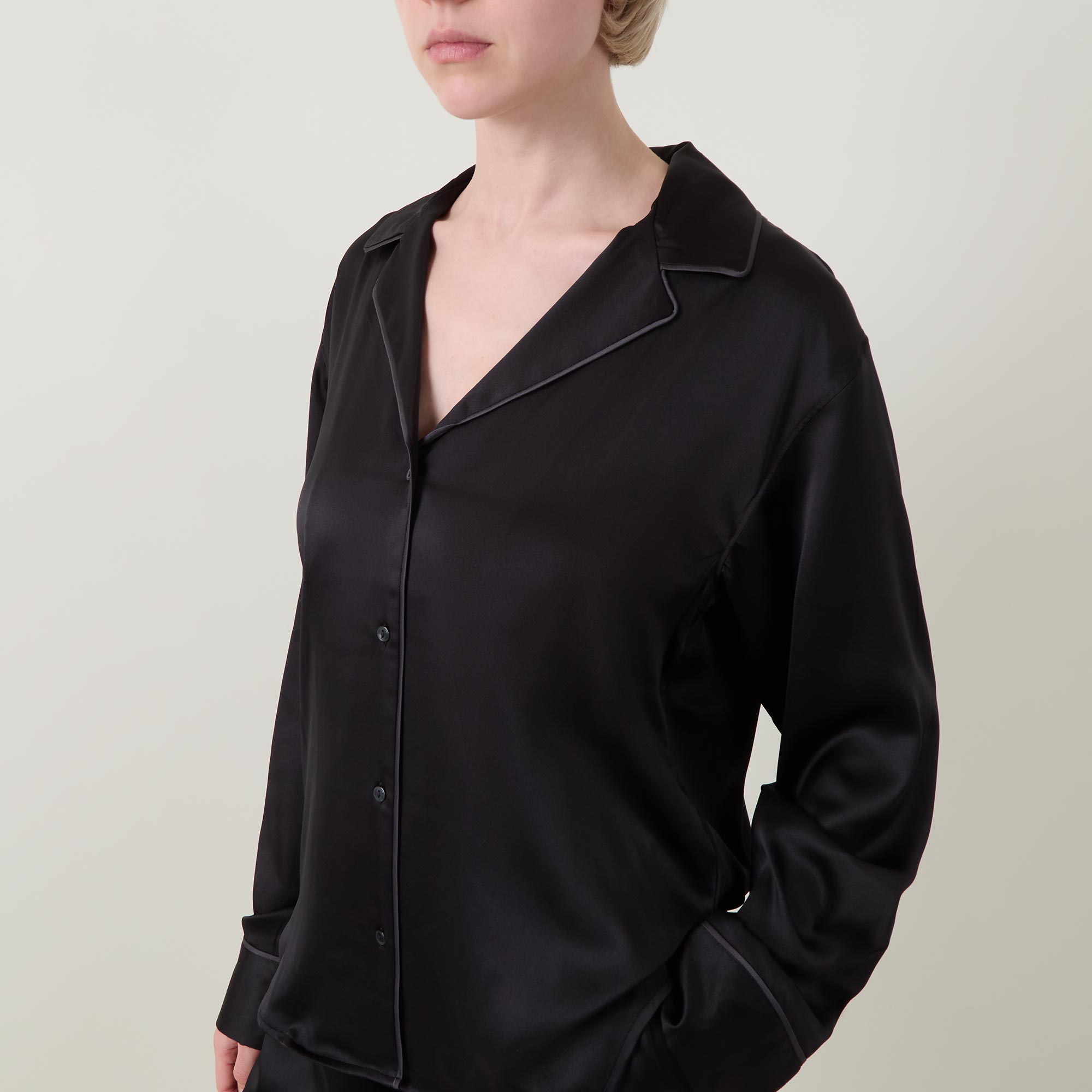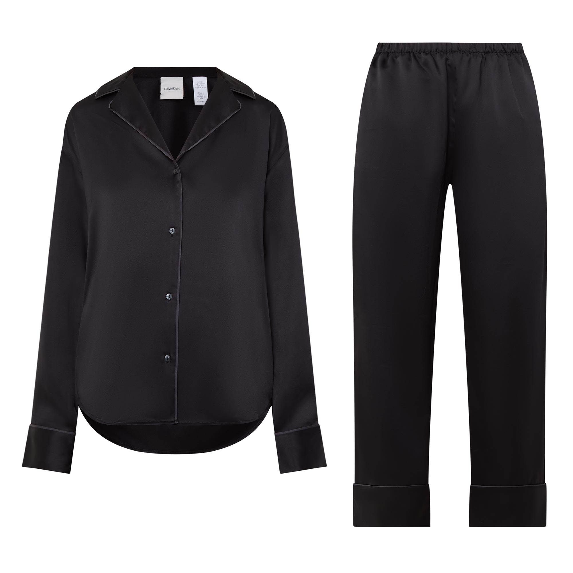 - Two-piece: Top: Notch lapel collar, dropped shoulders, long sleeves, front button fastening, curved hem, tonal piping, satin finish; Bottoms: Mid-rise, straight-leg, elasticated waistband, two side in seam pockets, clean hems, tonal piping, satin finish
