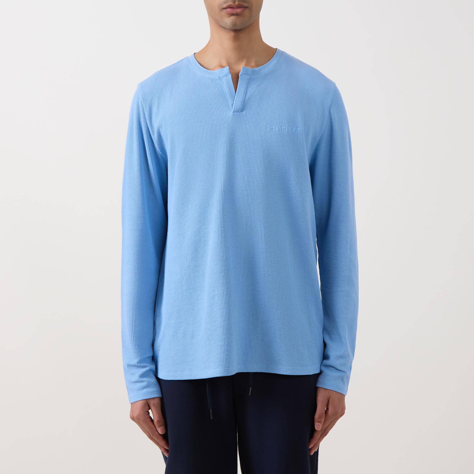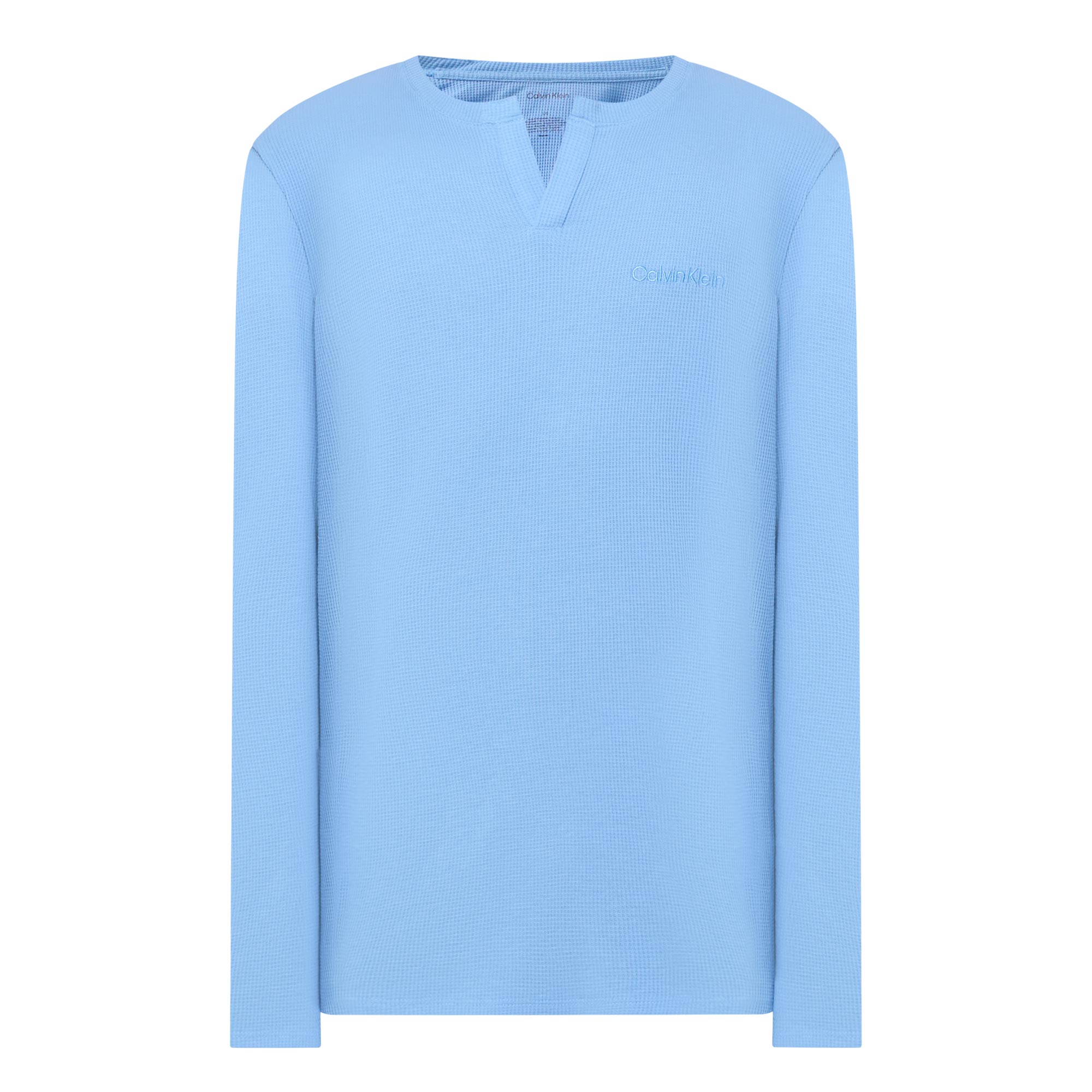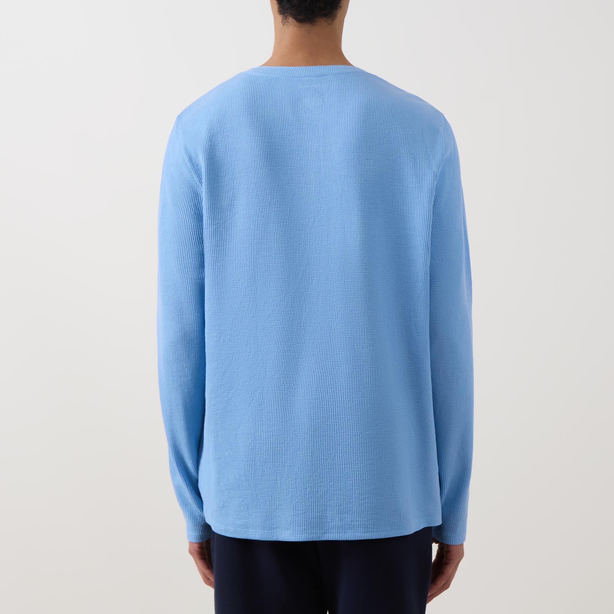 - Clean Henley neckline, long sleeves, straight hemline, waffle structure, embroidered logo detail, soft-touch feel