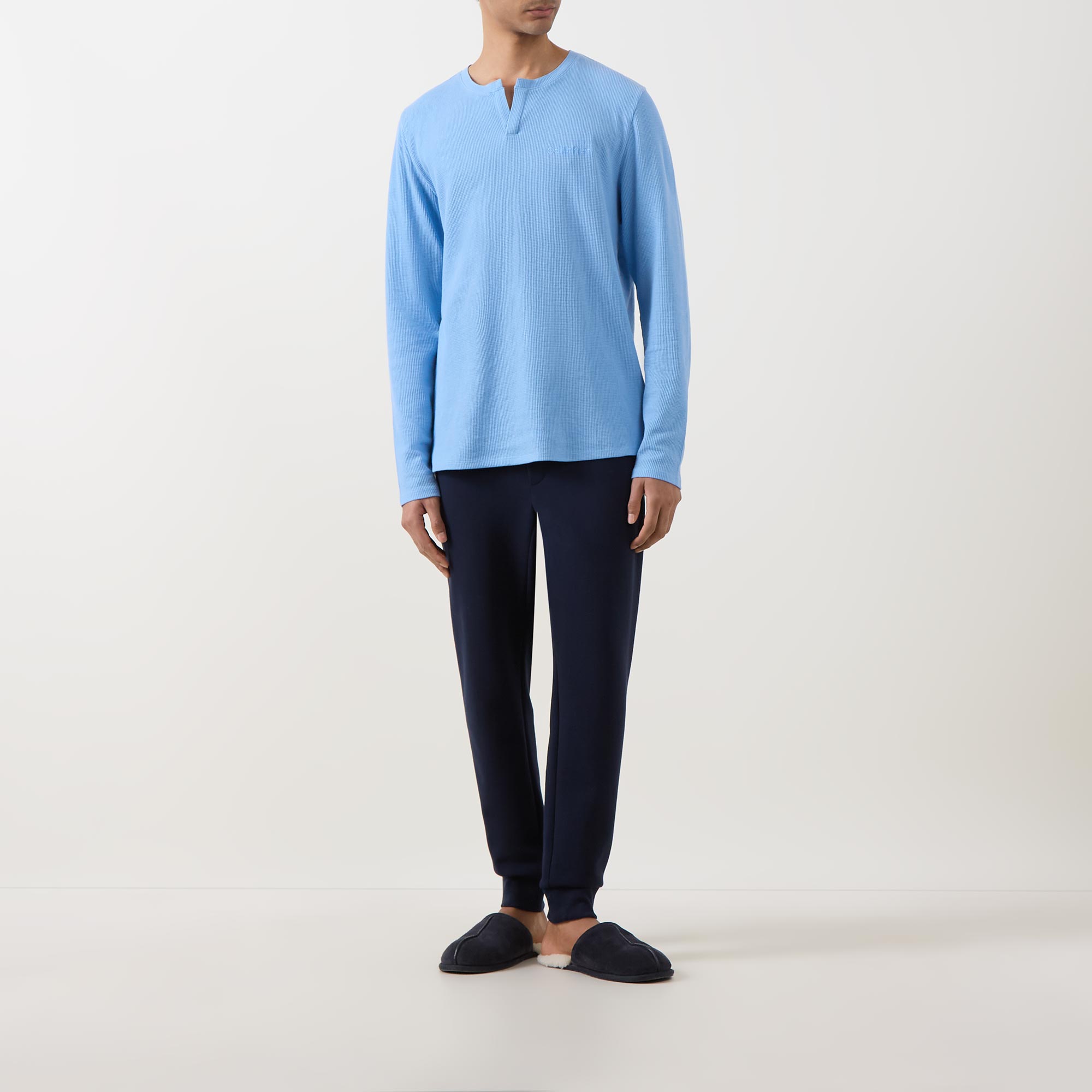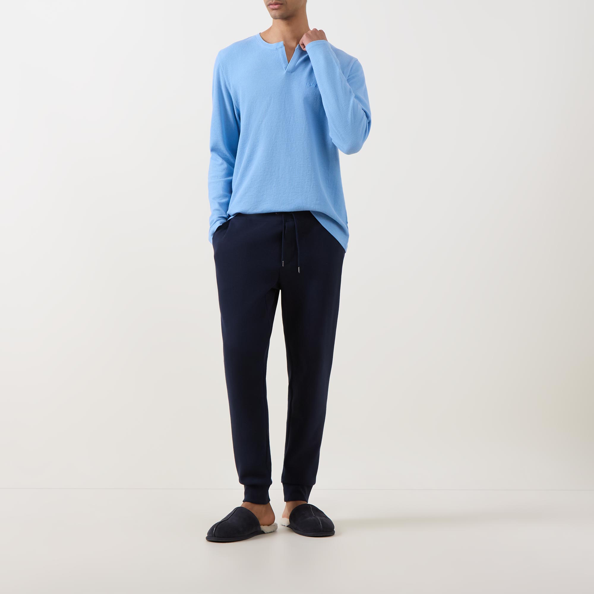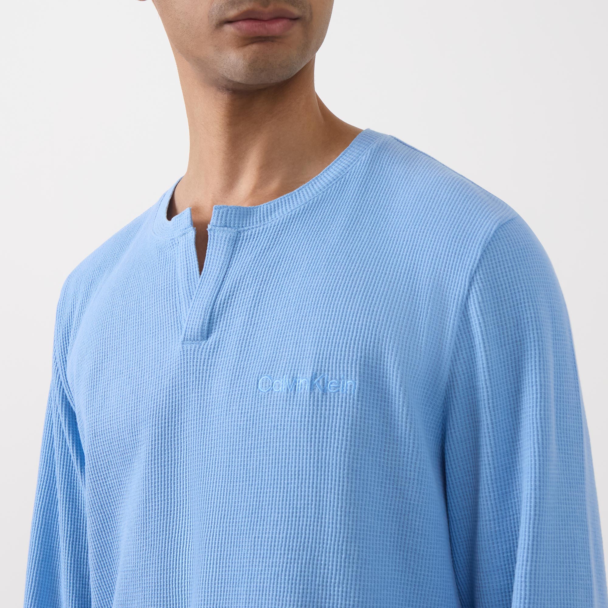 - Clean Henley neckline, long sleeves, straight hemline, waffle structure, embroidered logo detail, soft-touch feel