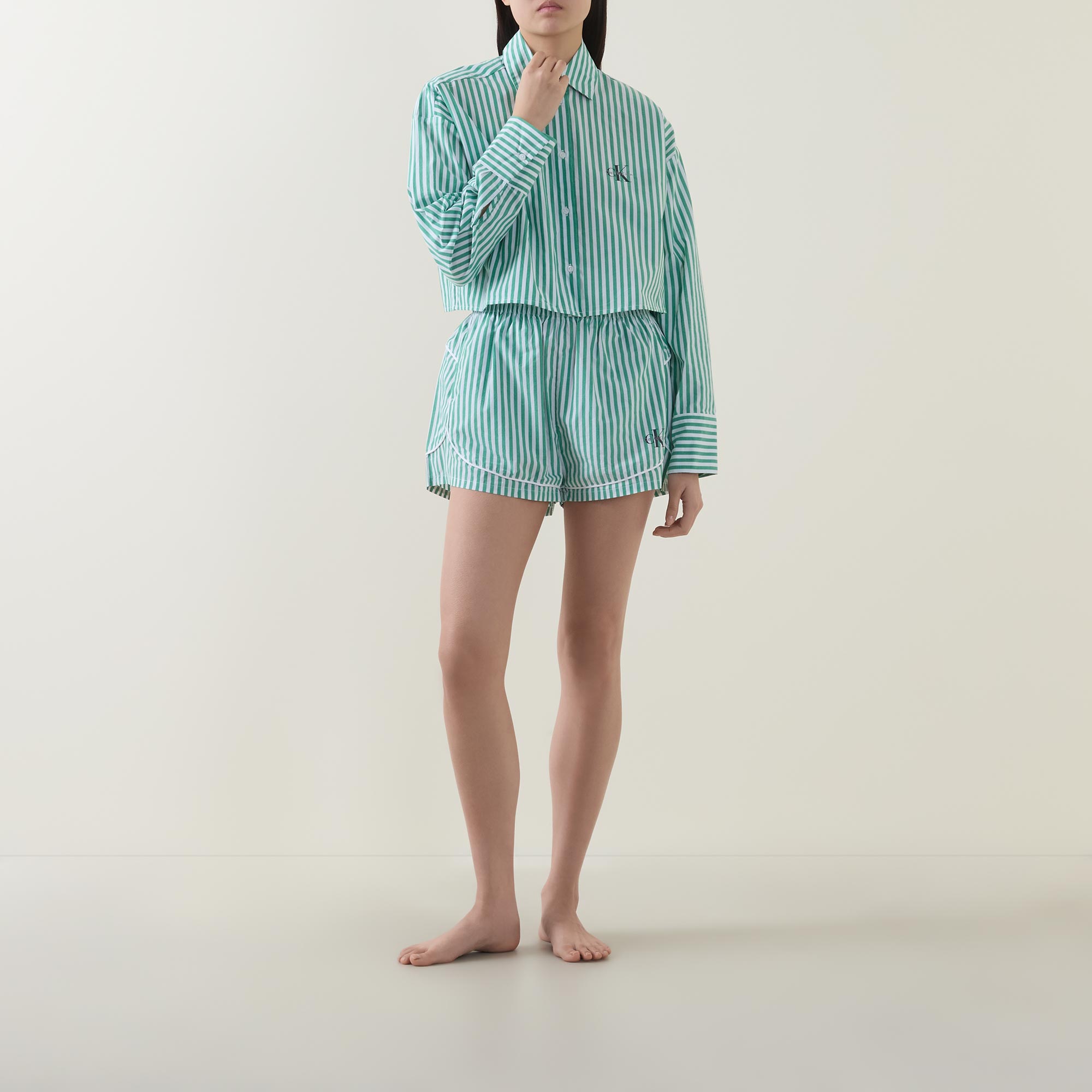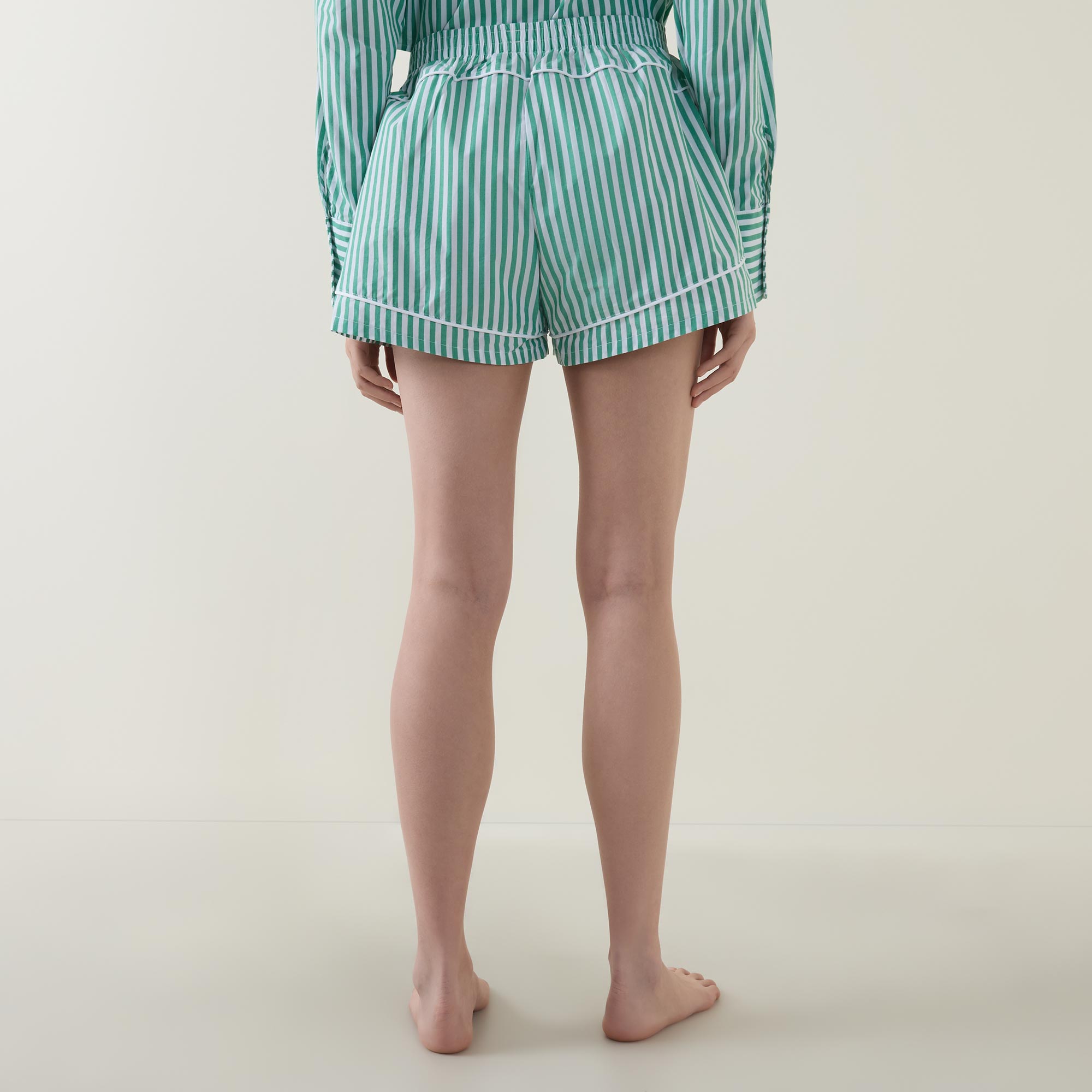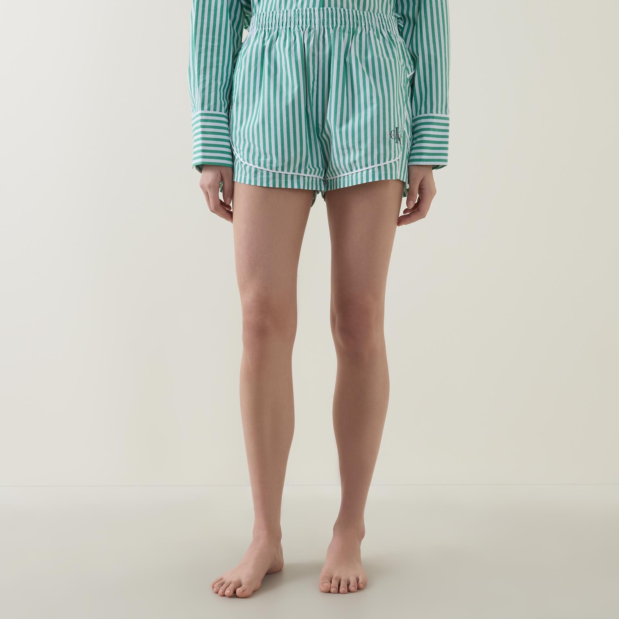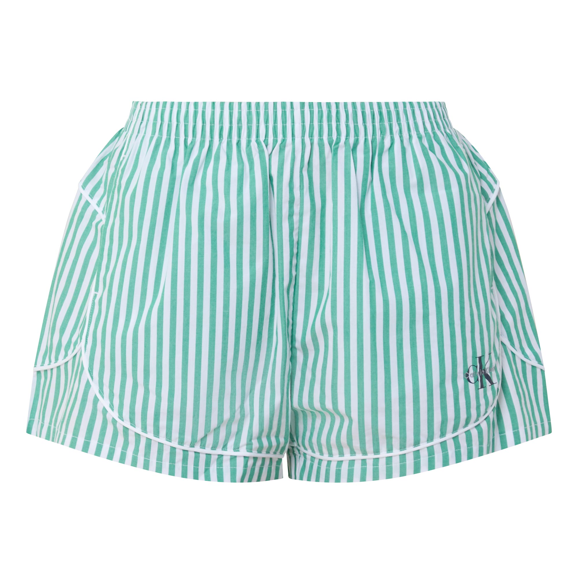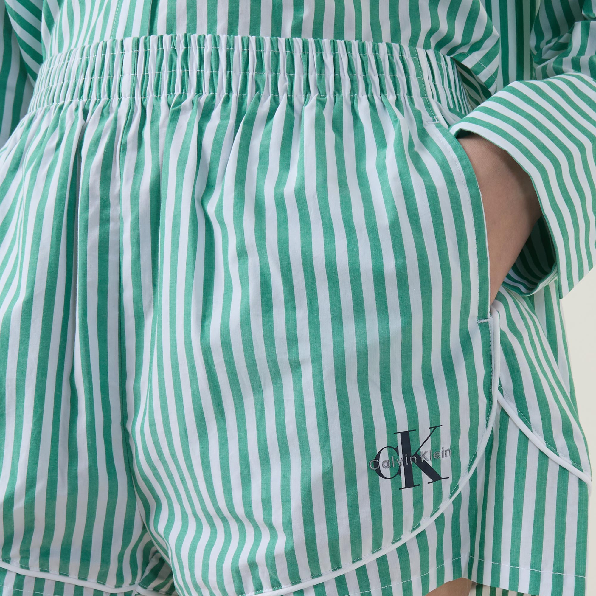 - Elasticated waistband, faux fly, side entry pockets, piping details, stripe pattern, embroidered monogram detail, crisp poplin fabric