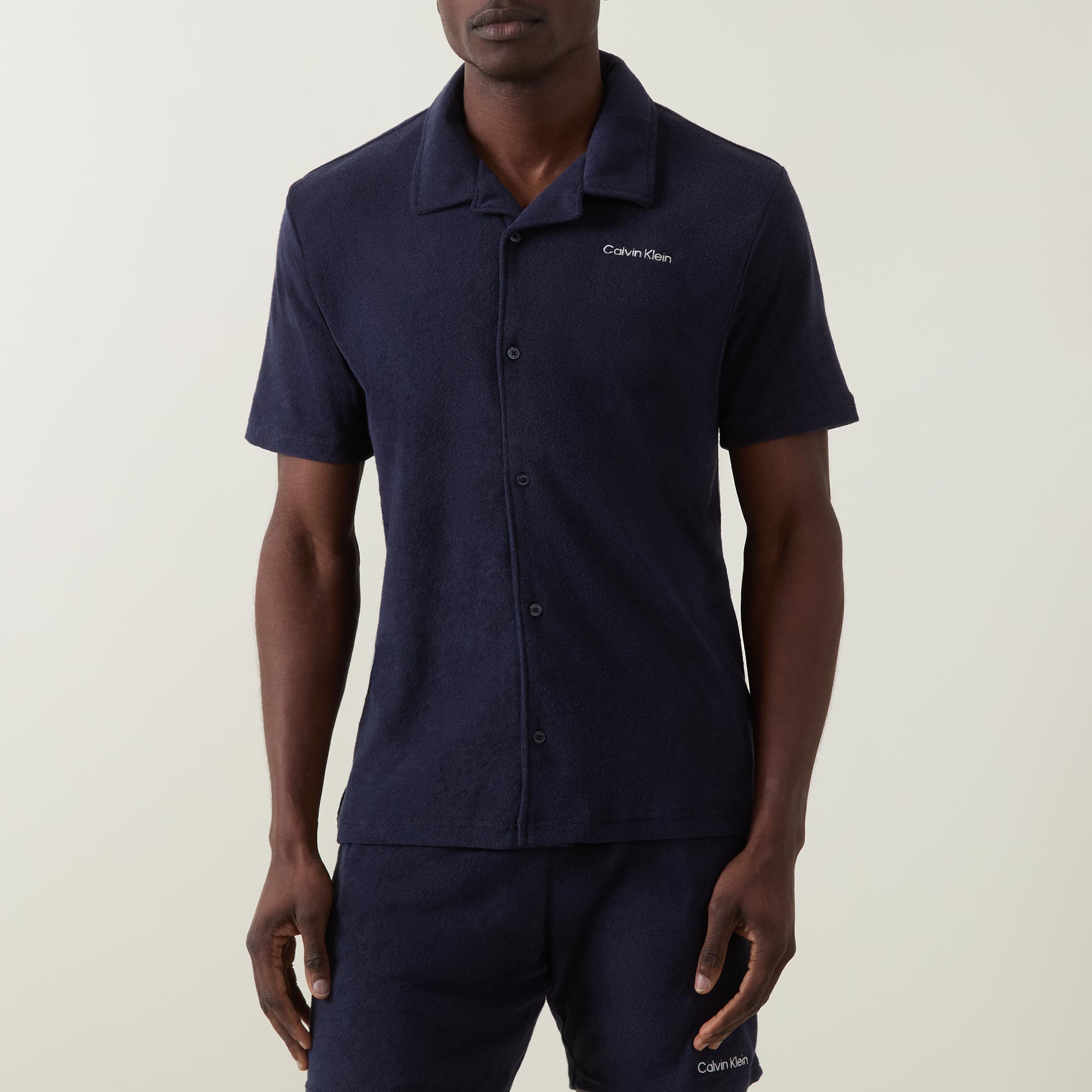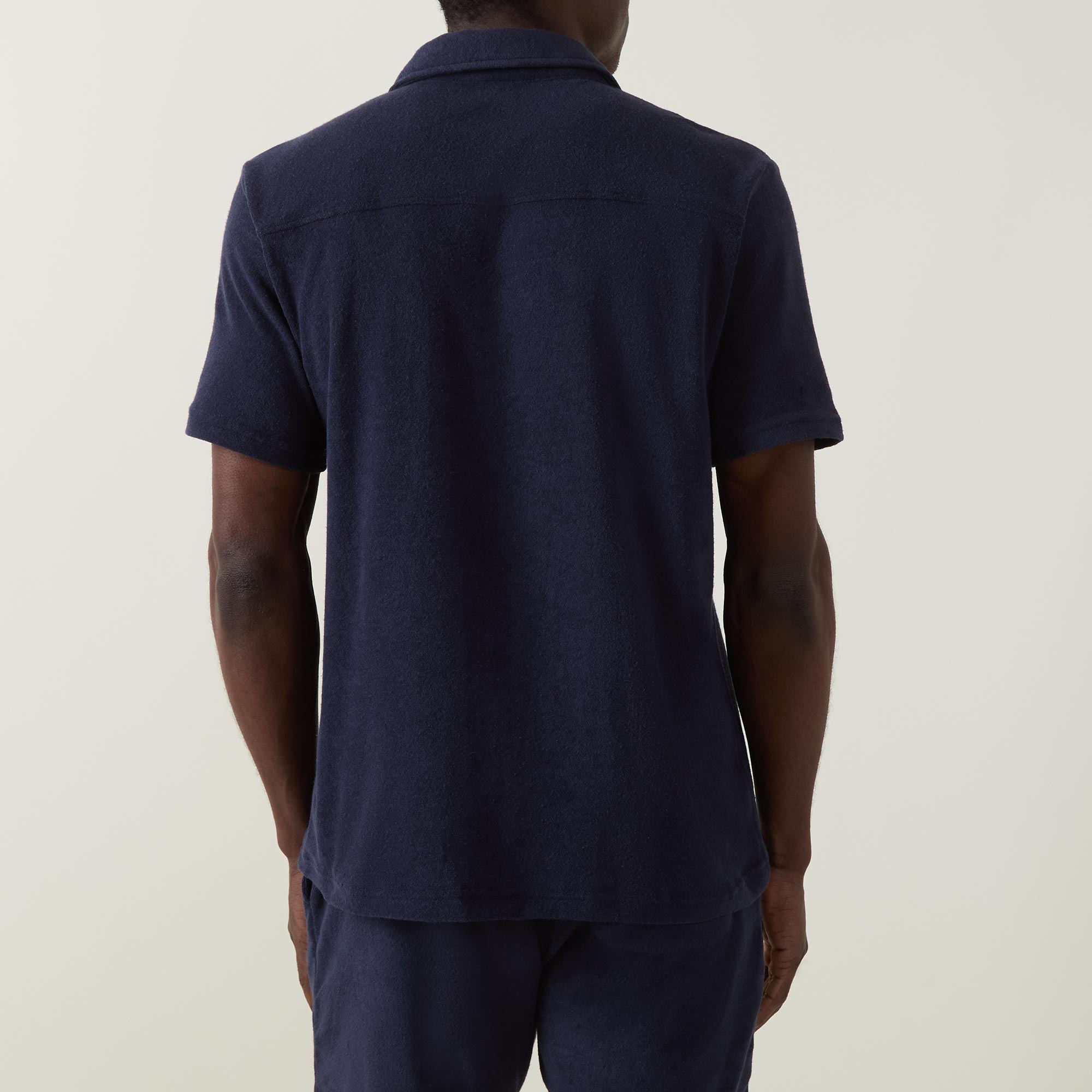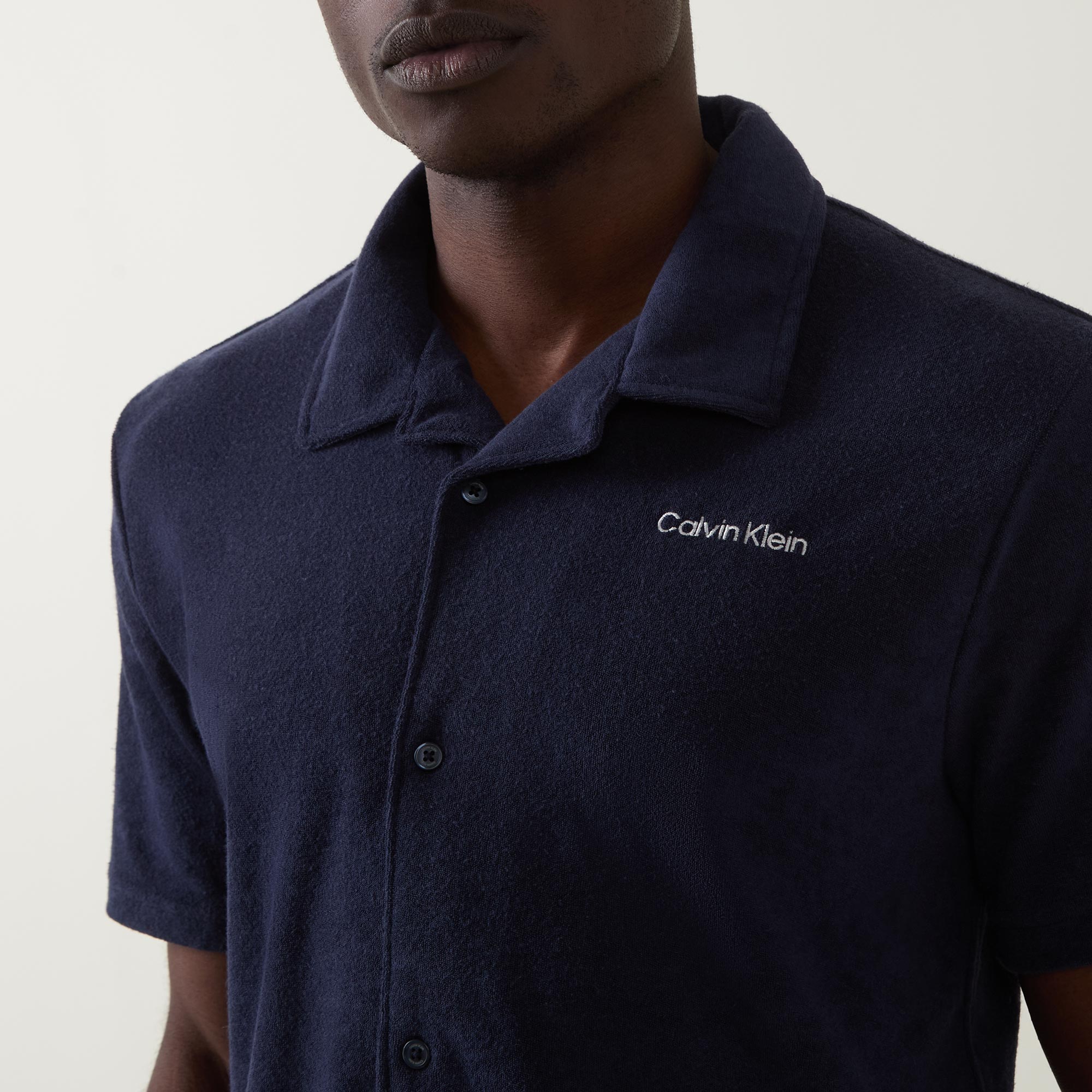 • Towelled fabric, button fastenings, short sleeves, spread pointed collar, embroidered logo, regular fit