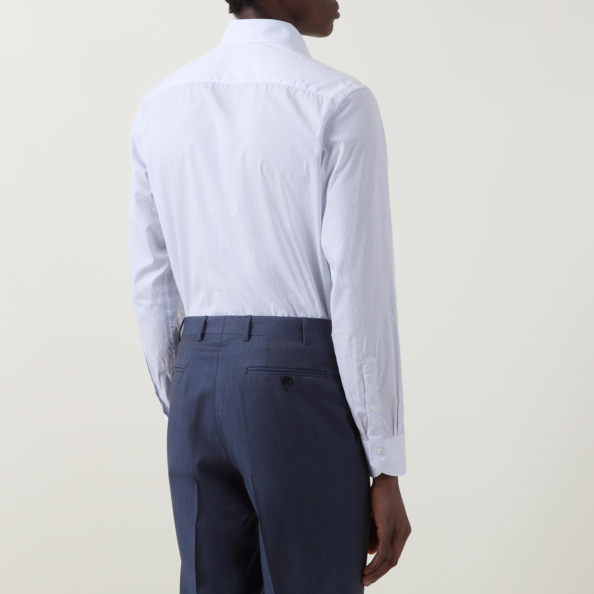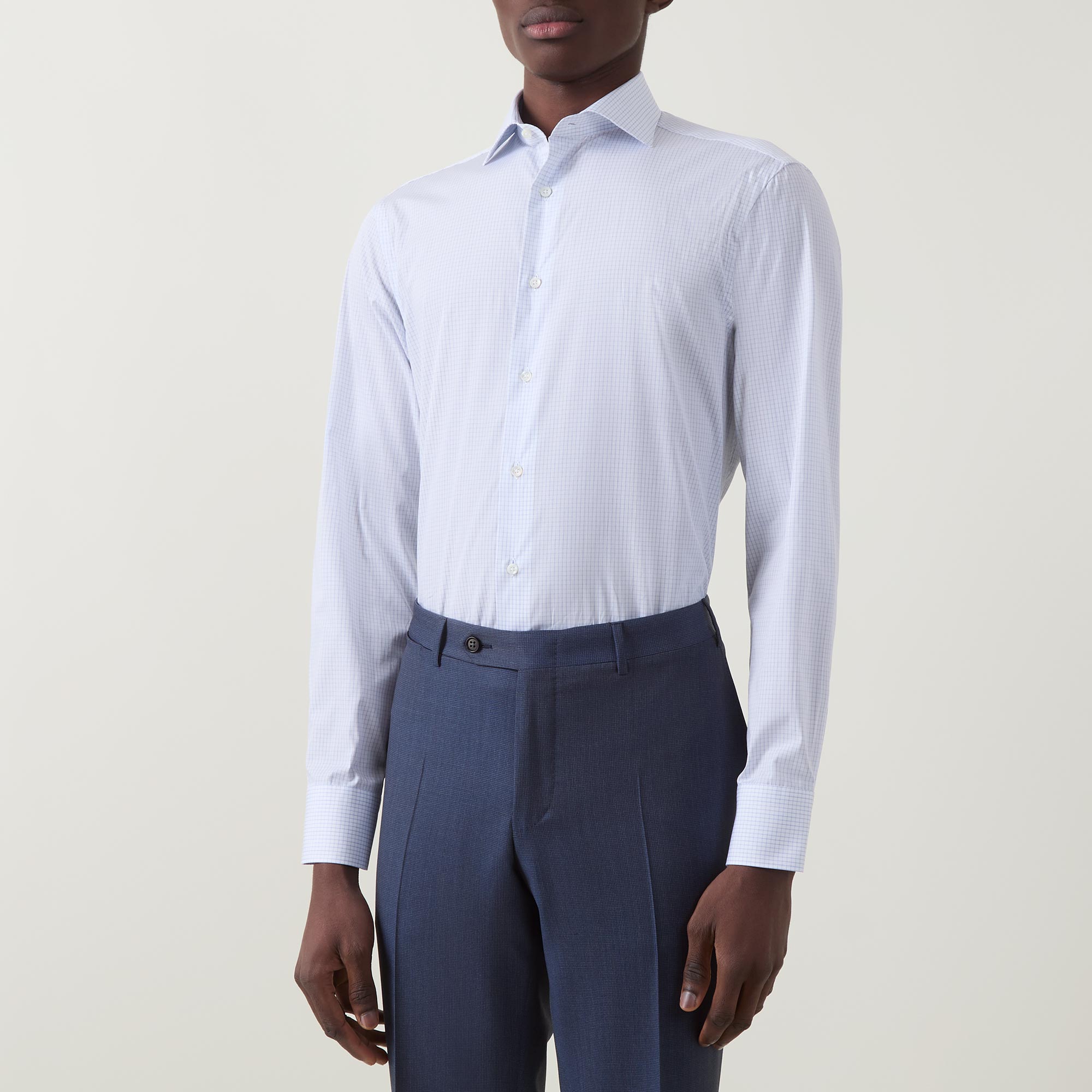• Cut-away collar, long sleeves, single-cuff, button fastening, curved hemline, check pattern