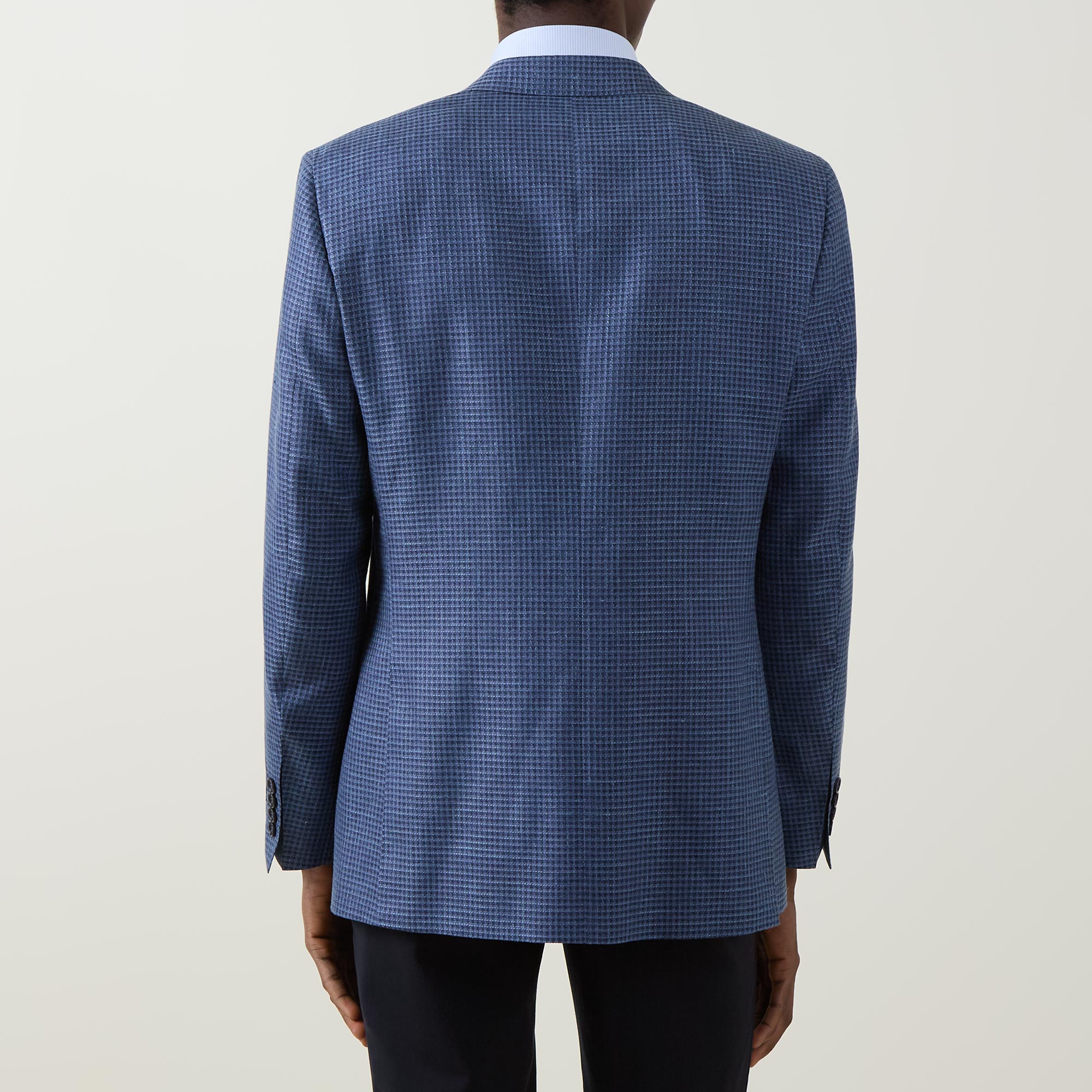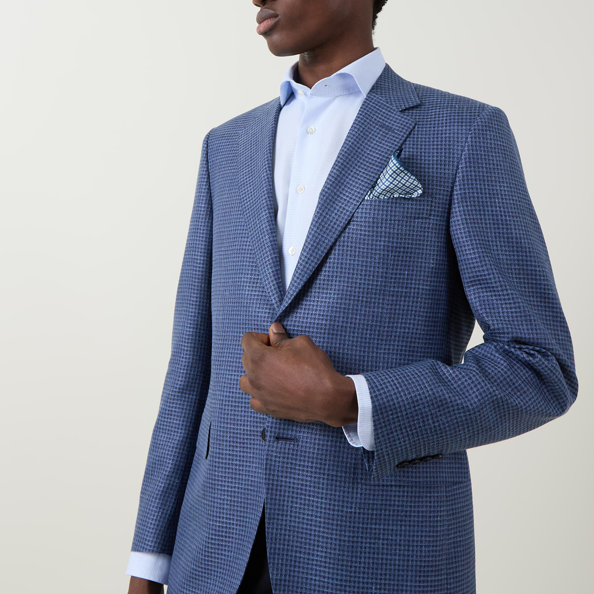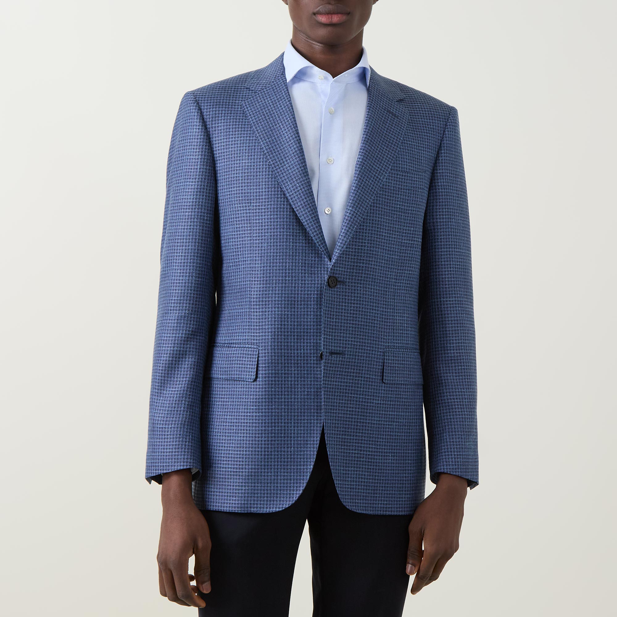 - Single-breasted, button fastening, notched lapels, chest pocket, long sleeves, buttoned cuffs, flap pockets, textured finish, check pattern