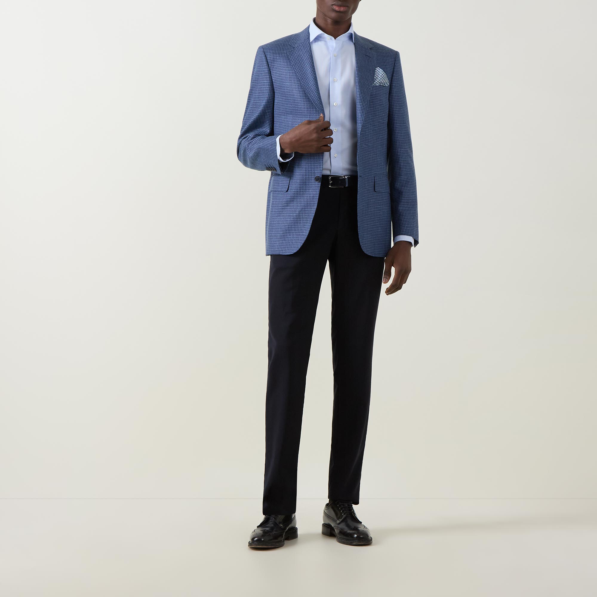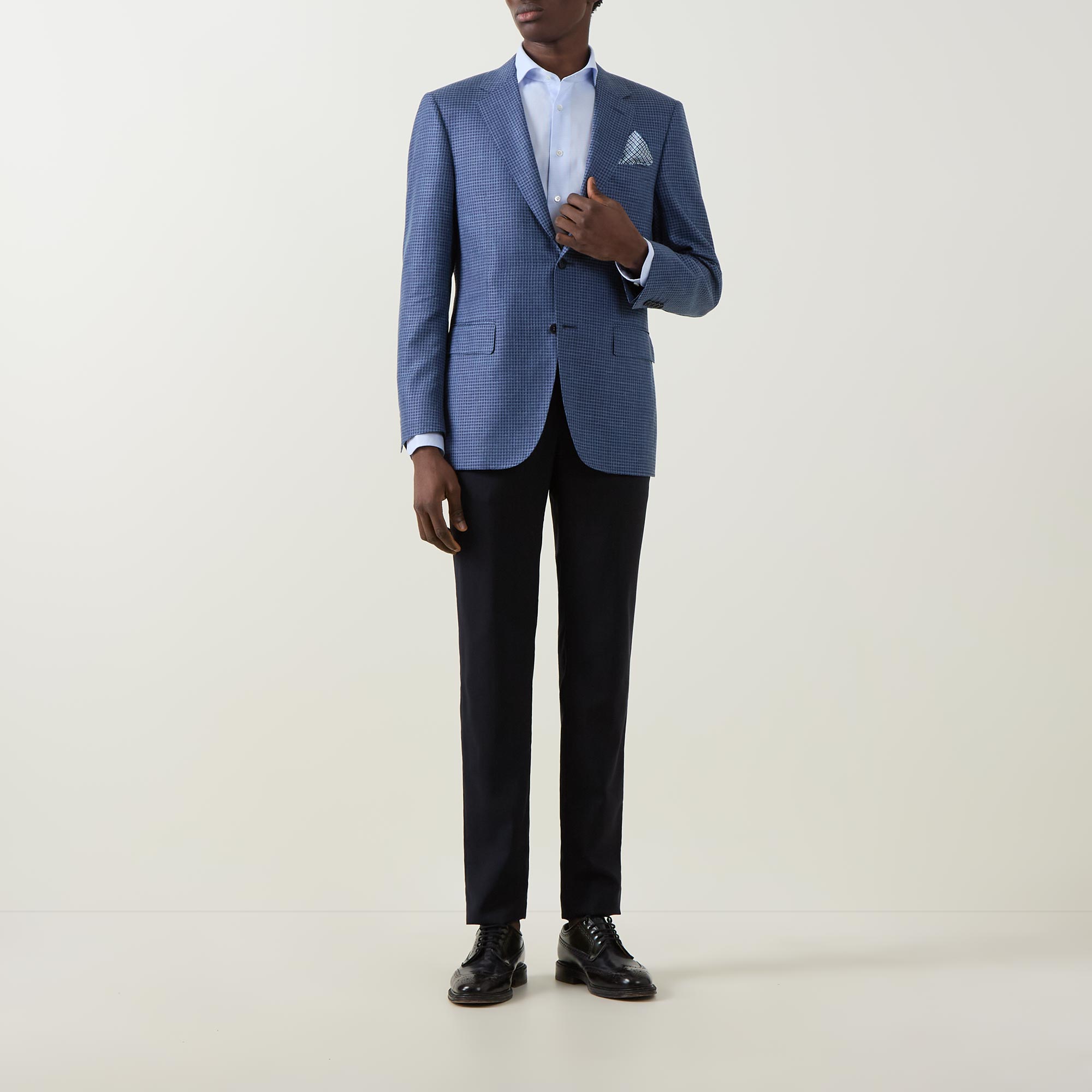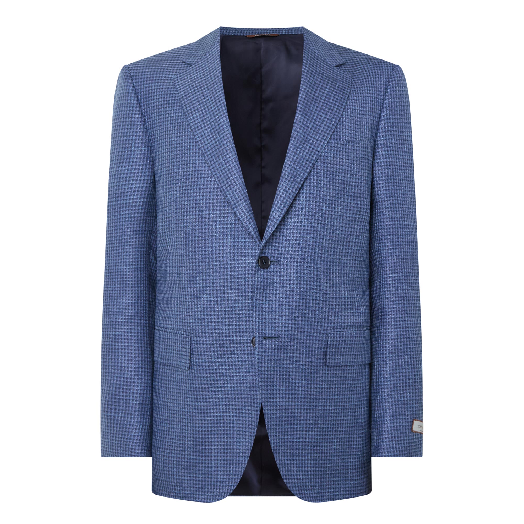 - Single-breasted, button fastening, notched lapels, chest pocket, long sleeves, buttoned cuffs, flap pockets, textured finish, check pattern