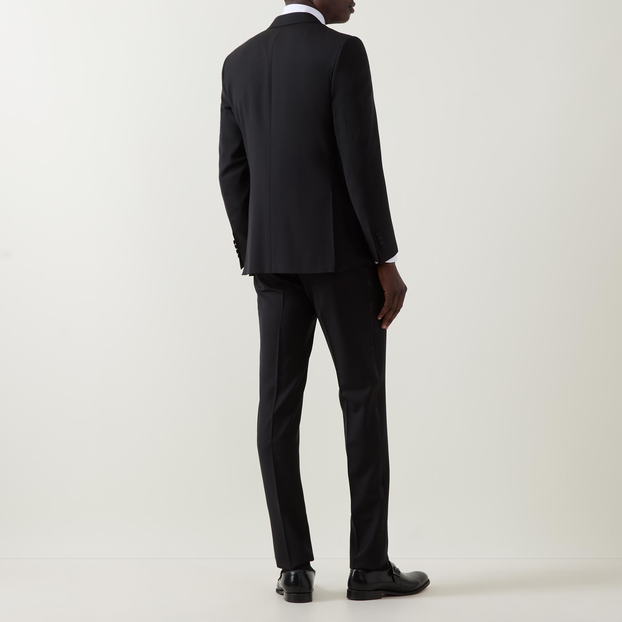 • Two-piece: Jacket: Single-breasted, peak lapel collar, long sleeves, buttoned cuffs, front button fastening, one chest welt pocket, two jetted flap pockets, vented, subtle sheen finish. Trousers: Mid-rise, slim leg, belt loops, concealed fly with hook-and-bar fastening, two side entry pockets, rear jetted pockets with button fastenings, tonal satin stripe along each leg, clean hems, pressed creases, subtle sheen finish