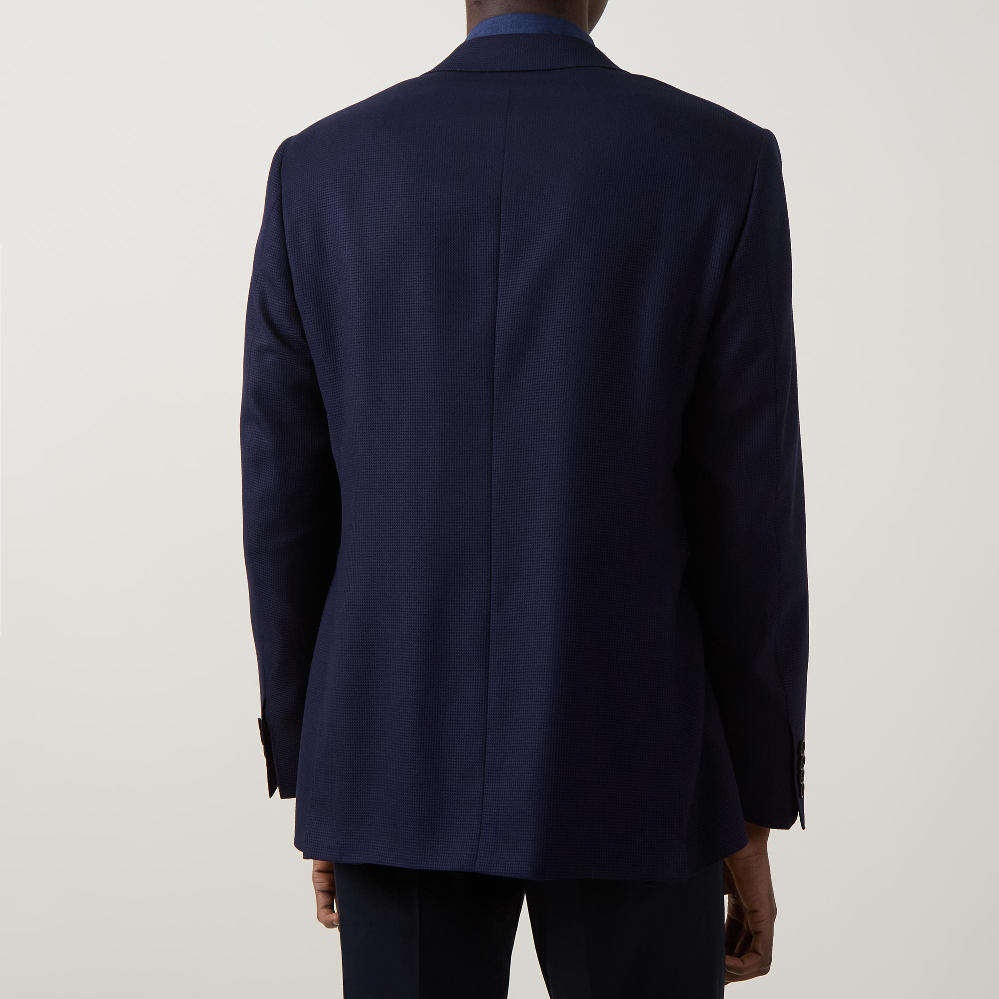 - Single breasted, notch lapel collar, long sleeves, buttoned cuffs, front button fastening, one chest welt pocket, two hip flap pockets, curved front hem, rear vents, textured look, lined